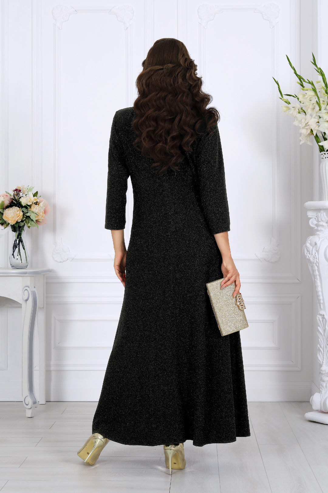 Элегантное вечернее платье из люрекса — создано для особенных событий. Изысканное длинное платье, которое подчеркивает женственность и утонченность. Выполнено из благородного трикотажного полотна с мерцающим люрексом — ткань мягко драпируется, не сковывает движения и эффектно играет при каждом шаге. Асимметричный перед с запахом и деликатными драпировками визуально стройнит и формирует правильный силуэт для женщин с формами. Глубокий разрез добавляет образу легкой смелости, оставаясь элегантным и уместным на торжественных мероприятиях. Платье женское, расширенное к низу, выполнено из трикотажного полотна с фактурной лицевой стороной «люрекс». Модель на трикотажной подкладке, с плечевыми накладками. Перед платья асимметричный, состоит из двух деталей, скрепленных на запах. На левой детали переда обработан рельефный шов с разрезом по низу. Правая деталь переда задрапирована сборкой и входит в рельеф на участке между двумя горизонтальными подрезами боковой части переда. На спинке обработаны талиевые вытачки и средний шов с застежкой на потайную тесьму-«молнию» (50 см). Рукав трехчетвертной. Длина платья – 137 см. Длина рукава – 47 см