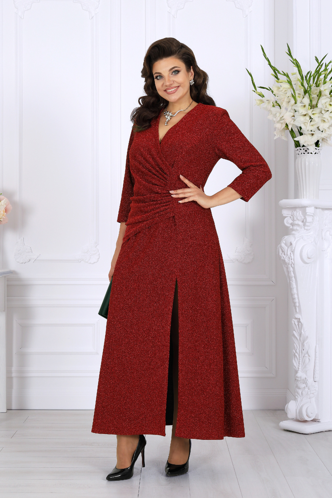 Элегантное вечернее платье из люрекса — создано для особенных событий. Изысканное длинное платье, которое подчеркивает женственность и утонченность. Выполнено из благородного трикотажного полотна с мерцающим люрексом — ткань мягко драпируется, не сковывает движения и эффектно играет при каждом шаге. Асимметричный перед с запахом и деликатными драпировками визуально стройнит и формирует правильный силуэт для женщин с формами. Глубокий разрез добавляет образу легкой смелости, оставаясь элегантным и уместным на торжественных мероприятиях. Платье женское, расширенное к низу, выполнено из трикотажного полотна с фактурной лицевой стороной «люрекс». Модель на трикотажной подкладке, с плечевыми накладками. Перед платья асимметричный, состоит из двух деталей, скрепленных на запах. На левой детали переда обработан рельефный шов с разрезом по низу. Правая деталь переда задрапирована сборкой и входит в рельеф на участке между двумя горизонтальными подрезами боковой части переда. На спинке обработаны талиевые вытачки и средний шов с застежкой на потайную тесьму-«молнию» (50 см). Рукав трехчетвертной. Длина платья – 137 см. Длина рукава – 47 см