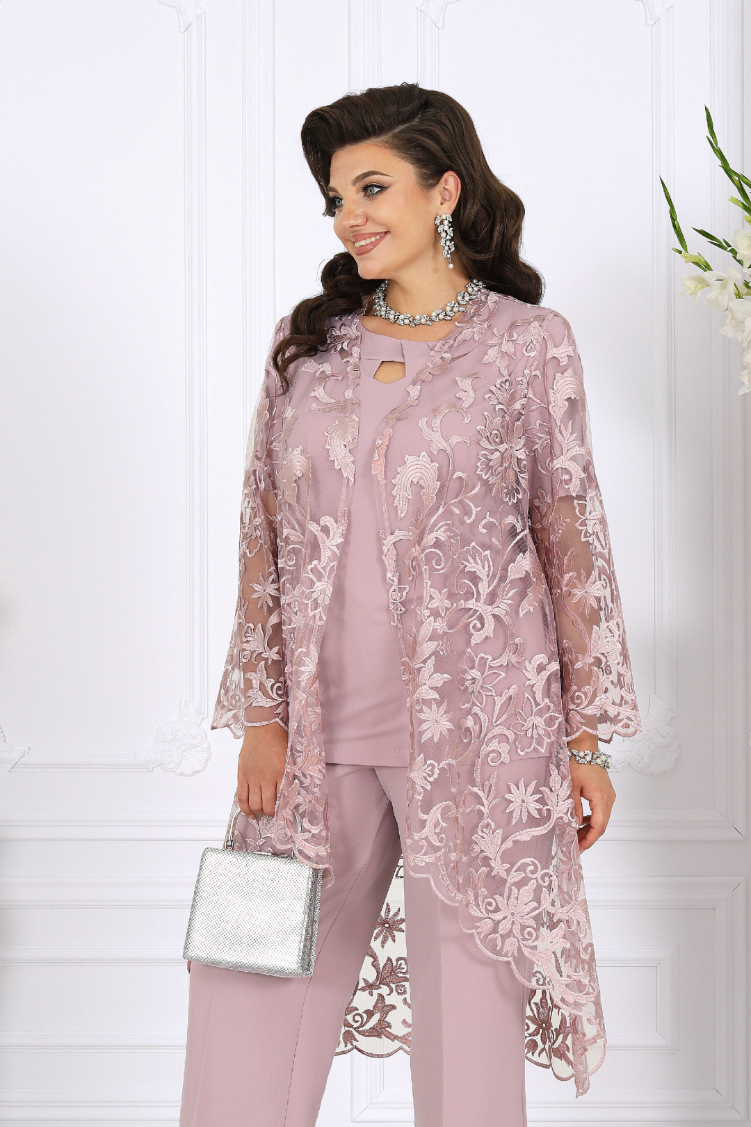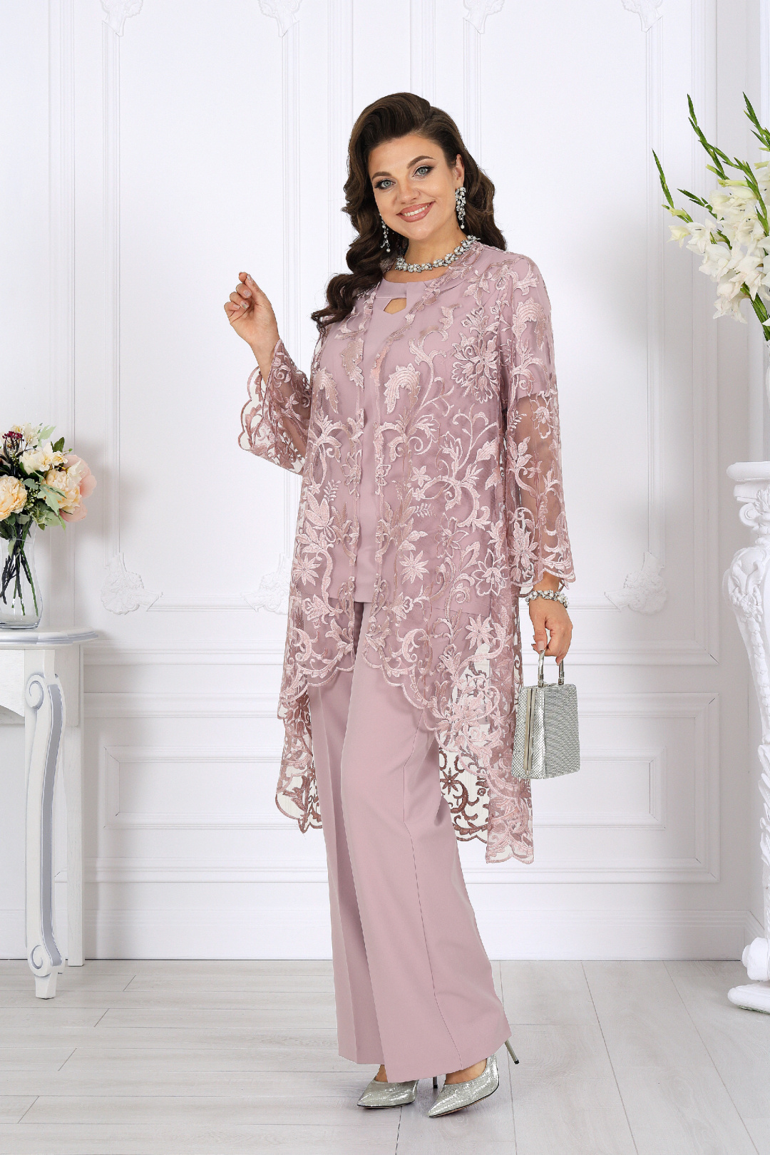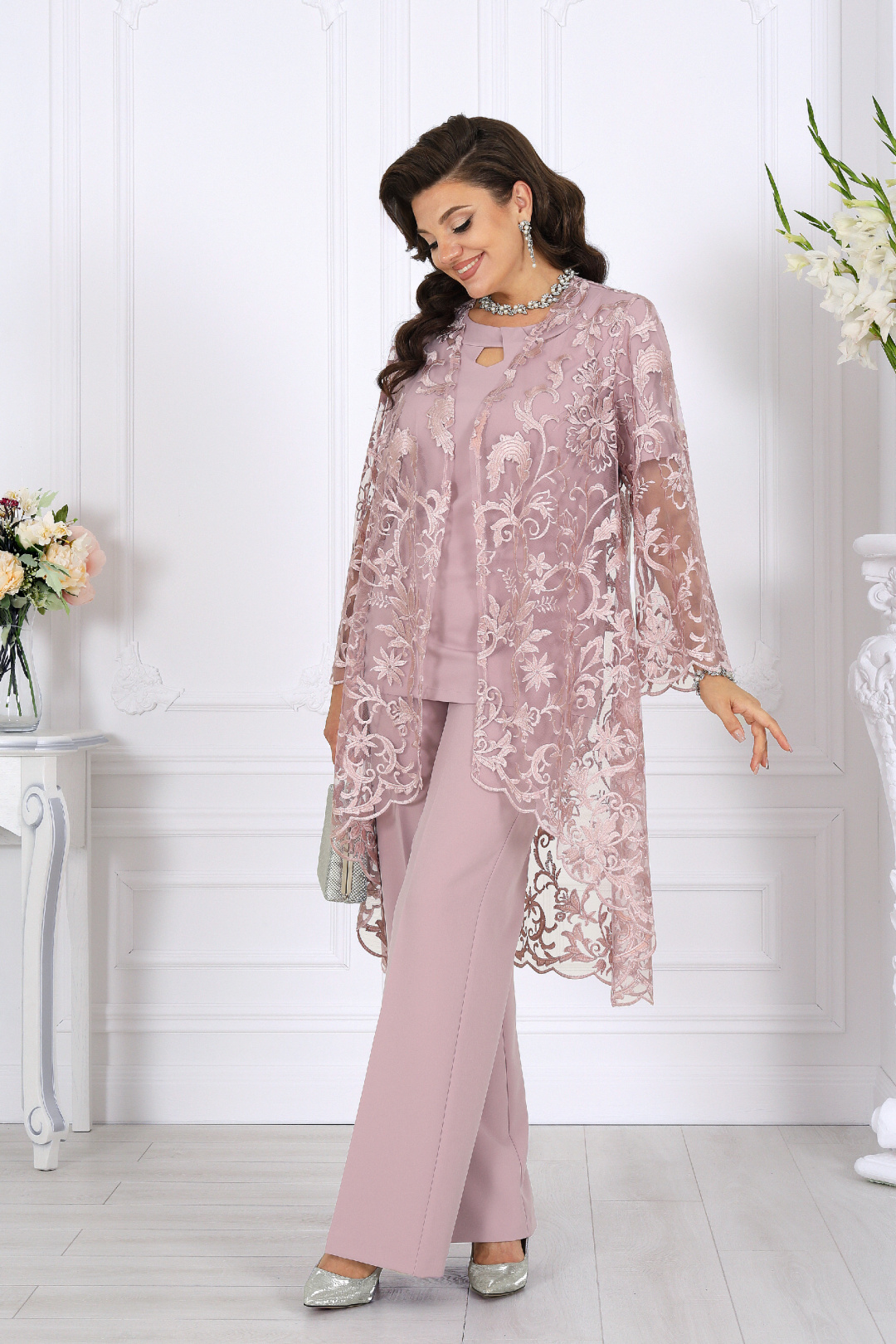 Роскошный и в то же время практичный костюм-тройка создан для женщин, которые ценят комфорт, безупречный крой и изысканный стиль. Он идеально подойдёт для торжественных мероприятий, свадеб, деловых приёмов, корпоративных вечеров и любых событий, где хочется выглядеть эффектно и уверенно. Воздушный гипюровый кардиган прямого силуэта с удлинённой спинкой и фигурными фестонами по краю создаёт лёгкость и утончённость образа. Полуприлегающая блузка из эластичного трикотажа «масло» мягко повторяет линии фигуры, не сковывая движения. Классические прямые брюки из костюмно-плательной ткани со стрелками визуально вытягивают силуэт, формируя изящные пропорции и обеспечивая комфорт в течение всего дня. Такой костюм подчеркнёт вкус и статус своей обладательницы, оставаясь универсальным решением для множества событий — от официальных встреч до праздничных торжеств. Комплект брючный 3-х предметный, состоящий из кардигана, блузки и брюк. Кардиган прямого силуэта, выполнен из гипюра. Модель без застежки, без подкладки и плечевых накладок. Низ кардигана удлинен по спинке. Рукав втачной, длинный. Низ изделия и низ рукава оформлены фестонами. Длина кардигана – 109 см; длина рукава – 58,5 см. Блузка полуприлегающего силуэта, выполнена из трикотажного полотна «масло». Модель без плечевых накладок. Горловина округлой формы, спереди оформлена фигурным вырезом и отрезной бейкой. Рукав короткий, втачной. Длина блузки – 63 см; длина рукава – 23 см. Брюки классические, длинные, с посадкой на талии, выполнены из костюмно- плательной ткани. Модель со стрелками. Передние и задние половинки брюк с талиевыми вытачками, направленными от пояса вниз. Спереди обработаны наклонные боковые карманы и центральная застёжка на тесьму-«молнию». Притачной пояс застегивается на 1 петлю и 1 пуговицу; для лучшего прилегания по линии талии в притачном поясе предусмотрена эластичная лента, вставленная по спинке. Длина брюк по боковому (с поясом) – 107см (50-52 р-р), 108 см (54-58 р-р).