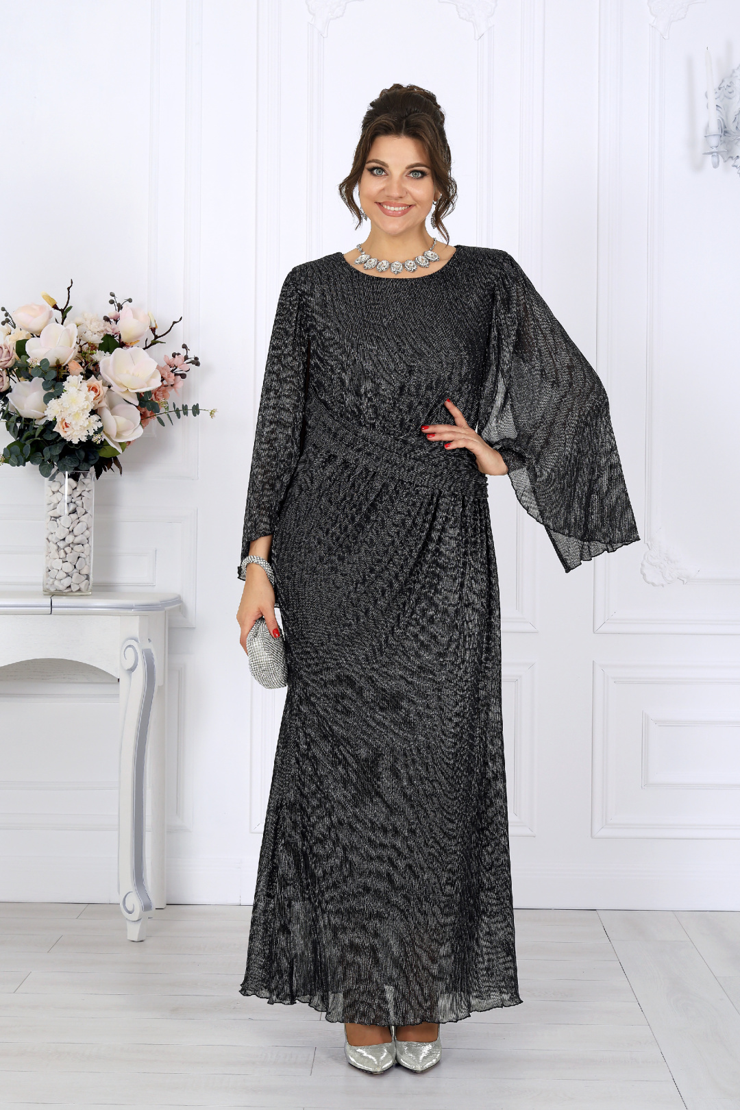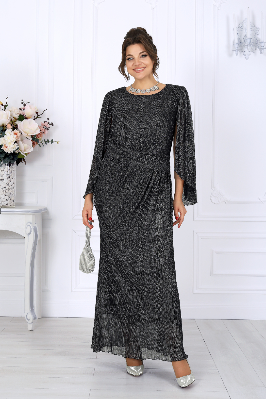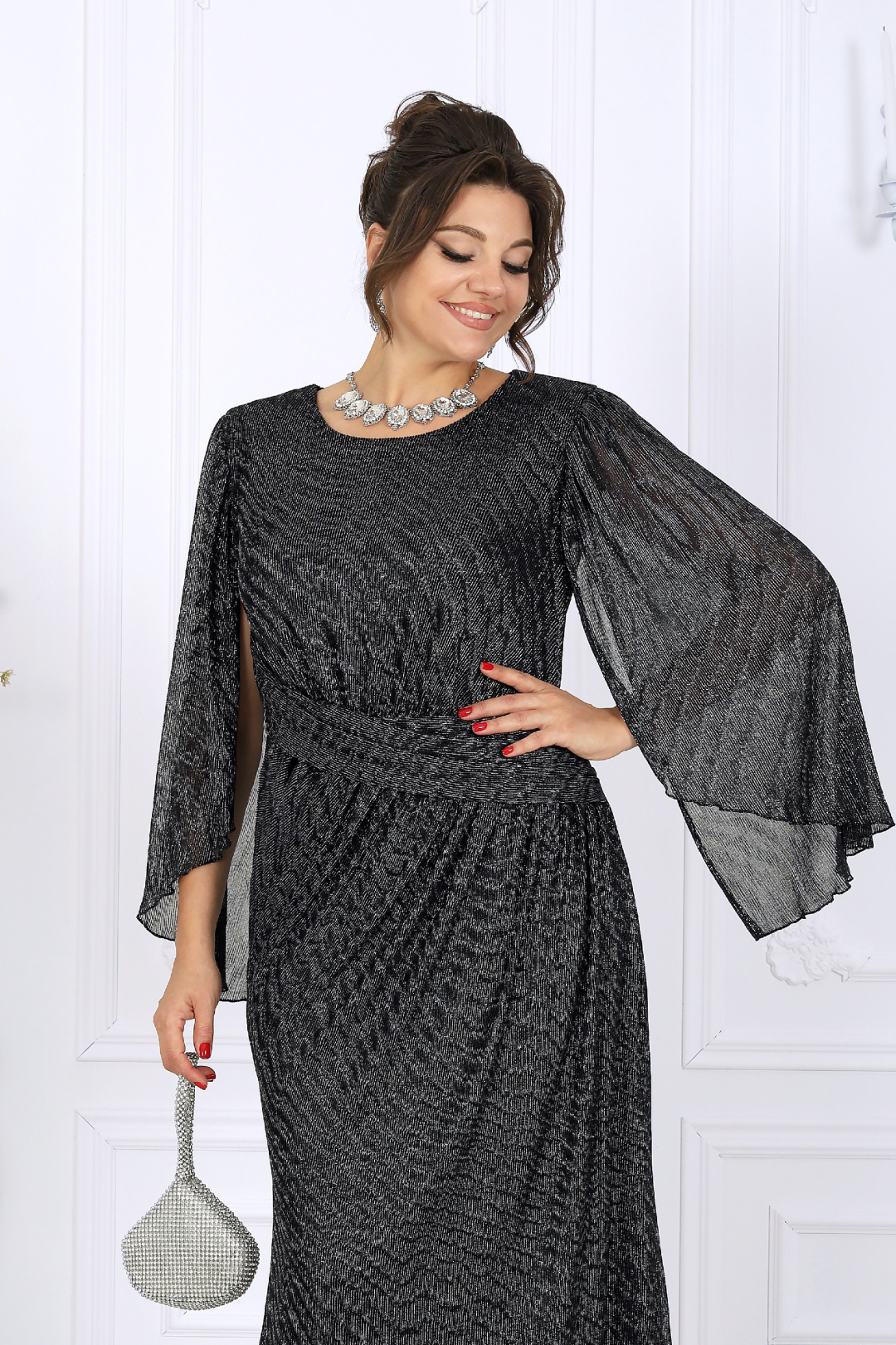 Длинное вечернее платье из элегантной сетки-гофре с нитью люрекс мерцает при каждом движении, словно улавливая в себе отблески огней. Этот деликатный блеск смотрится дорого и изысканно, создавая неповторимый аристократичный образ. Особое внимание заслуживает рукав — лёгкий, без шва, с изящно ниспадающими краями. Его воздушность придаёт образу загадочность и утончённость, а необычный крой с драпировкой и сборкой по линии плеч делает движения пластичными и грациозными. Фигурный вырез горловины придаёт образу нотку смелости, но остаётся выдержанным и гармоничным. Это платье прекрасно подходит для особых случаев: свадьбы, юбилея, званого вечера или торжества. Оно одинаково уместно в праздничной, свадебной или официальной атмосфере, позволяя вам ощущать себя королевой момента. Модель идеально подойдёт женщинам с формами — за счёт продуманного кроя она выгодно подчёркивает достоинства и деликатно скрывает лишнее, формируя правильный силуэт. Выбирая эту модель, вы выбираете не просто наряд, а состояние души — ощущение уверенности, стиля и особой значимости каждого момента. Платье женское, прилегающего силуэта с расширением к низу, выполнено из сетки-гофре с нитью «люрекс». Модель на трикотажной подкладке, без застежки, с плечевыми накладками. В верхней части переда косой подрез со сборкой; в шов подреза входит задрапированный декоративный элемент. На спинке обработаны талиевые вытачки. Вырез горловины переда и спинки округлой формы, по переду углубленный. Рукав без шва, с отлетными краями и фигурным низом, по окату сборка; крепится к пройме только в верхней части. Пройма окантована узкой косой бейкой из основного материала Длина платья – 140 см; длина рукава – 54 см.