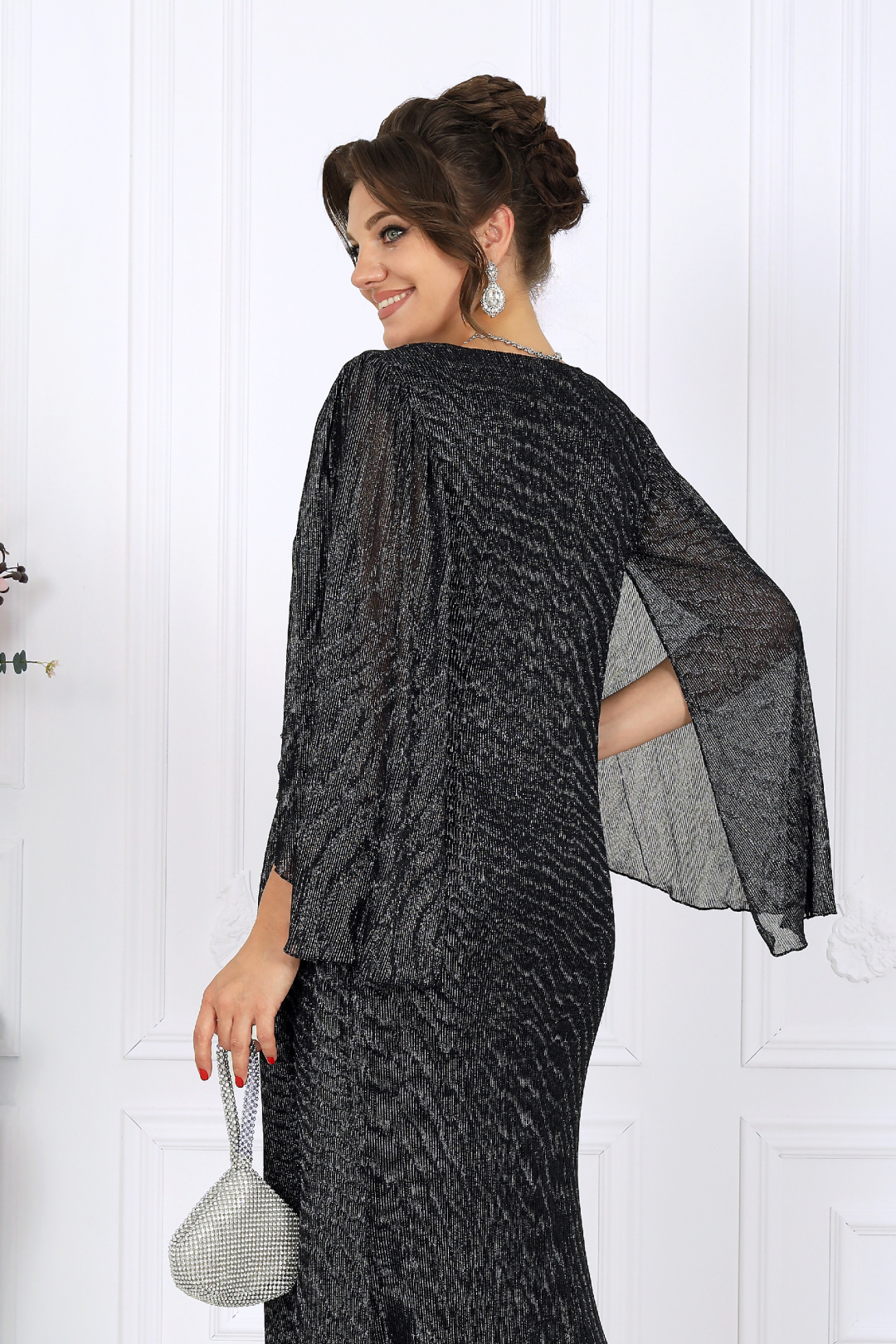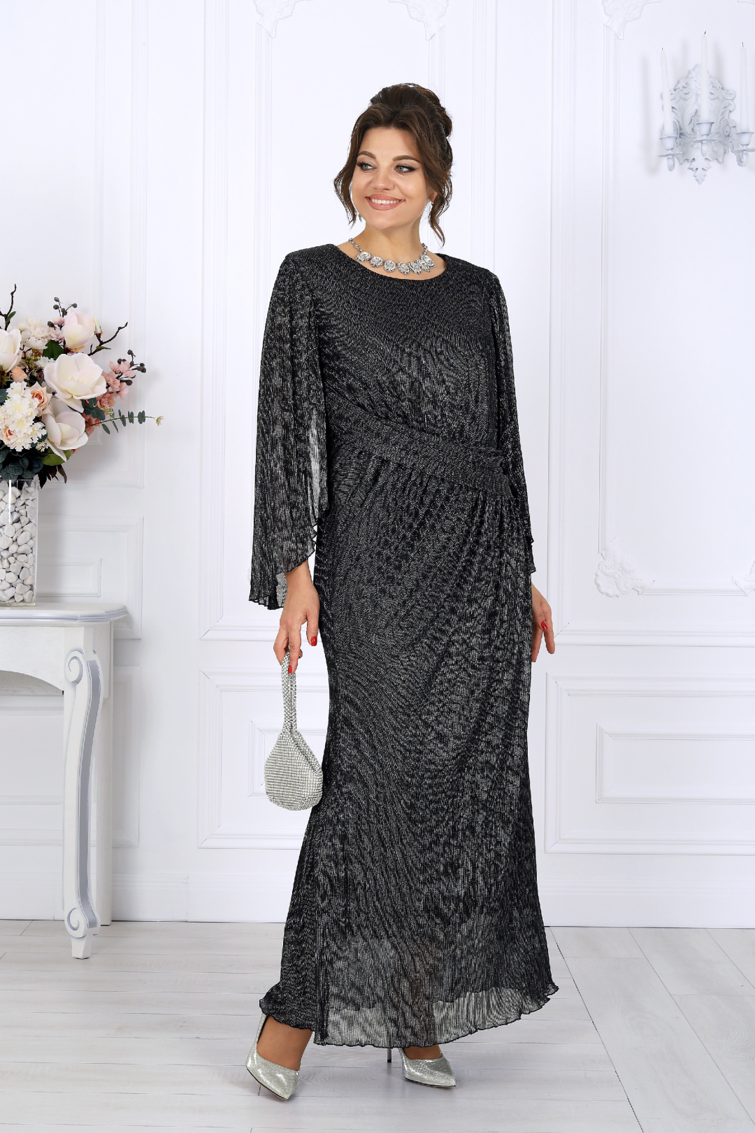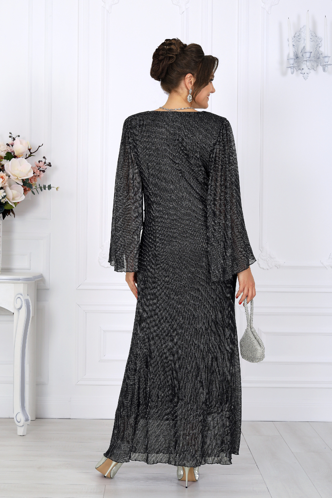 Длинное вечернее платье из элегантной сетки-гофре с нитью люрекс мерцает при каждом движении, словно улавливая в себе отблески огней. Этот деликатный блеск смотрится дорого и изысканно, создавая неповторимый аристократичный образ. Особое внимание заслуживает рукав — лёгкий, без шва, с изящно ниспадающими краями. Его воздушность придаёт образу загадочность и утончённость, а необычный крой с драпировкой и сборкой по линии плеч делает движения пластичными и грациозными. Фигурный вырез горловины придаёт образу нотку смелости, но остаётся выдержанным и гармоничным. Это платье прекрасно подходит для особых случаев: свадьбы, юбилея, званого вечера или торжества. Оно одинаково уместно в праздничной, свадебной или официальной атмосфере, позволяя вам ощущать себя королевой момента. Модель идеально подойдёт женщинам с формами — за счёт продуманного кроя она выгодно подчёркивает достоинства и деликатно скрывает лишнее, формируя правильный силуэт. Выбирая эту модель, вы выбираете не просто наряд, а состояние души — ощущение уверенности, стиля и особой значимости каждого момента. Платье женское, прилегающего силуэта с расширением к низу, выполнено из сетки-гофре с нитью «люрекс». Модель на трикотажной подкладке, без застежки, с плечевыми накладками. В верхней части переда косой подрез со сборкой; в шов подреза входит задрапированный декоративный элемент. На спинке обработаны талиевые вытачки. Вырез горловины переда и спинки округлой формы, по переду углубленный. Рукав без шва, с отлетными краями и фигурным низом, по окату сборка; крепится к пройме только в верхней части. Пройма окантована узкой косой бейкой из основного материала Длина платья – 140 см; длина рукава – 54 см.