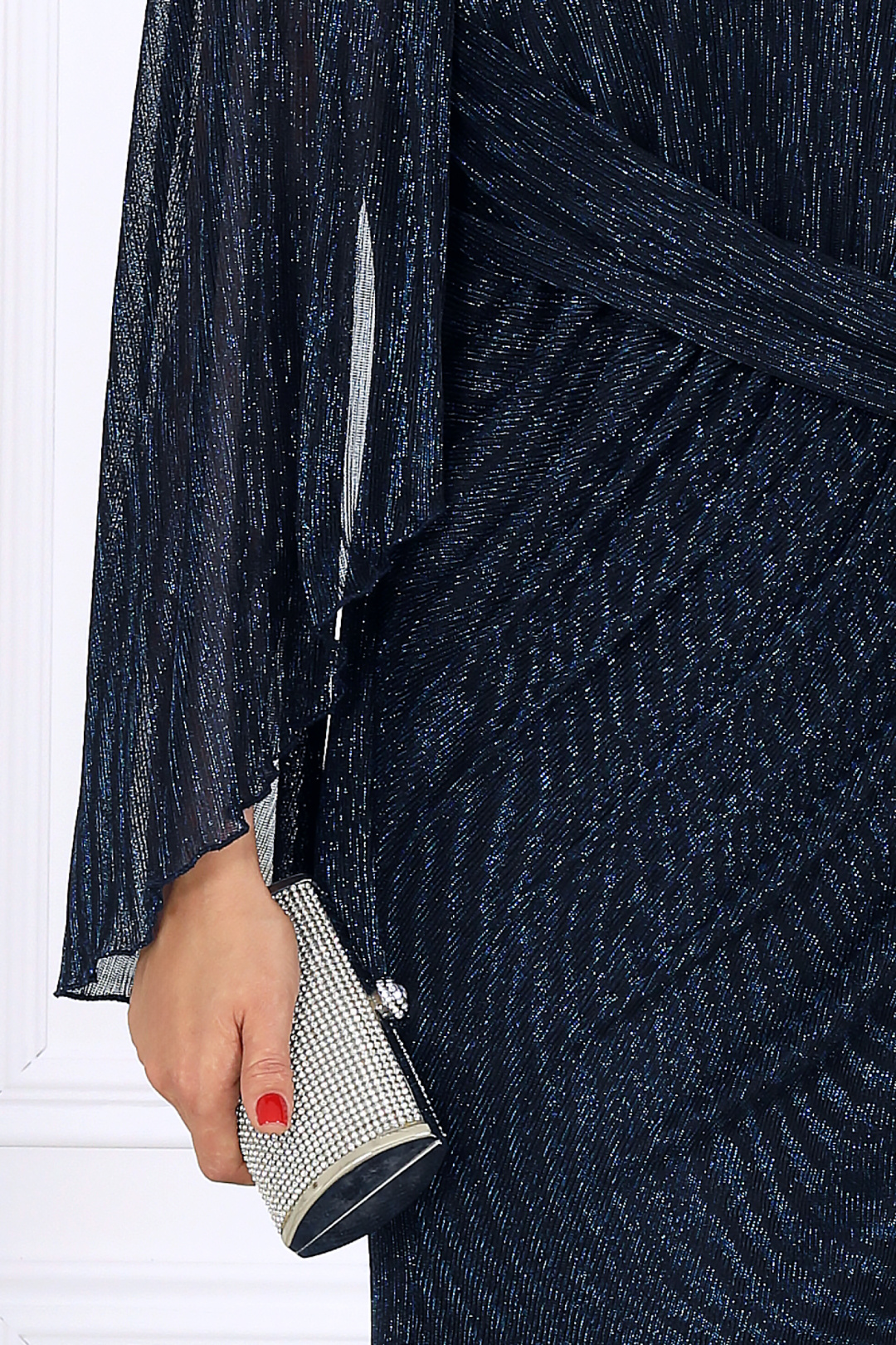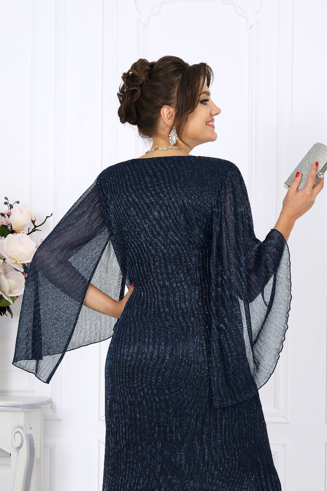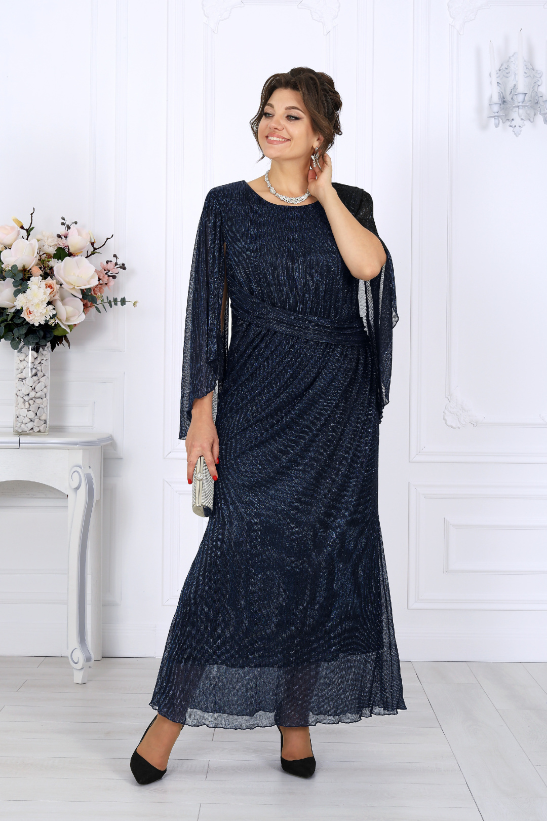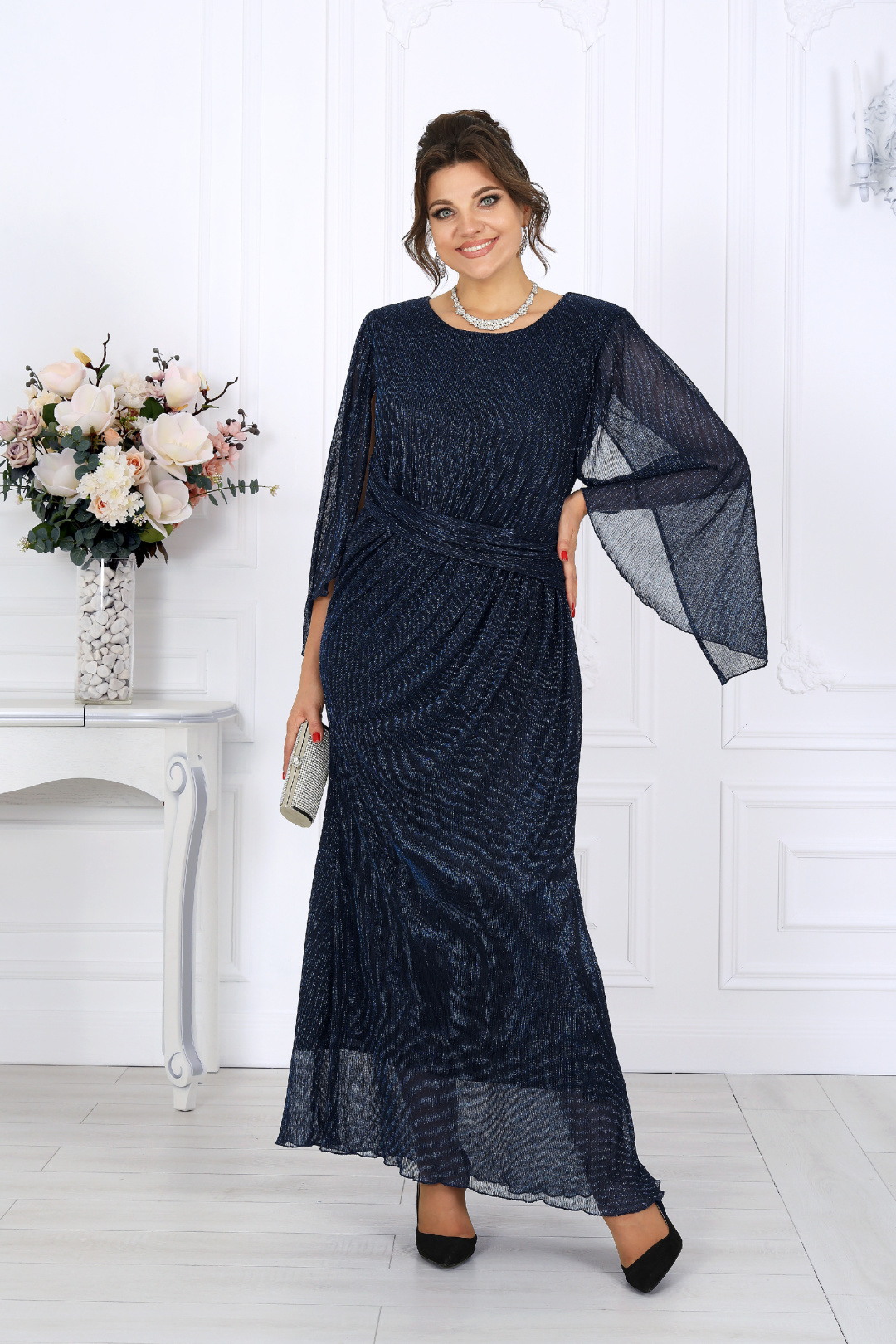 Длинное вечернее платье из элегантной сетки-гофре с нитью люрекс мерцает при каждом движении, словно улавливая в себе отблески огней. Этот деликатный блеск смотрится дорого и изысканно, создавая неповторимый аристократичный образ. Особое внимание заслуживает рукав — лёгкий, без шва, с изящно ниспадающими краями. Его воздушность придаёт образу загадочность и утончённость, а необычный крой с драпировкой и сборкой по линии плеч делает движения пластичными и грациозными. Фигурный вырез горловины придаёт образу нотку смелости, но остаётся выдержанным и гармоничным. Это платье прекрасно подходит для особых случаев: свадьбы, юбилея, званого вечера или торжества. Оно одинаково уместно в праздничной, свадебной или официальной атмосфере, позволяя вам ощущать себя королевой момента. Модель идеально подойдёт женщинам с формами — за счёт продуманного кроя она выгодно подчёркивает достоинства и деликатно скрывает лишнее, формируя правильный силуэт. Выбирая эту модель, вы выбираете не просто наряд, а состояние души — ощущение уверенности, стиля и особой значимости каждого момента. Платье женское, прилегающего силуэта с расширением к низу, выполнено из сетки-гофре с нитью «люрекс». Модель на трикотажной подкладке, без застежки, с плечевыми накладками. В верхней части переда косой подрез со сборкой; в шов подреза входит задрапированный декоративный элемент. На спинке обработаны талиевые вытачки. Вырез горловины переда и спинки округлой формы, по переду углубленный. Рукав без шва, с отлетными краями и фигурным низом, по окату сборка; крепится к пройме только в верхней части. Пройма окантована узкой косой бейкой из основного материала Длина платья – 140 см; длина рукава – 54 см.