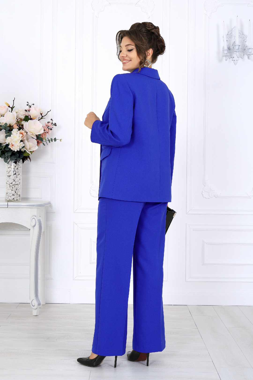 Элегантный брючный костюм двойка — идеальный выбор для деловых встреч, офисных будней, торжеств и вечерних выходов. Костюм подходит для женщин с формами: он формирует правильный силуэт, подчеркивая достоинства и создавая стройный образ. Двубортная застежка со смещением и декоративной вставкой создаёт эффект многослойности, придавая образу стильный акцент. Универсальная модель — одинаково уместна как на работе, так и на торжественном мероприятии. Костюм брючный 2-х предметный, состоящий из жакета и брюк. Жакет двубортный, полуприлегающего силуэта, выполнен из костюмной поливискозы. Модель на подкладке, с плечевыми накладкам. Спереди обработаны рельефные швы, направленные от пройм до низа; в нижней части переда расположены прорезные карманы с клапаном, в верхней, слева – имитация прорезного кармана с листочкой. Перед со смещенной внешней застежкой на 2 декоративные пуговицы и внутренней на 2 потайные. Спинка со средним швом. Воротник пиджачного типа. Рукав длинный, втачной. Правая сторона жакета дополнена декоративной вставкой, имитирующей двойную деталь переда. Длина жакета - 68 см; длина рукава - 61 см. Брюки классические, с кантами и посадкой на талии, выполнены из костюмной поливискозы. Модель с центральной застёжкой на тесьму-«молнию», на притачном поясе, застегивающемся на петлю и пуговицу. Передние и задние половинки брюк с талиевыми вытачками, направленными от пояса вниз. Спереди обработаны боковые наклонные карманы. Для лучшего прилегания брюк в области талии в поясе по задним половинкам вставлена эластичная лента. Длина брюк по боковому (с поясом)-107 см (50-52 р-р), 108 см (54-58 р-р).