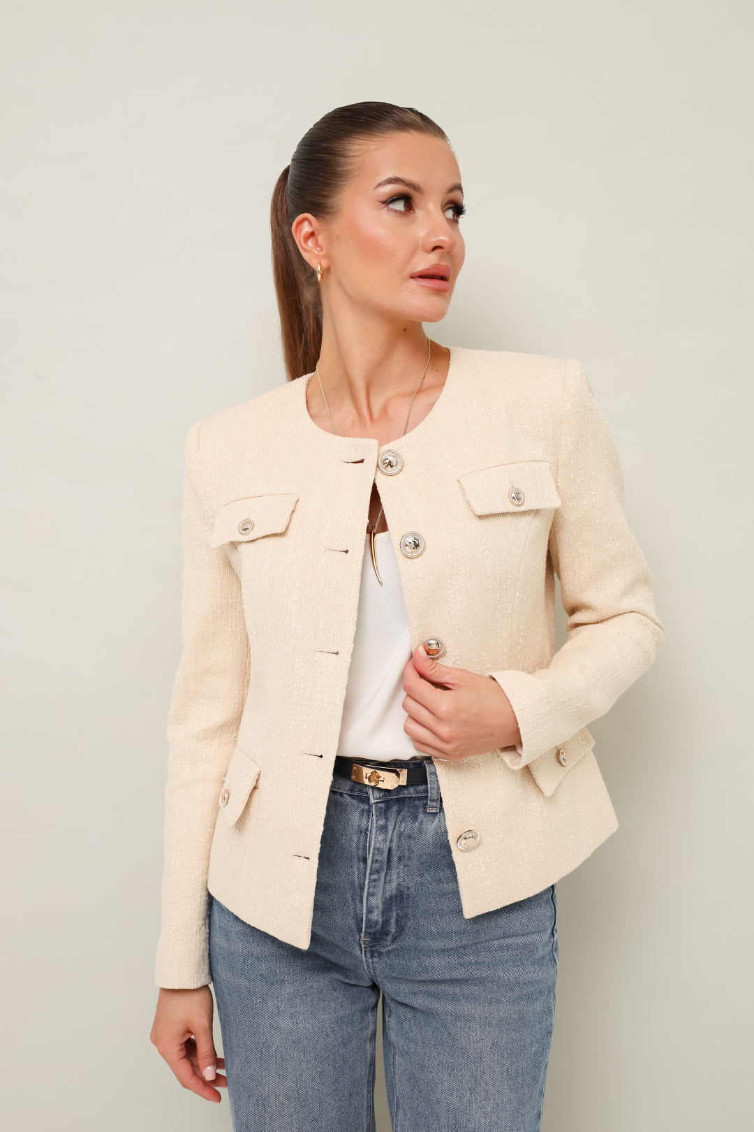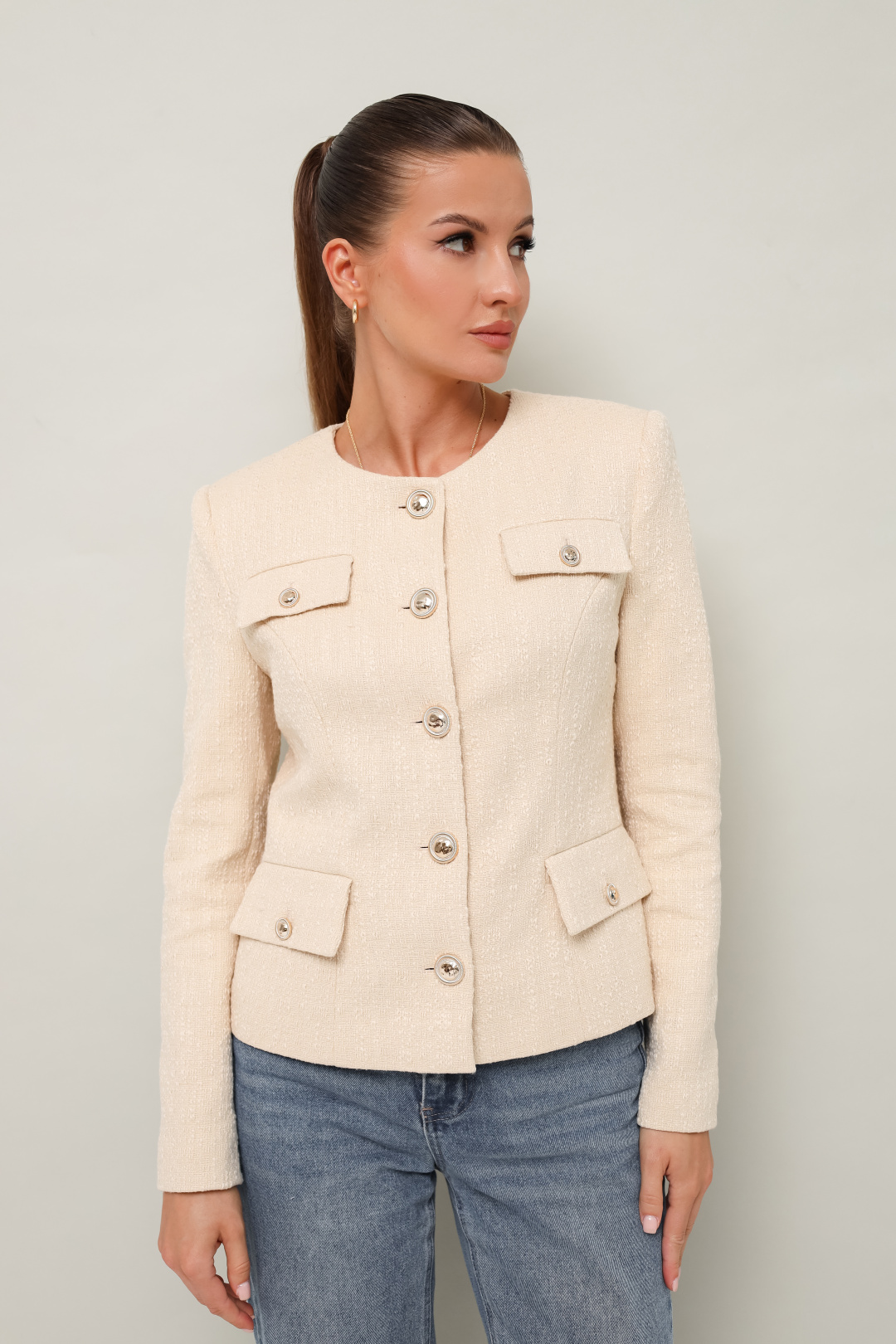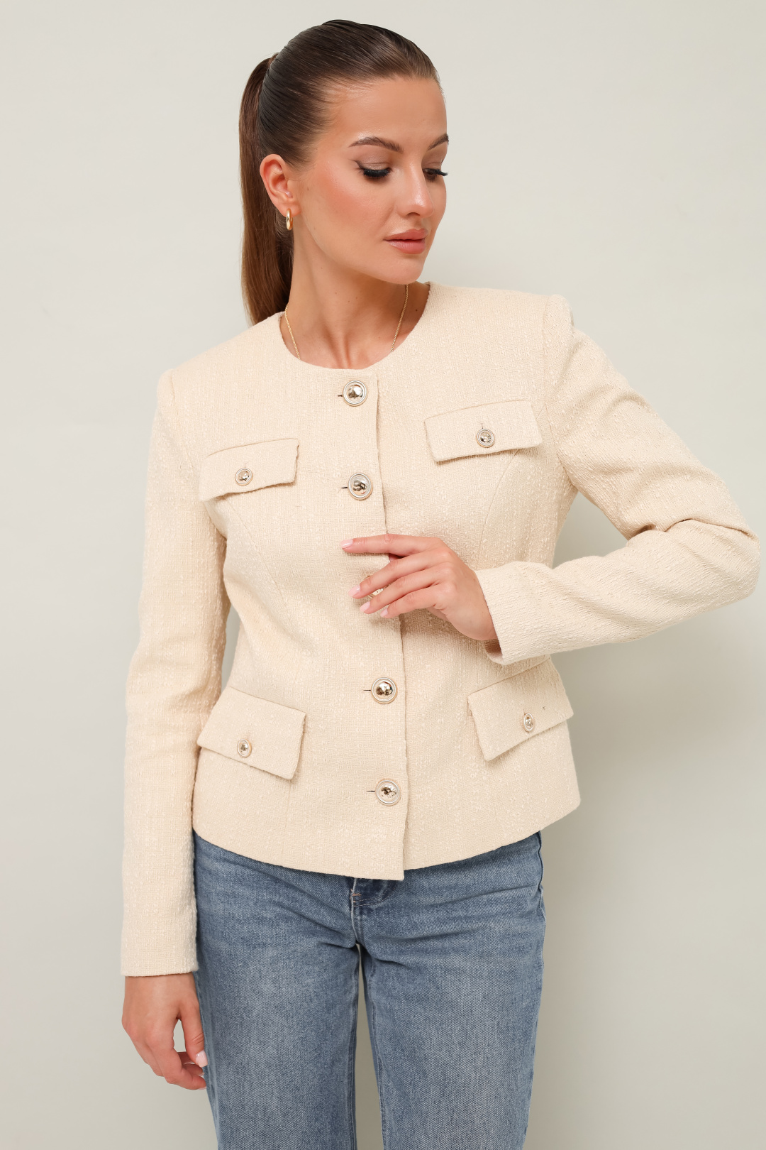 Жакет полуприлегающего силуэта, выполнен из структурной ткани. Округлый вырез горловины. Застежка центральная на петли и пуговицы. Спереди обработаны декоративные клапаны с пуговицами. Рукава втачные двухшовные. Спинка со средним швом и рельефами. Жакет на подкладке.