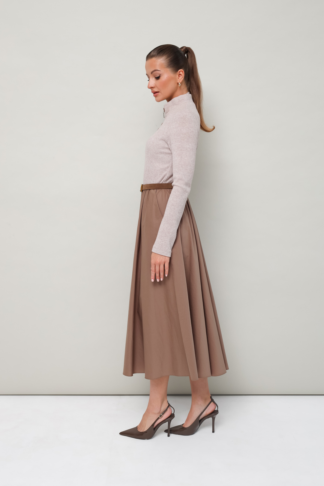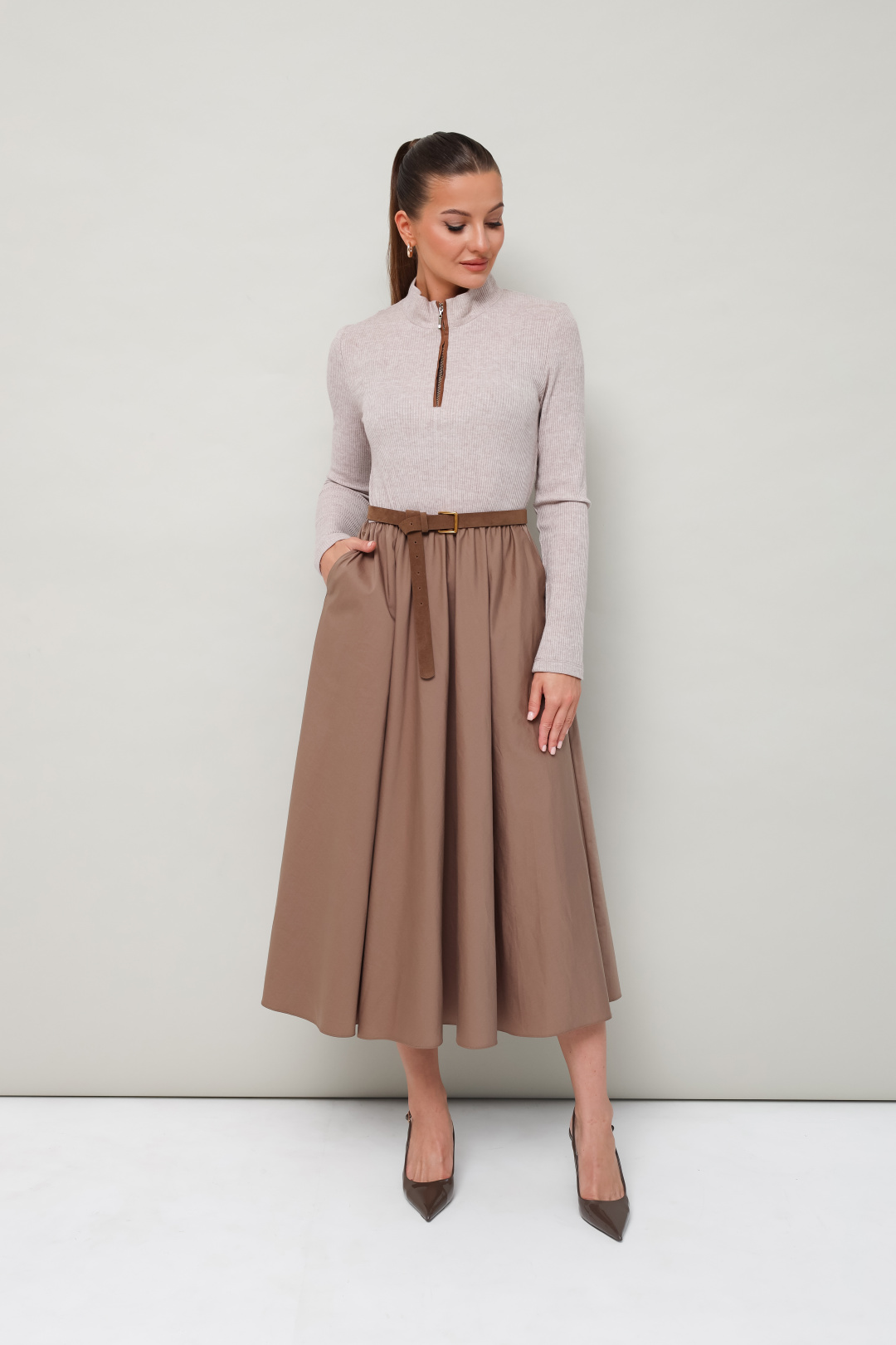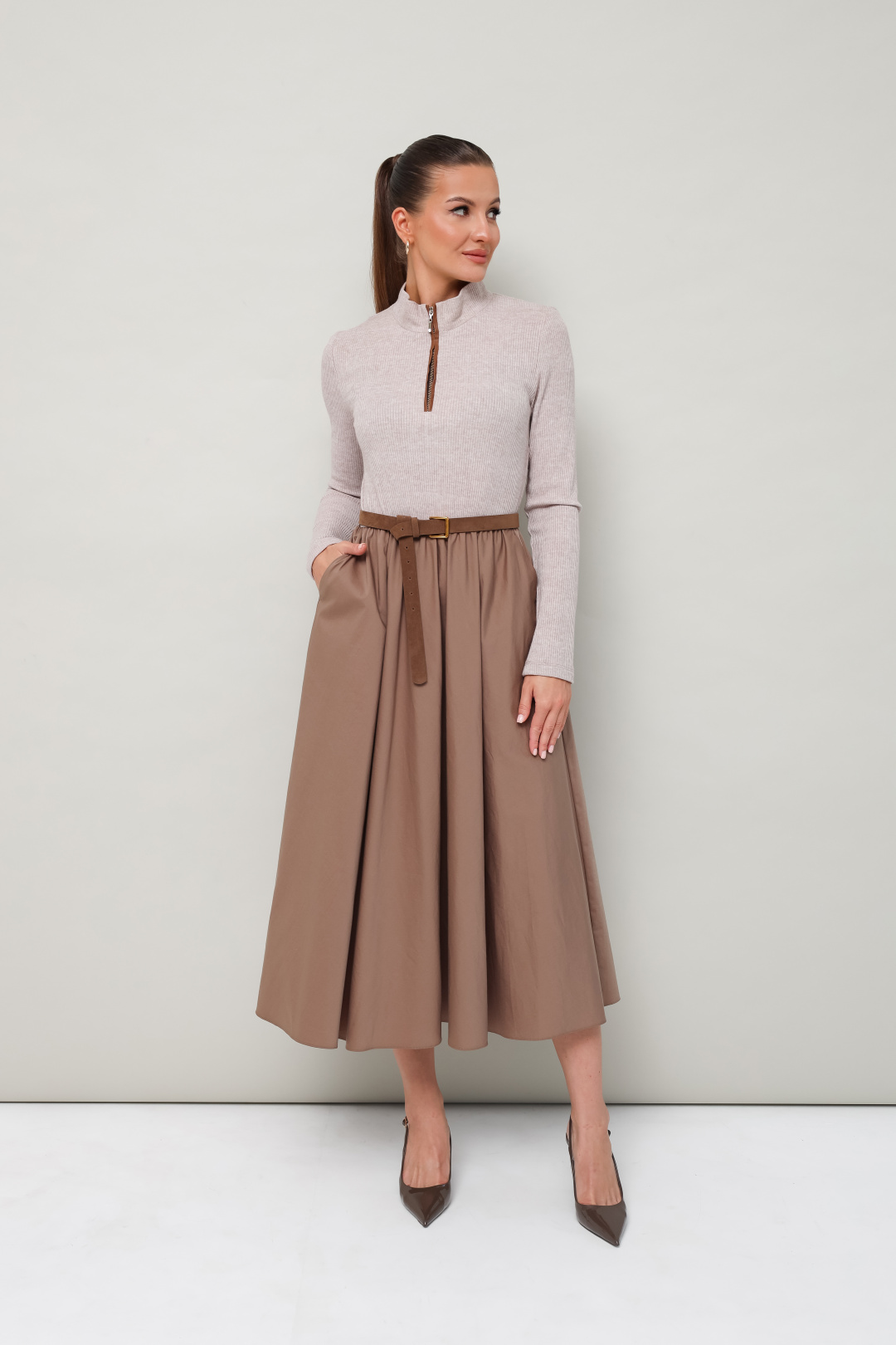 Лиф прилегающего силуэта, выполнен из трикотажного полотна. Горловина с притачным воротником-стойкой. Застежка центральная на тесьму-молнию с притачными планками до линии груди. Рукава втачные длинные. Для комфорта и регуляции размера по талии обработана резинка. Юбка А-силуэта с боковыми наклонными карманами, выполнена из матовой тафты. В комплекте прилагается съемный ремень.
