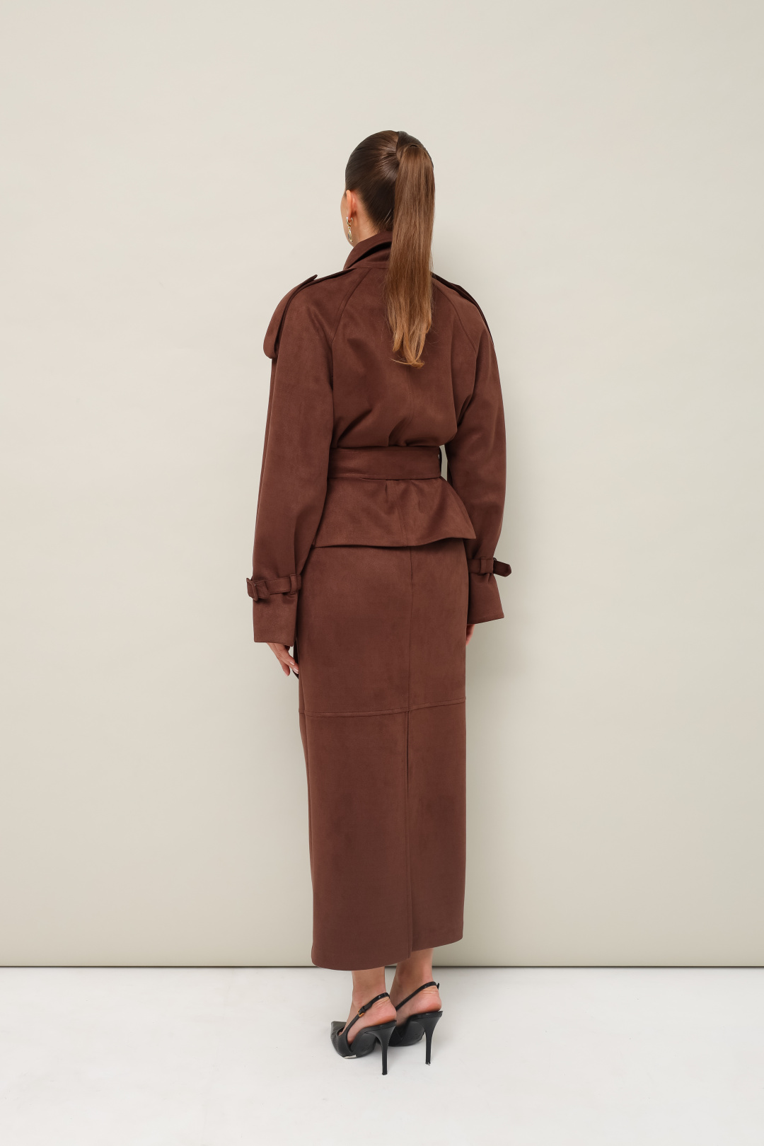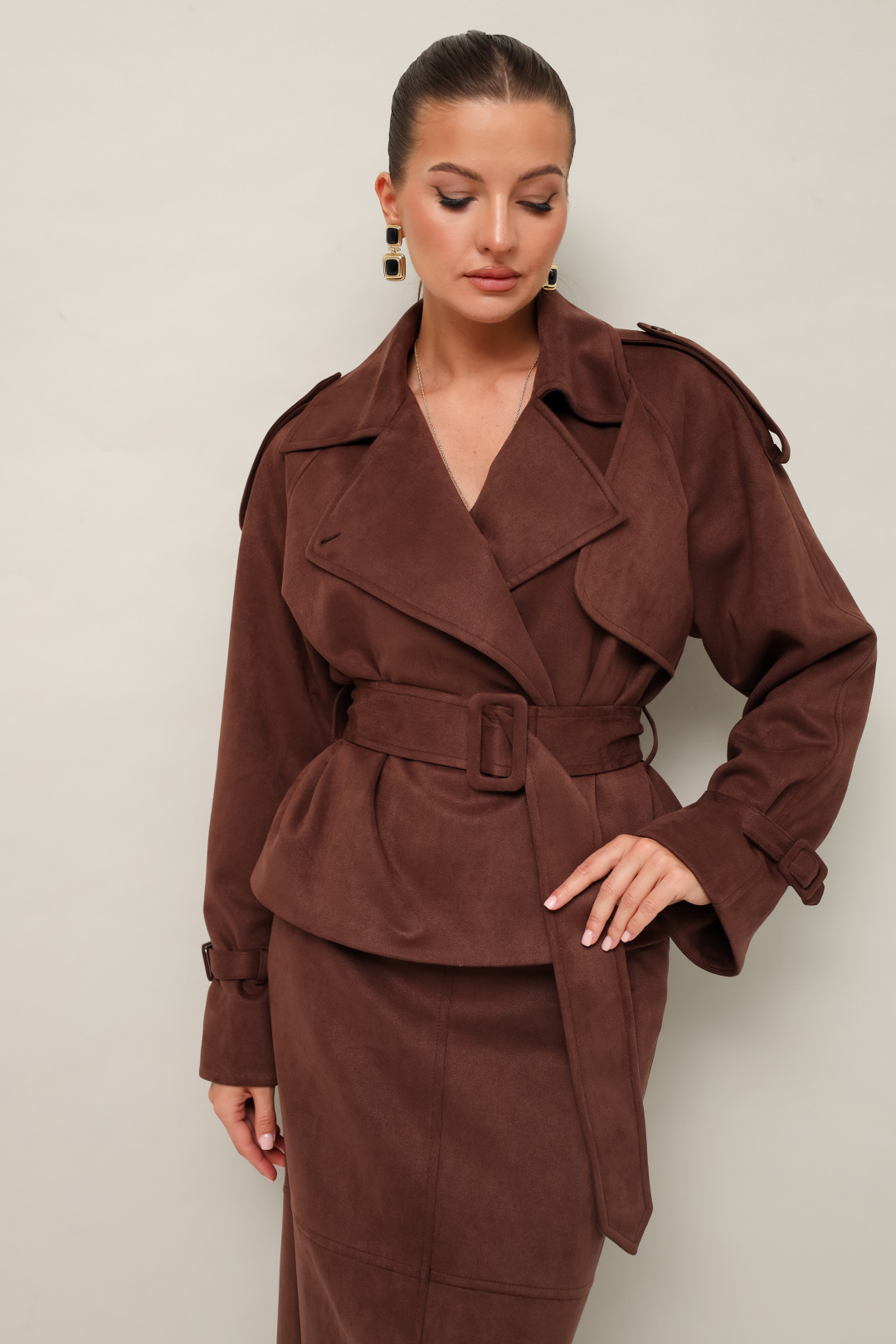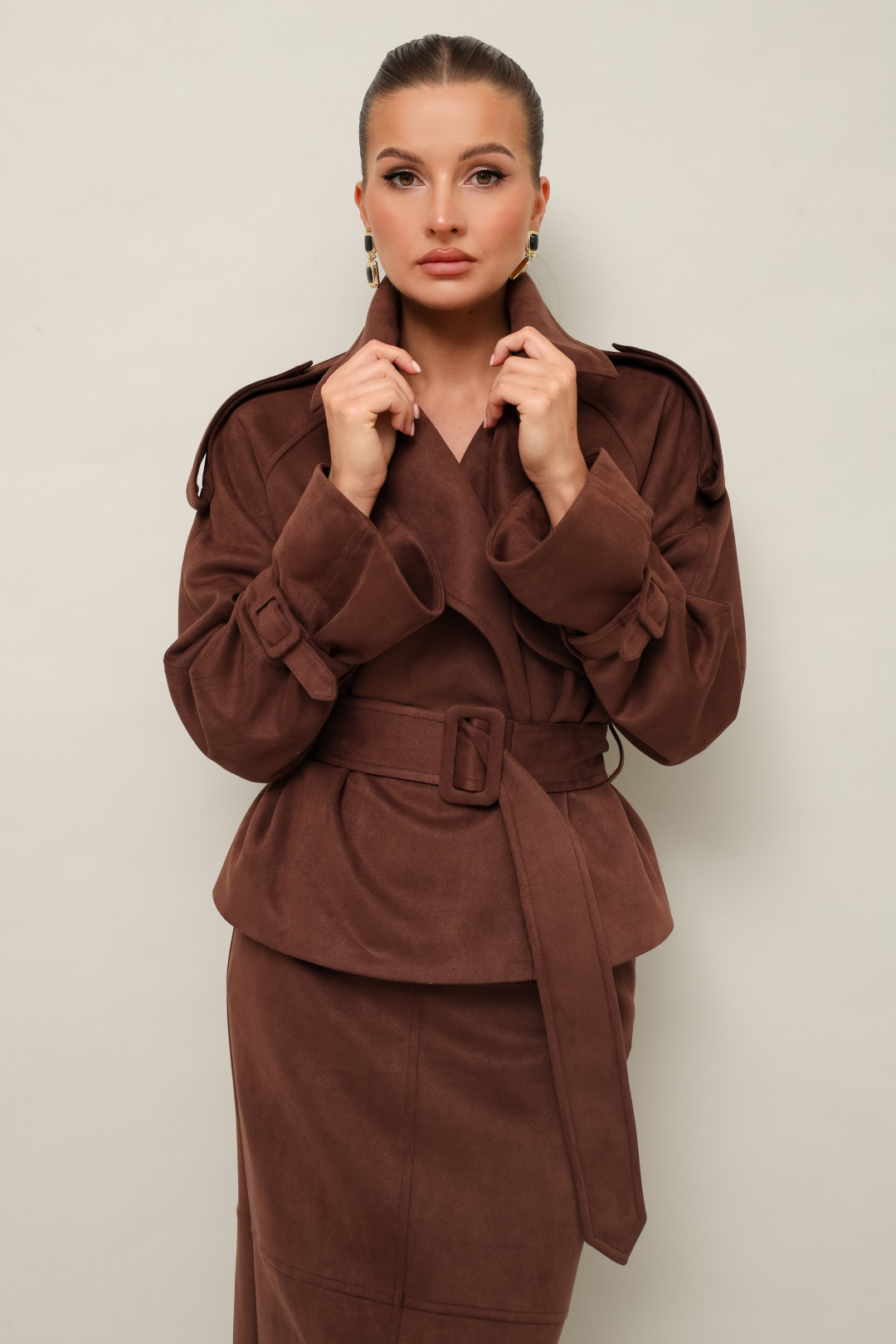 Стильный 2-предметный комплект, состоящий из жакета и юбки, выполненный из экозамши.