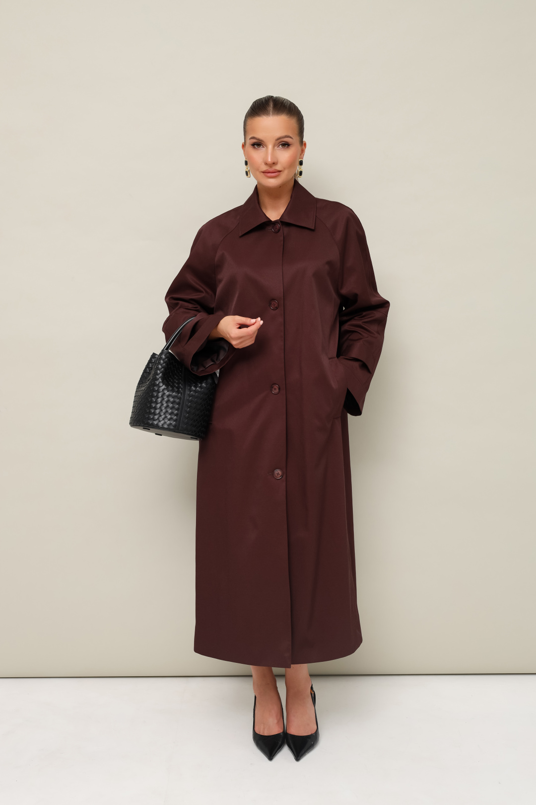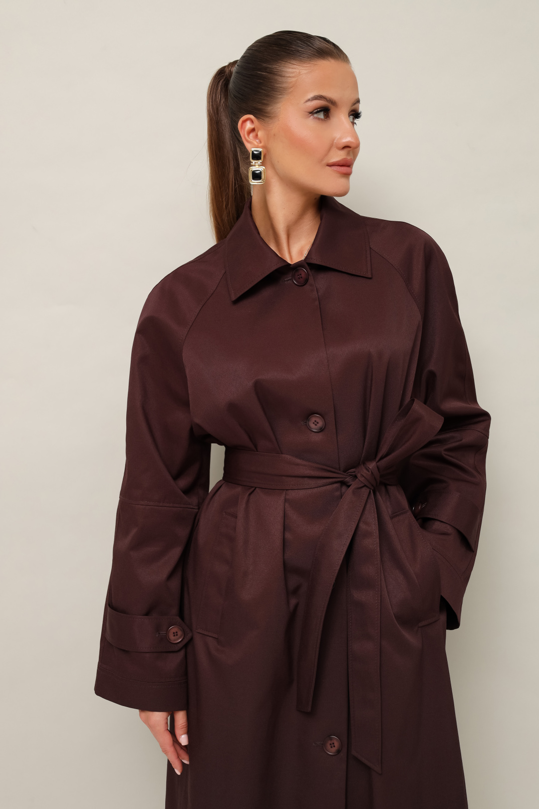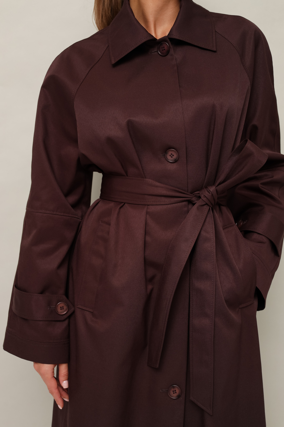 Плащ в длине миди, выполнен из ткани с водоотталкивающей и грязеотталкивающей обработкой. Силуэт слегка расширенный к низу. Отложной воротник с цельнокроеной стойкой. Центральная застёжка на петли и пуговицы. Спереди функциональные карманы-листочки. Рукава кроя реглан, по низу обработаны паты с застежкой на пуговицы. Спинка со средним швом со шлицей по низу. Плащ на подкладке. В комплекте прилагается пояс из основной ткани.