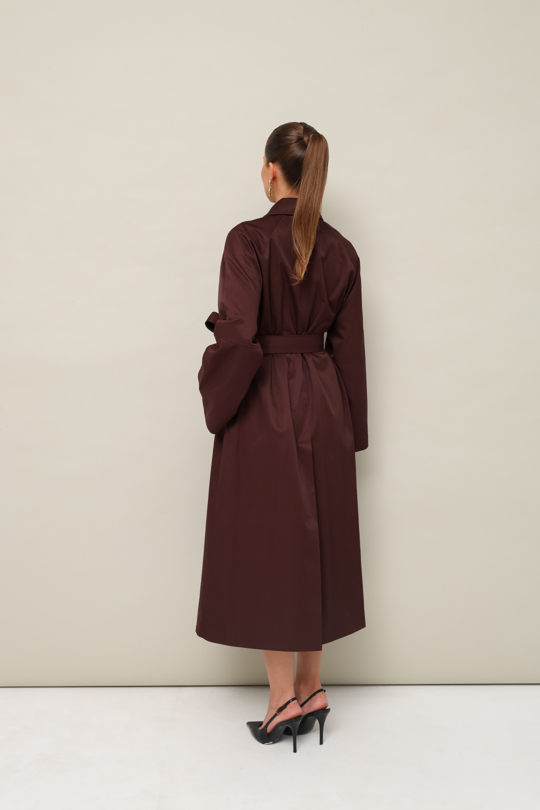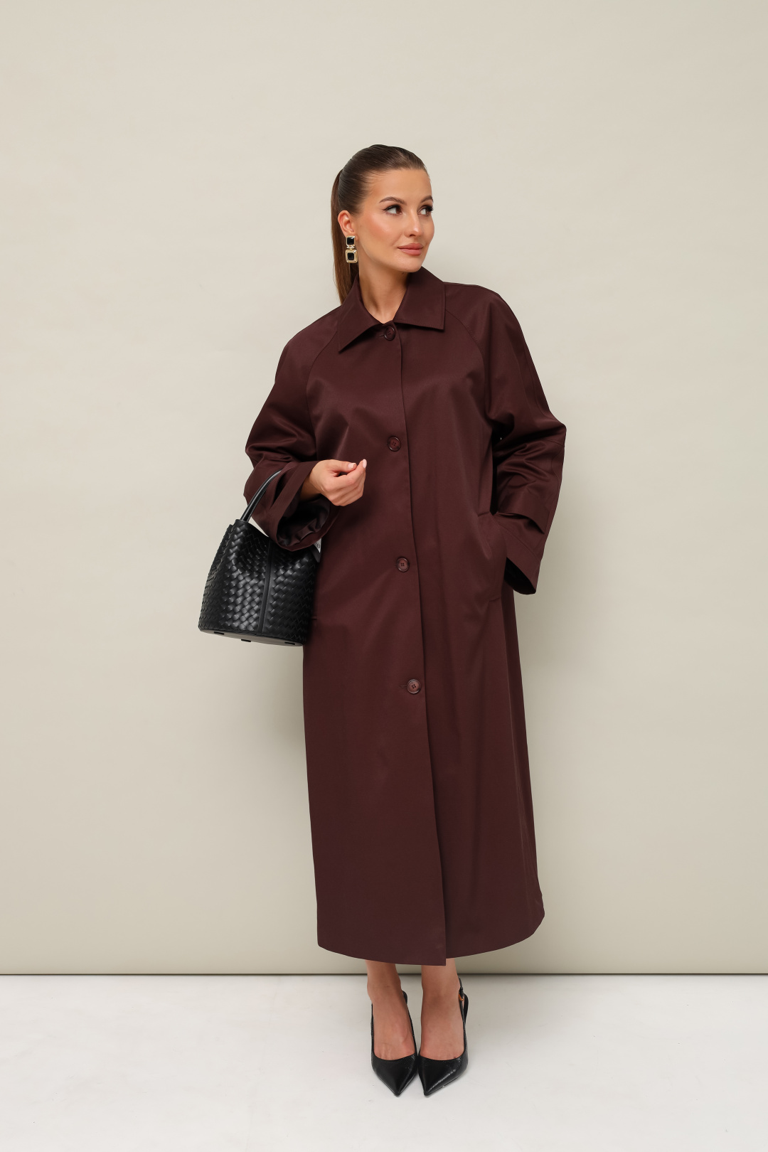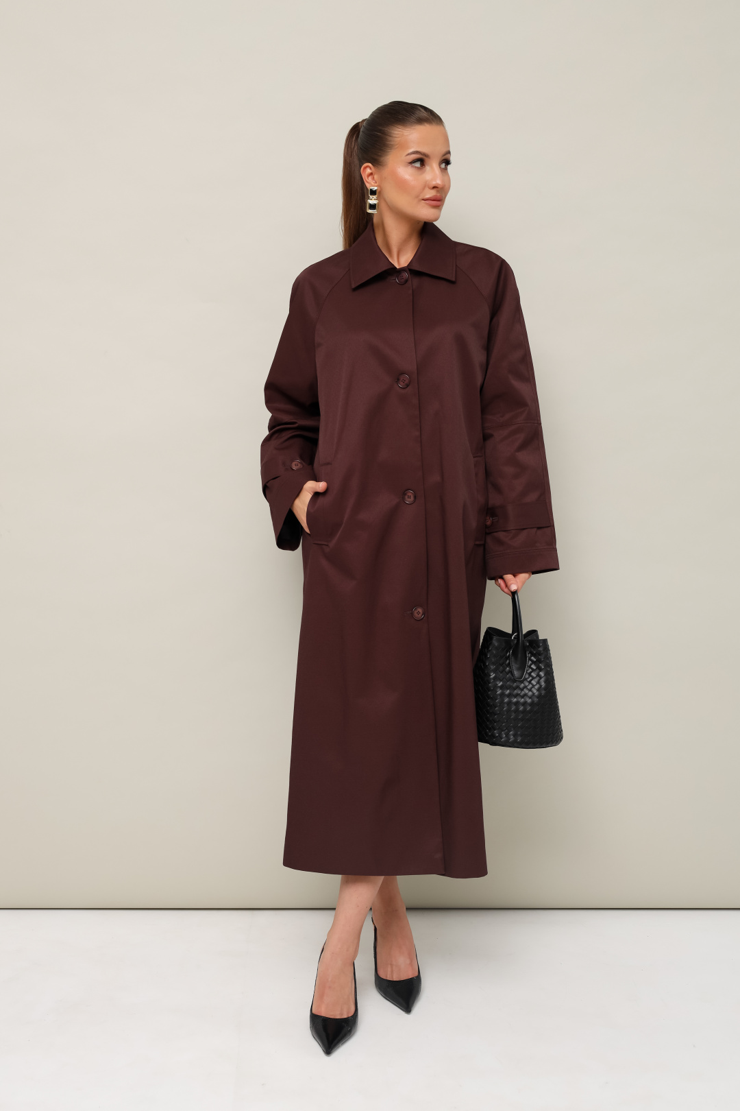 Плащ в длине миди, выполнен из ткани с водоотталкивающей и грязеотталкивающей обработкой. Силуэт слегка расширенный к низу. Отложной воротник с цельнокроеной стойкой. Центральная застёжка на петли и пуговицы. Спереди функциональные карманы-листочки. Рукава кроя реглан, по низу обработаны паты с застежкой на пуговицы. Спинка со средним швом со шлицей по низу. Плащ на подкладке. В комплекте прилагается пояс из основной ткани.