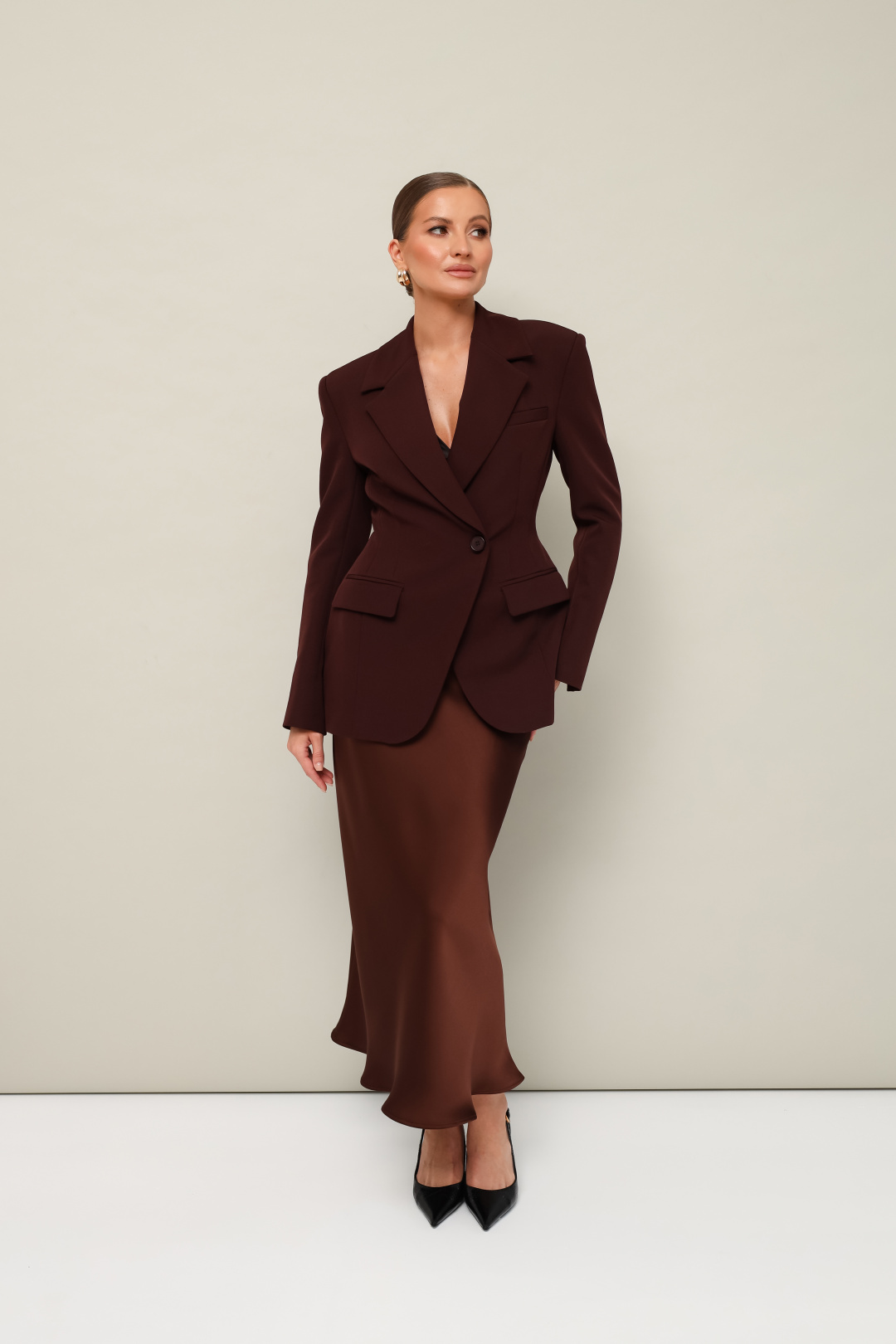 Юбка с кроем «по косой» в длине миди, пояс на обтачке, застежка в боковом шве на потайную тесьму молнию.