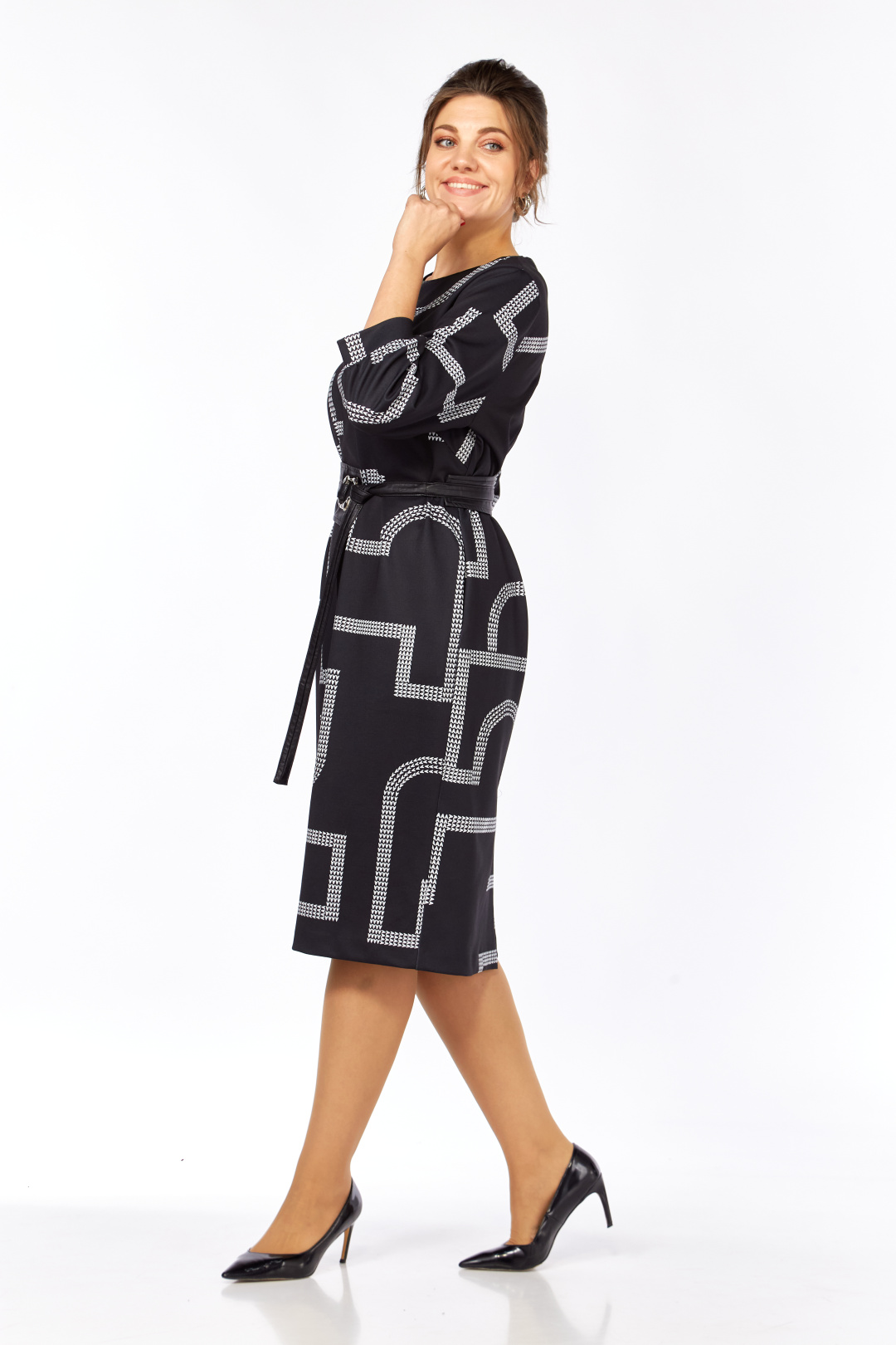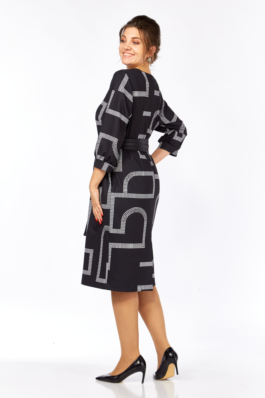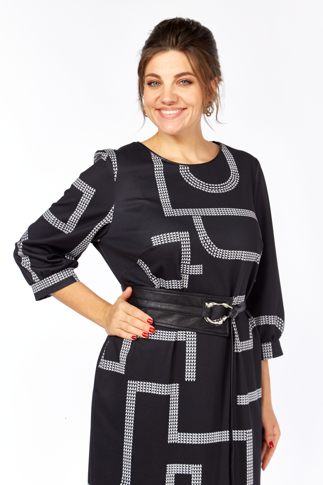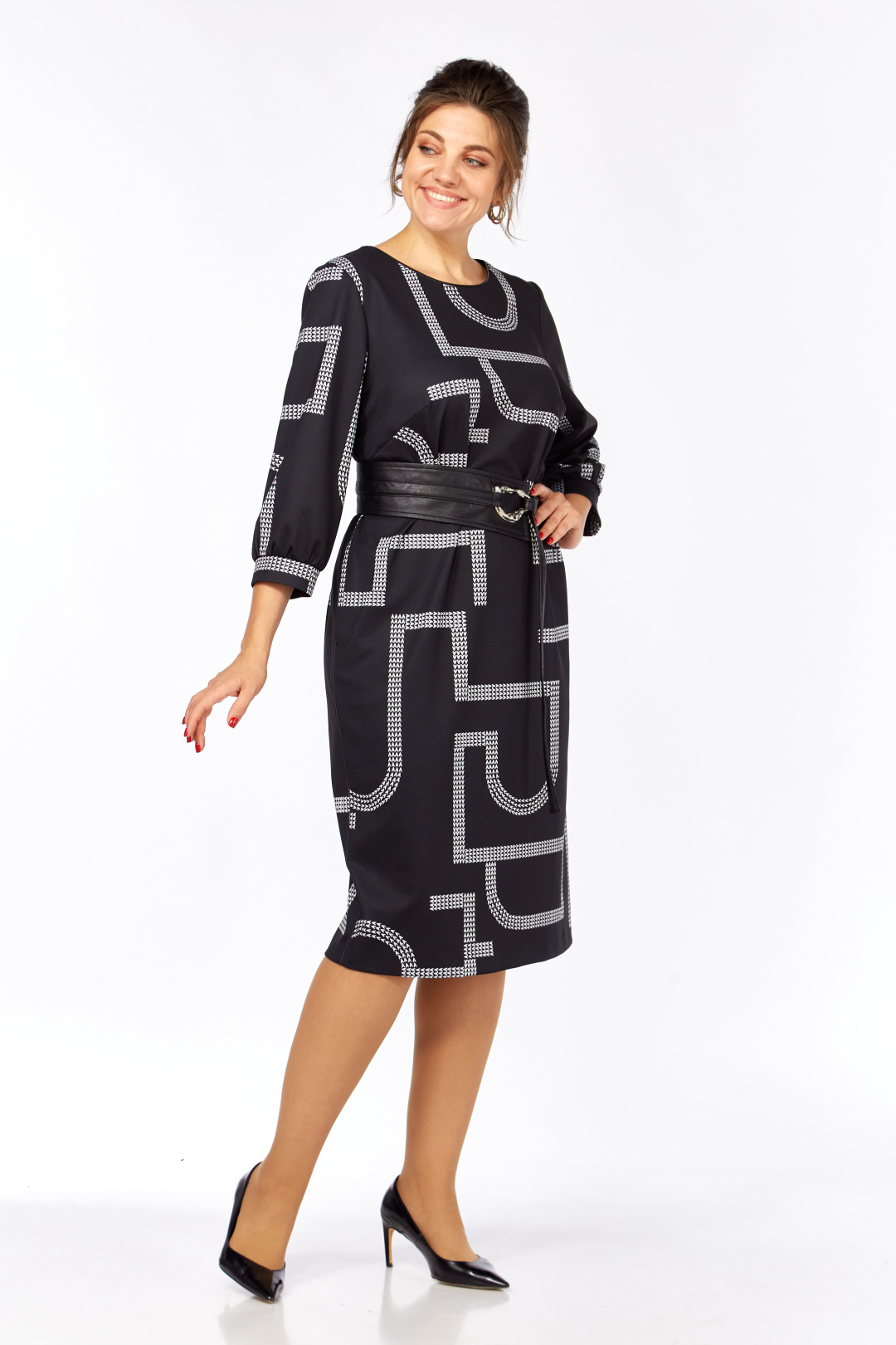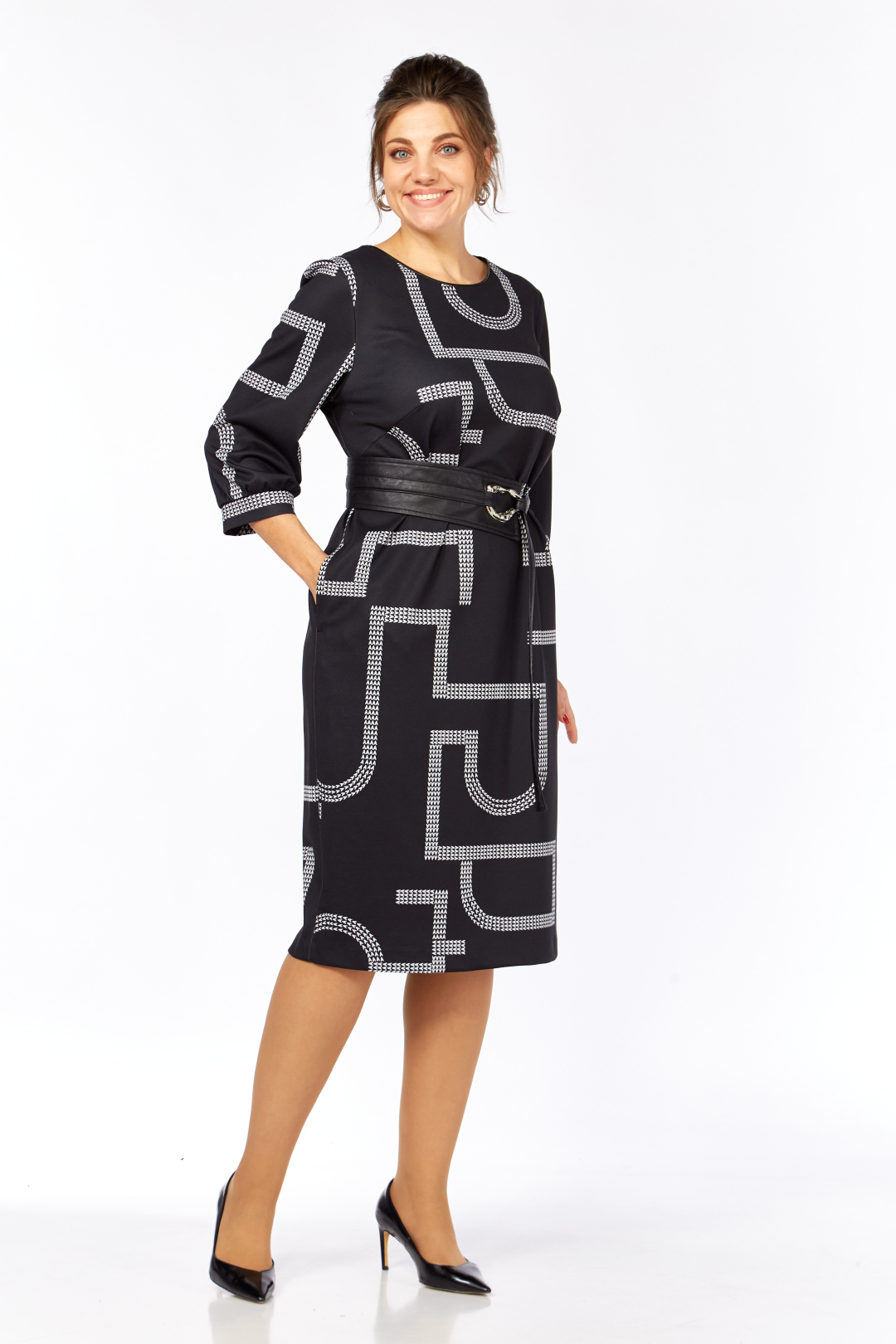 Платье женское прямого силуэта выполнено из высококачественного трикотажного полотна с дизайнерским принтом. В боковых швах имеются функциональные карманы. Перед с округлым вырезом, оформлен кожаным кантом. Спинка прямая со средним швом. Рукав одношовный втачной длиной ¾. В комплекте идет кожаный съемный пояс.