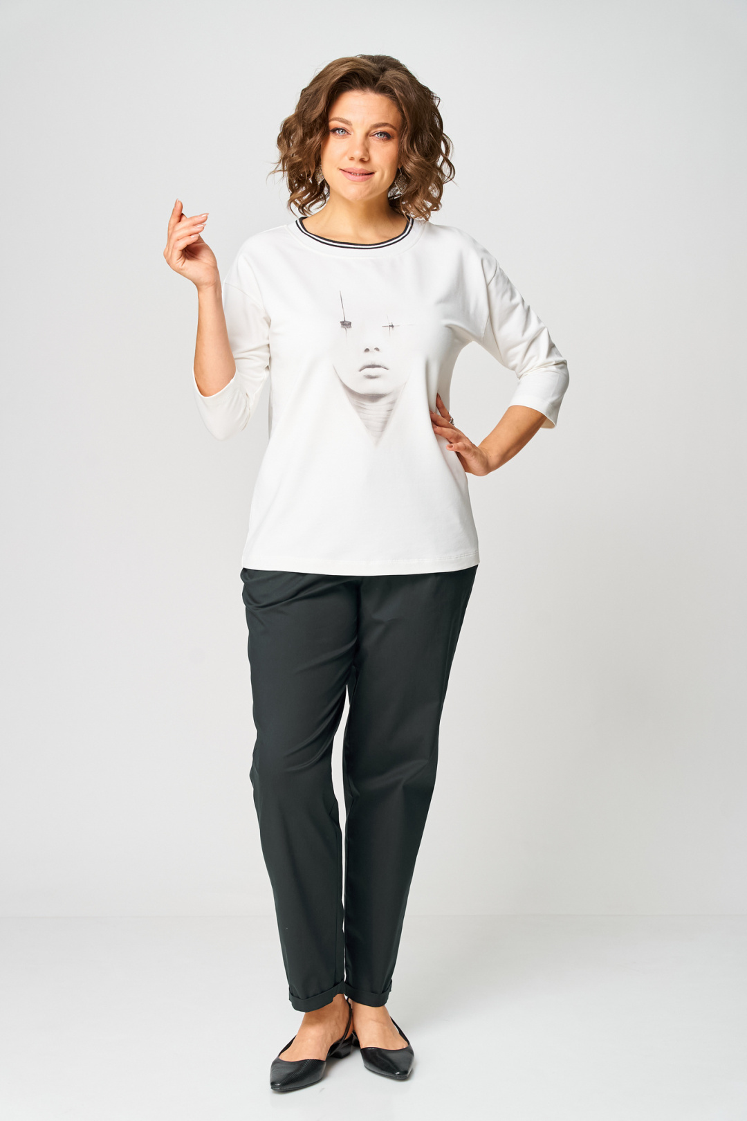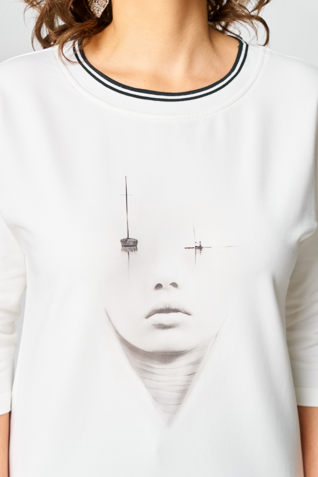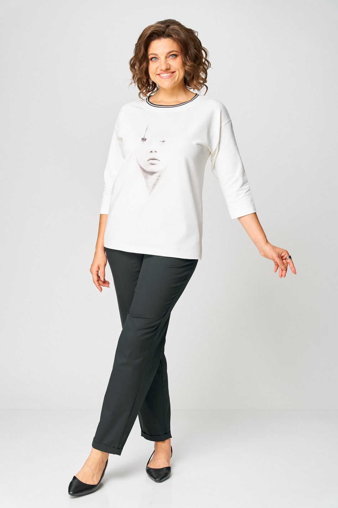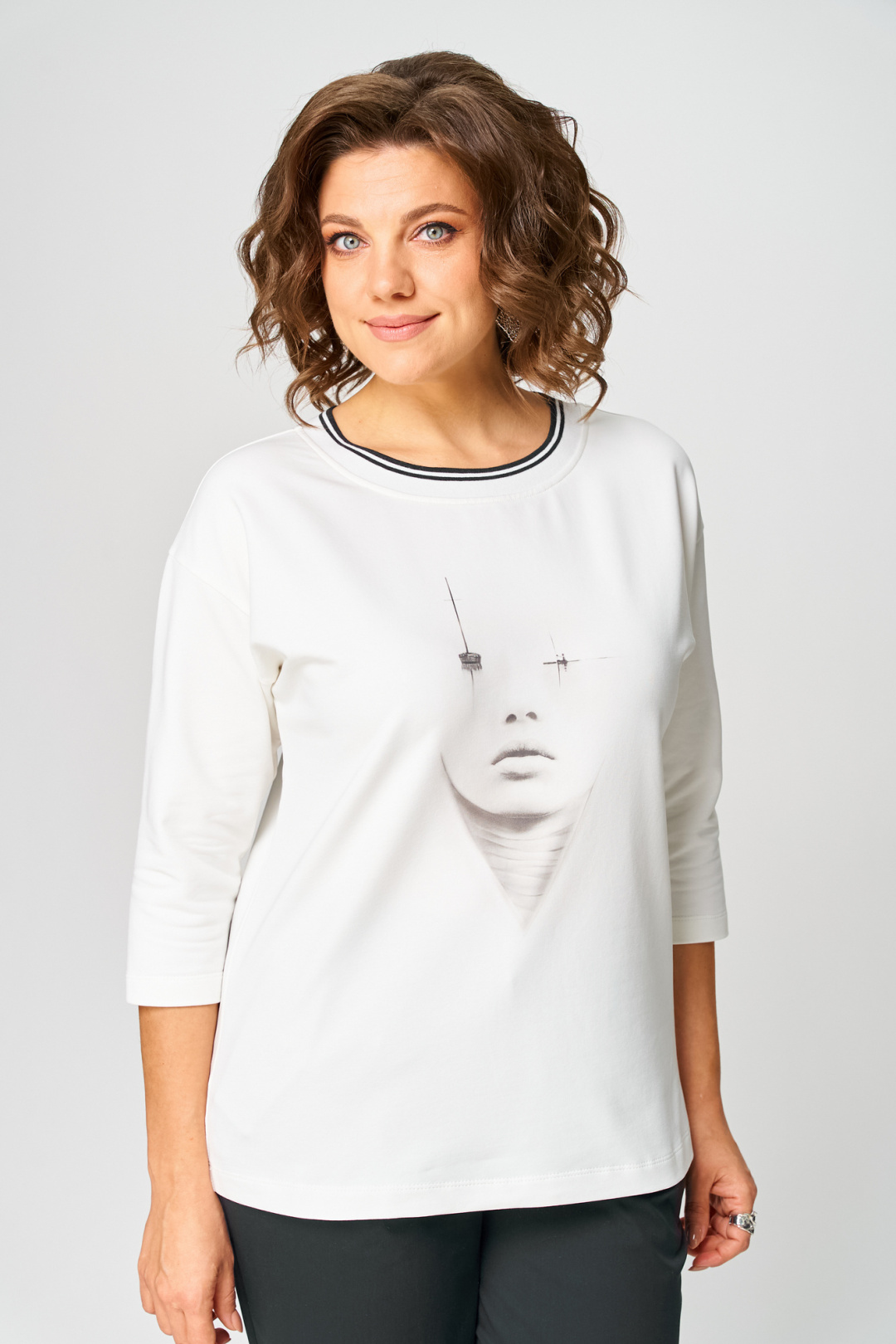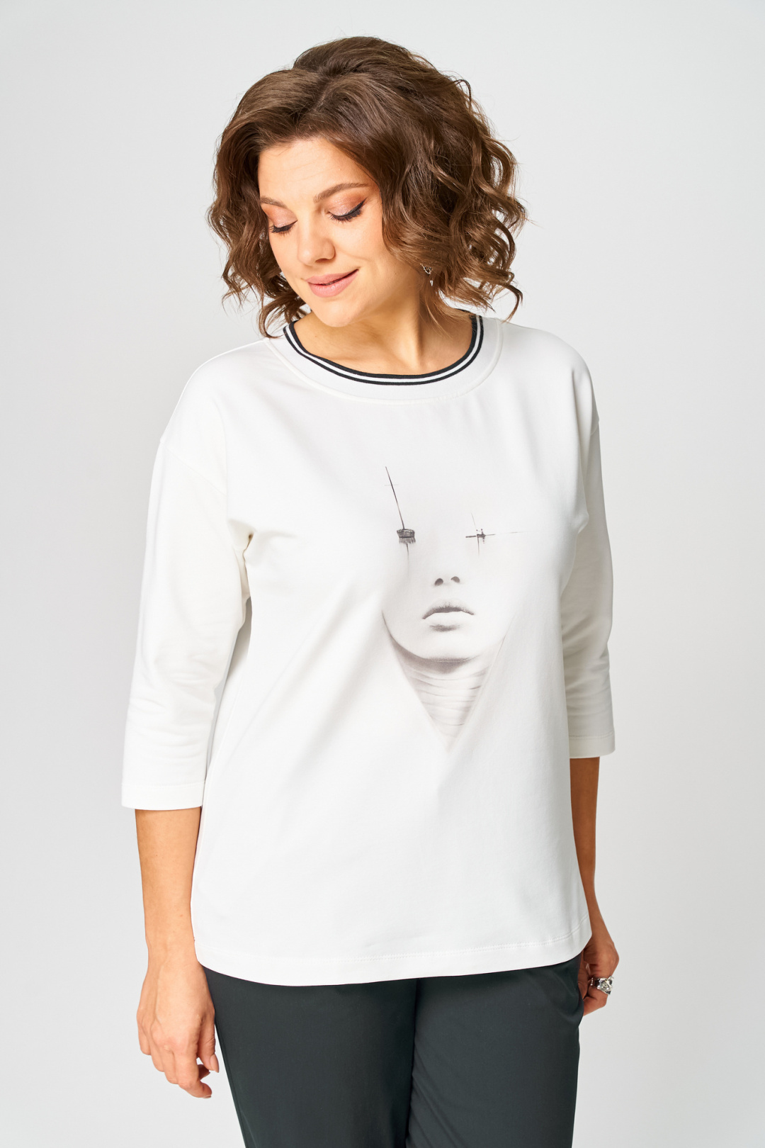 Элегантный женский джемпер белого цвета, выполнен из мягкой трикотажной ткани (двунитка), идеально подходит для создания повседневного образа. Модель с оригинальным спущенным плечом и рукавами 3/4 обеспечивает свободу движений и комфорт. Круглый вырез горловины аккуратно обработан довязом, добавляя изысканности в общий вид. Привлекает внимание стильный графический принт на передней части джемпера, вносящий акцент и уникальность в образ. Спинка изделия выполнена без среднего шва, что подчеркивает гладкость и цельность фасона. Этот джемпер станет отличным дополнением к вашему гардеробу, сочетая в себе моду и комфорт.