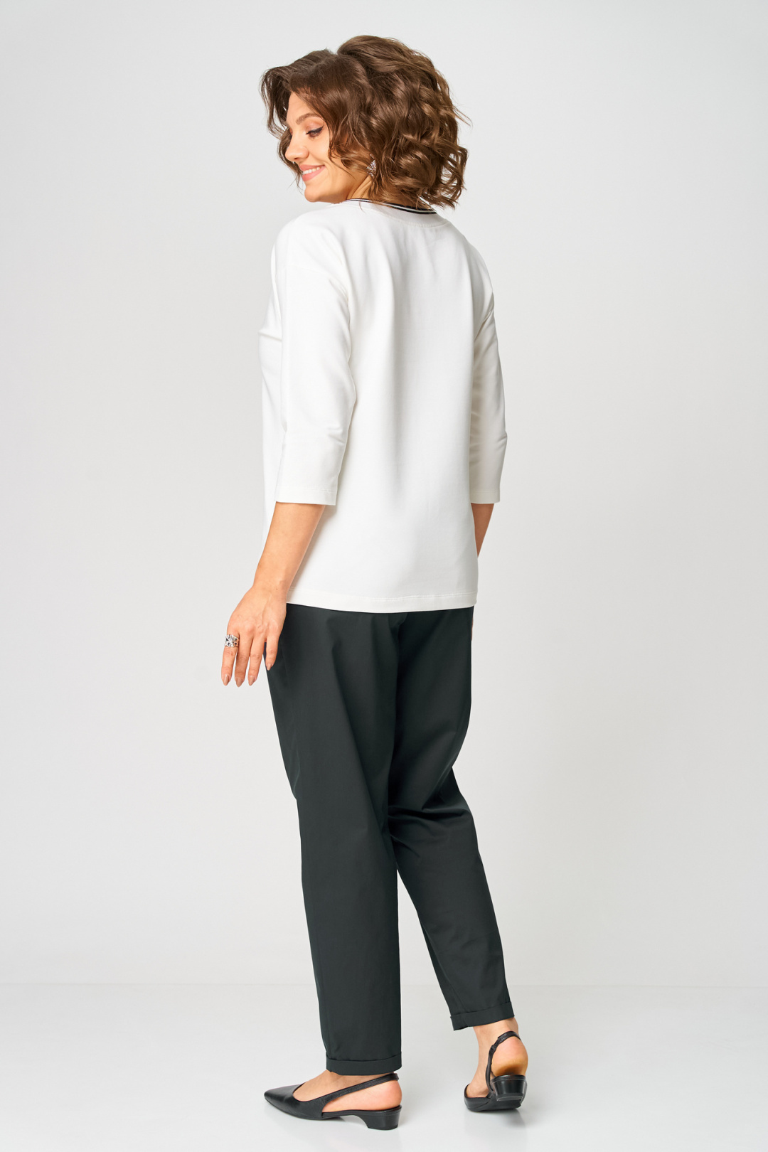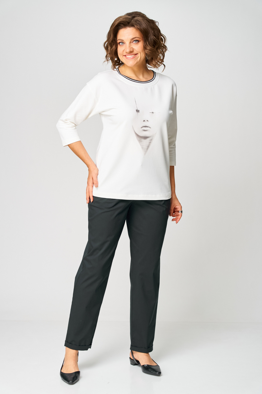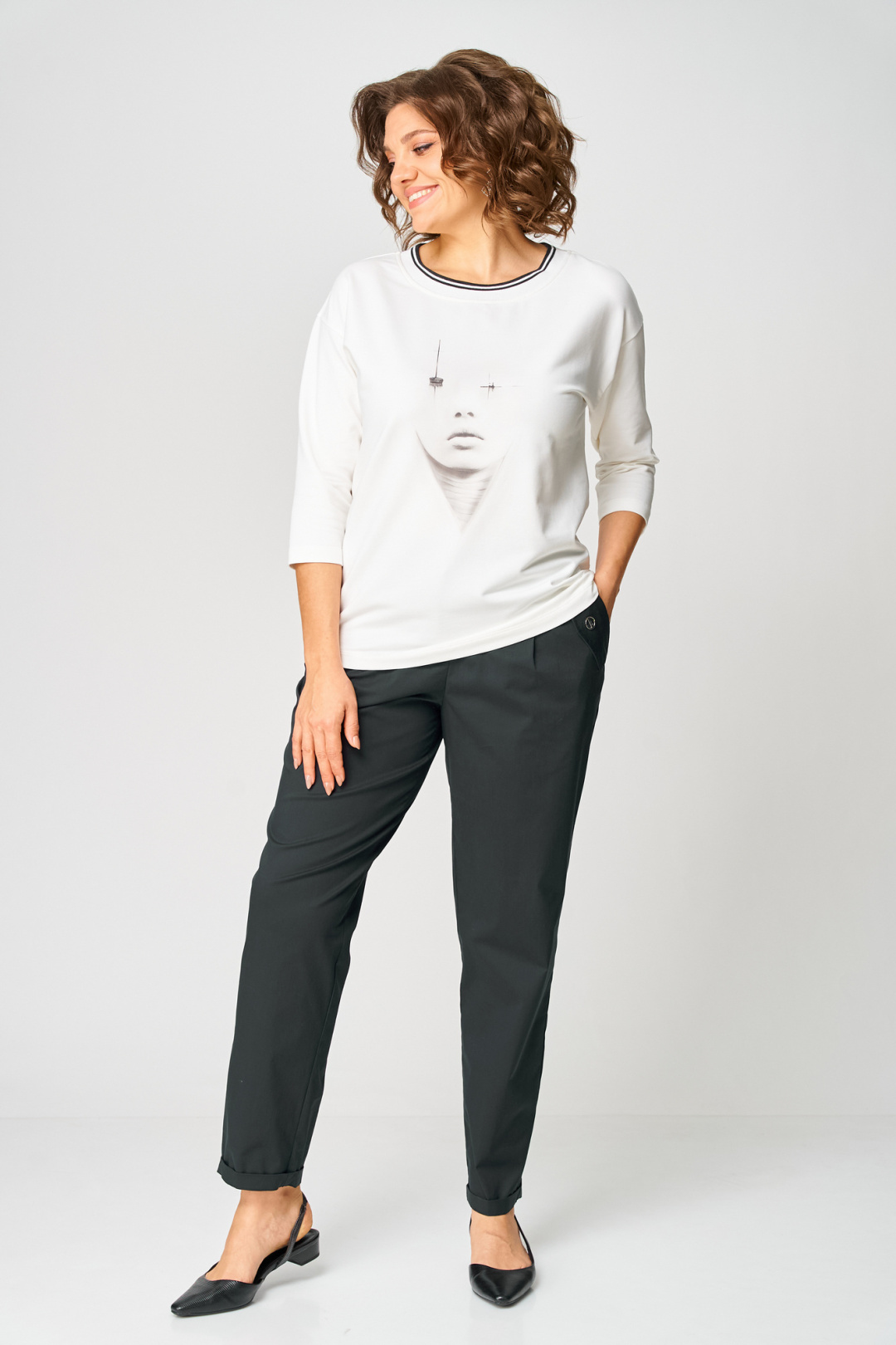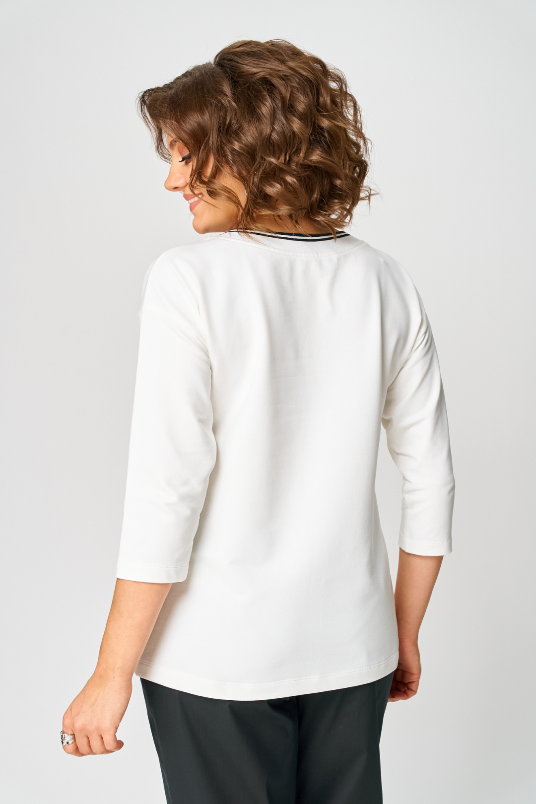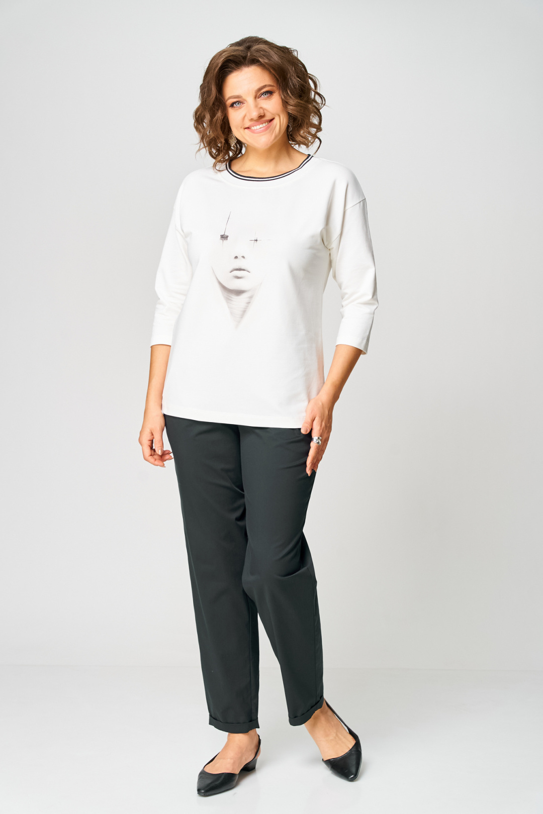 Элегантный женский джемпер белого цвета, выполнен из мягкой трикотажной ткани (двунитка), идеально подходит для создания повседневного образа. Модель с оригинальным спущенным плечом и рукавами 3/4 обеспечивает свободу движений и комфорт. Круглый вырез горловины аккуратно обработан довязом, добавляя изысканности в общий вид. Привлекает внимание стильный графический принт на передней части джемпера, вносящий акцент и уникальность в образ. Спинка изделия выполнена без среднего шва, что подчеркивает гладкость и цельность фасона. Этот джемпер станет отличным дополнением к вашему гардеробу, сочетая в себе моду и комфорт.