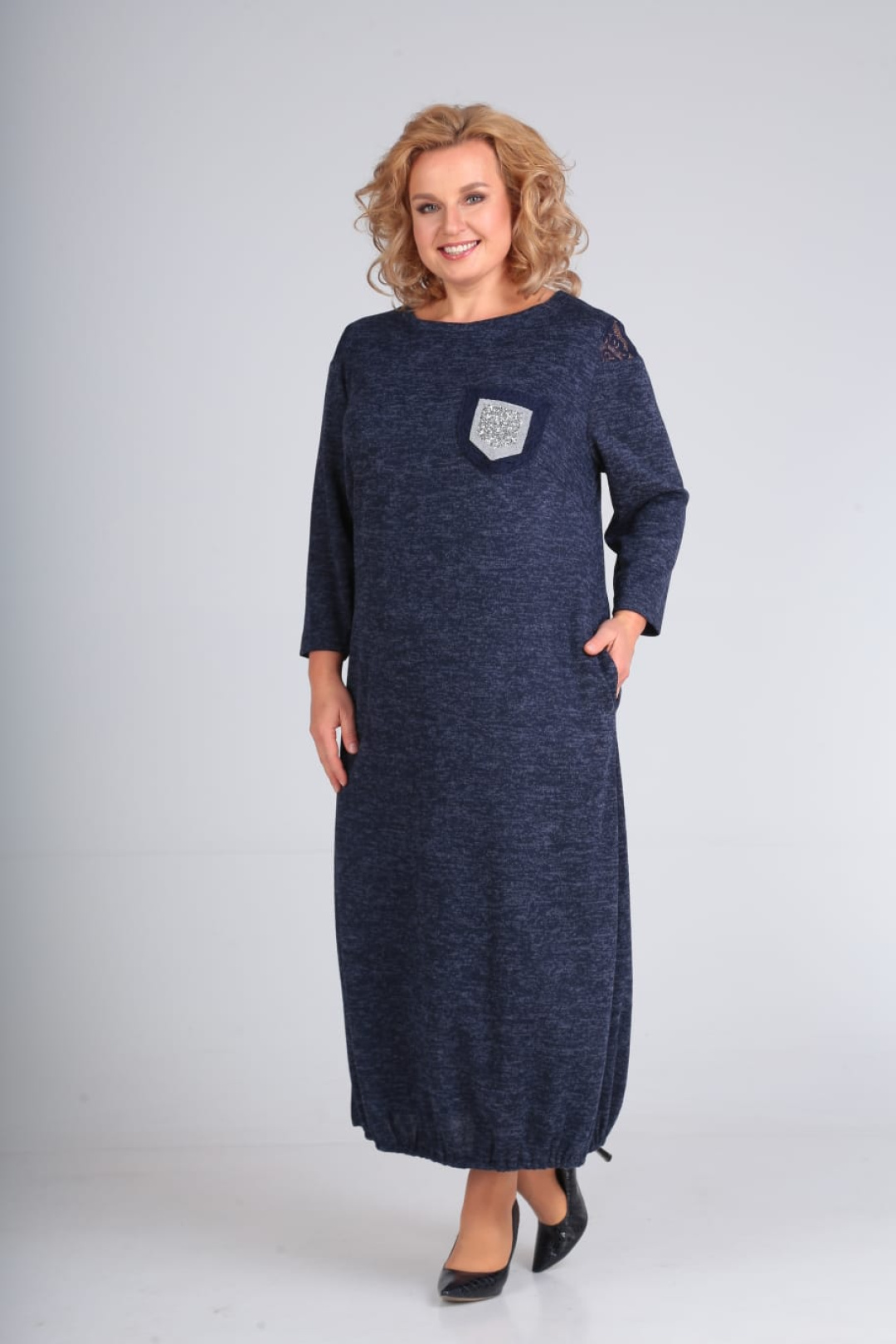 Силуэт полуприлегающий, расширенный книзу. Рукав втачной, одношовный. Вверху рукав с отрезным окатом из кружева. Длина рукава 50 см. Горловина платья закруглённой формы, оформлена отрезной бейкой. Перед с нагрудными вытачками и накладным карманом из кружева. Карман декорирован настрочной аппликацией со стразами. Спинка со средним швом. В боковых швах платья на уровне линии бёдер выполнены потайные карманы. Внизу боковых швов выполнены разрезы высотой 16 см. Низ платья присобран на резинку. Длина платья 126 см. Платье выполнено из трикотажного полотна