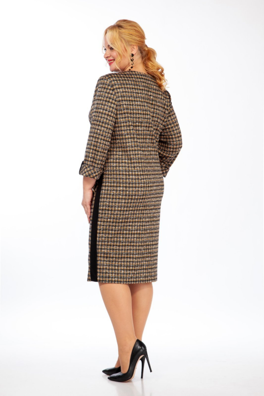 Силуэт полуприлегающий. Рукава втачные, одношовные, внизу с отворотами, закреплёнными патой контрастрого цвета с застёжкой на пуговицу. Длина рукава 47 см. Горловина закруглённая, на обтачке. Перед с нагрудными вытачками. Верх переда с кокетками контрастного цвета. Возле кокеток пришиты 3 декоративные пуговицы. По боковым швам платье отделано вставками контрастного цвета. Спереди, на уровне бёдер, в боковых швах выполнены потайные карманы. Длина платья по спинке 106 см. Платье выполнено из трикотажного полотна. 62 размер – ПОГ 65, ПОБ 68