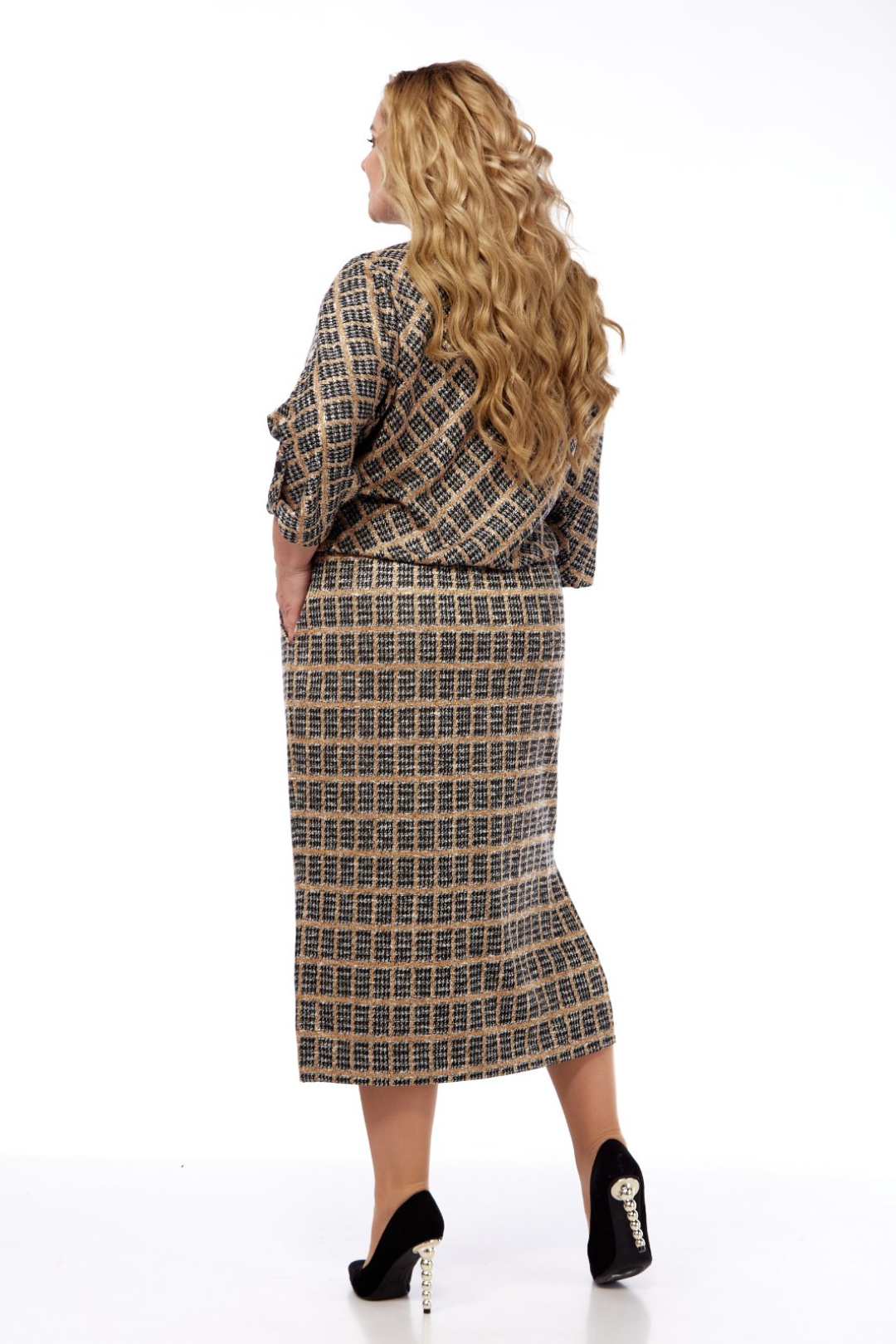 Силуэт полуприлегающий. Рукав цельнокроеный, «летучая мышь». Низ рукава драпируется патой с застёжкой на пуговицу. Длина рукава от горловины 55см. Горловина закруглённая, на обтачке. По линии талии платье отрезное. По подрезу выполнена сборка на резинку. Верхняя часть платья на подкладке, фиксирующей напуск. По бокам нижней части переда выполнены карманы с косой линией входа. Внизу по боковым швам платье с разрезами. Длина платья 121 см. Платье выполнено из трикотажного полотна.