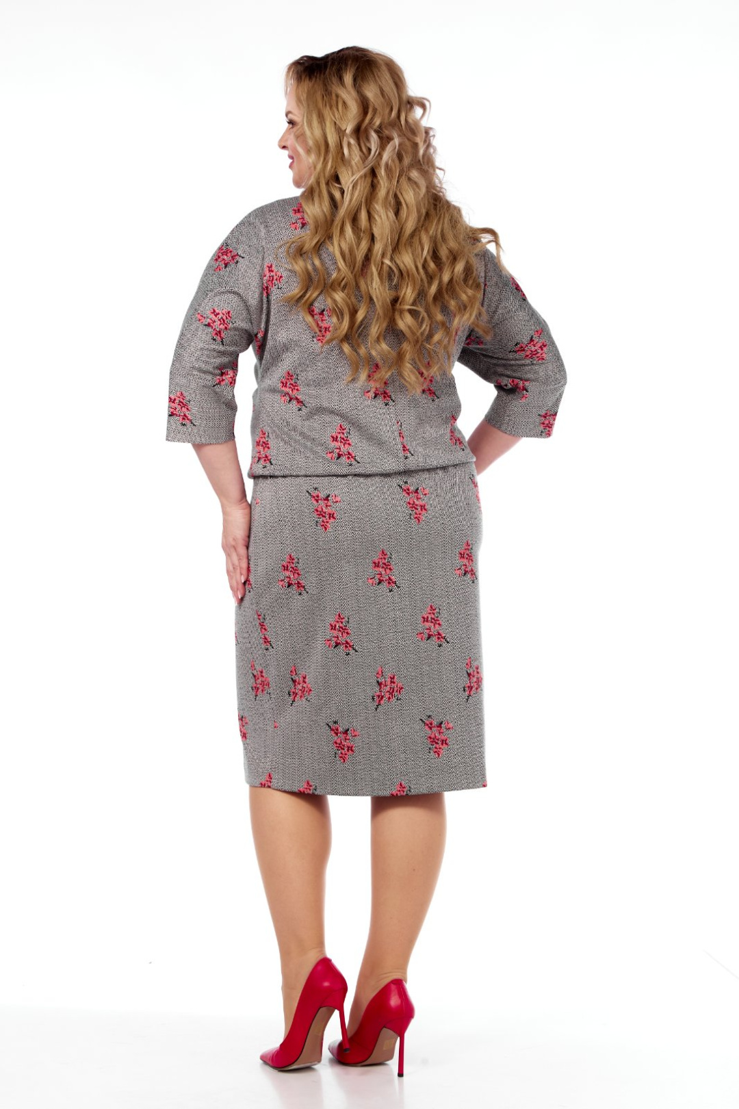 Силуэт полуприлегающий. Рукав цельнокроеный, «летучая мышь». Внизу по центру рукава выполнен разрез. Длина рукава от горловины 53 см. Горловина закруглённая, на обтачке. По линии талии платье отрезное. По подрезу выполнена сборка на резинку. Верхняя часть платья на подкладке, фиксирующей напуск. Длина платья 104 см. Платье выполнено из трикотажного полотна