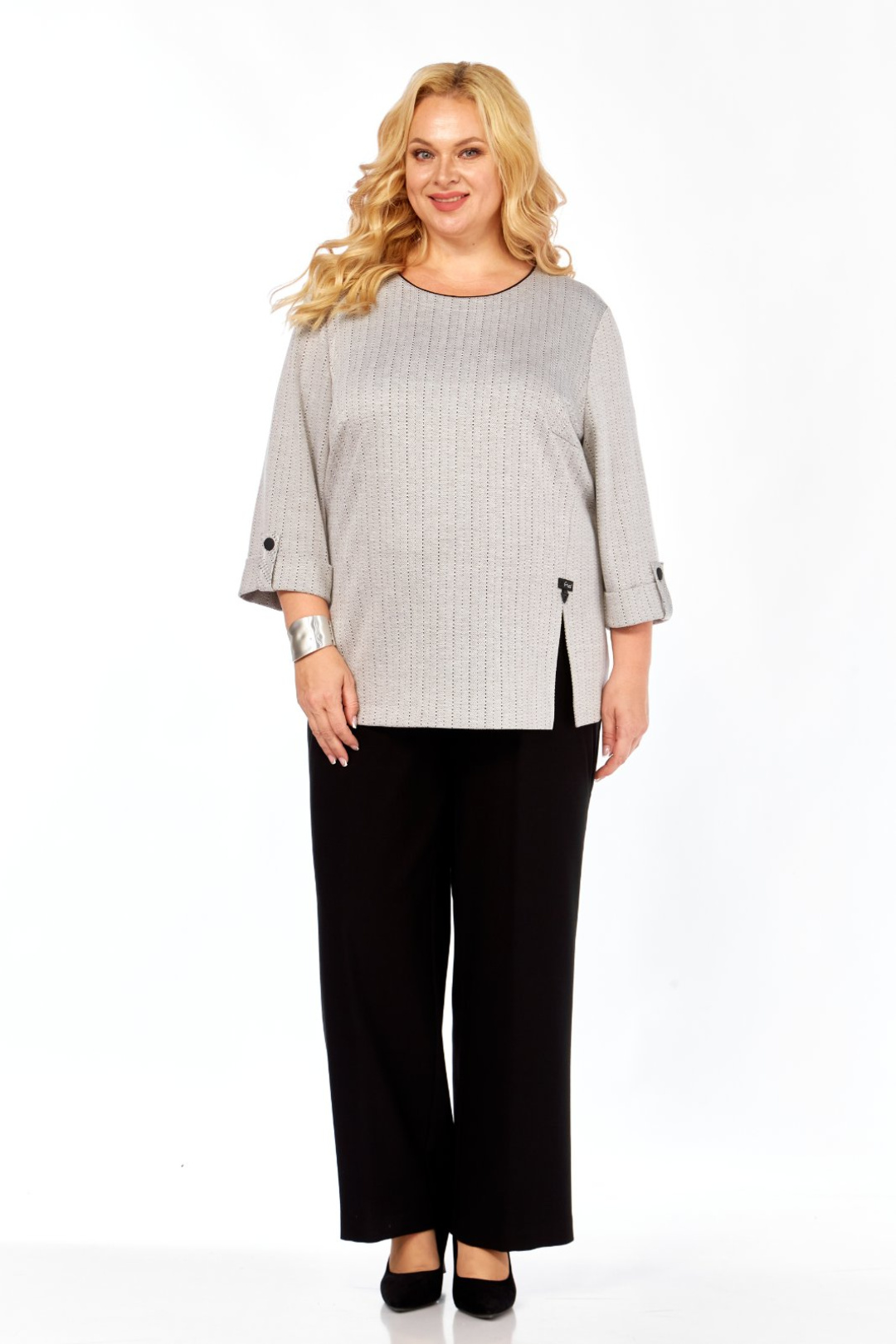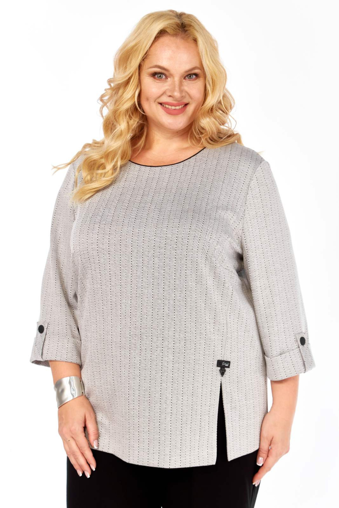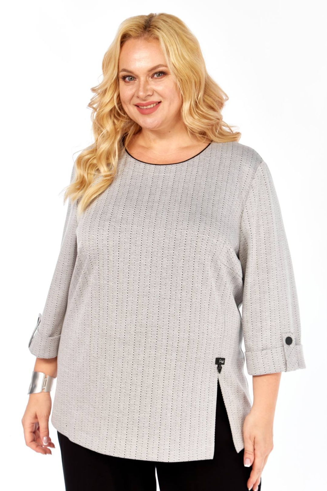 ные патой с застёжкой на пуговицу. Горловина закруглённая, на обтачке с контрастным кантиком, которая закреплена отделочной строчкой. Перед с нагрудными вытачками. С левой стороны, от вытачки вниз выполнен рельеф с разрезом внизу. Разрез декорирован пришивным элементом. Длина джемпера 70 см. Джемпер выполнен из трикотажного полотна.