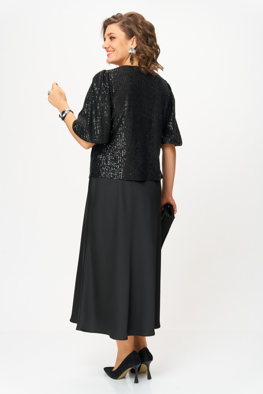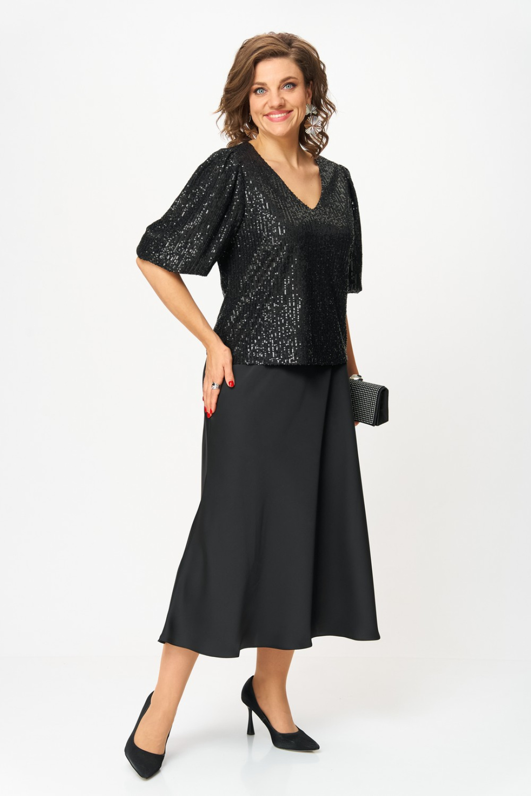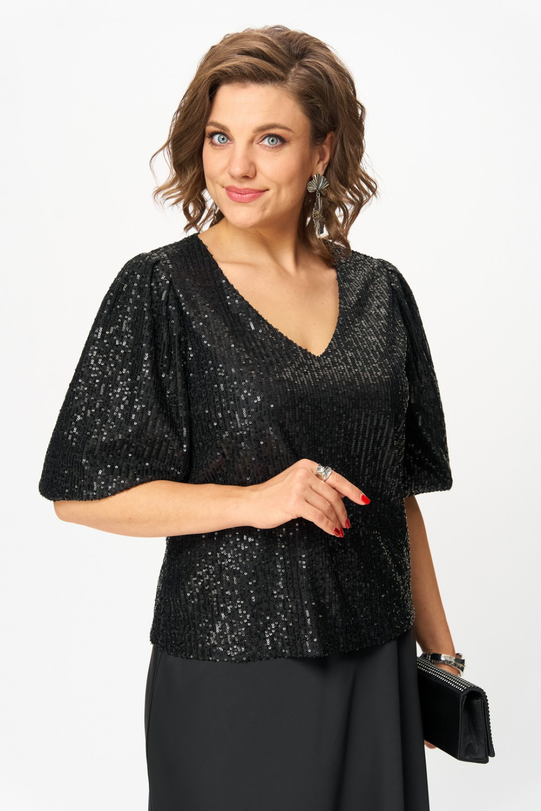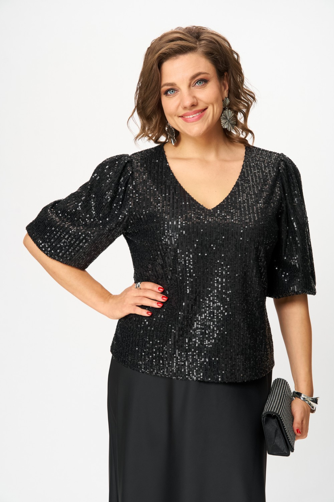 Блузка из ткани в пайетки прямого силуэта с втачным рукавом, на трикотажной подкладке. Вырез горловины v-образный формы. Рукава длиной ¾ объемные к низу, добавляют романтичности и легкости. По окату рукава складки, по низу рукава резинка.
