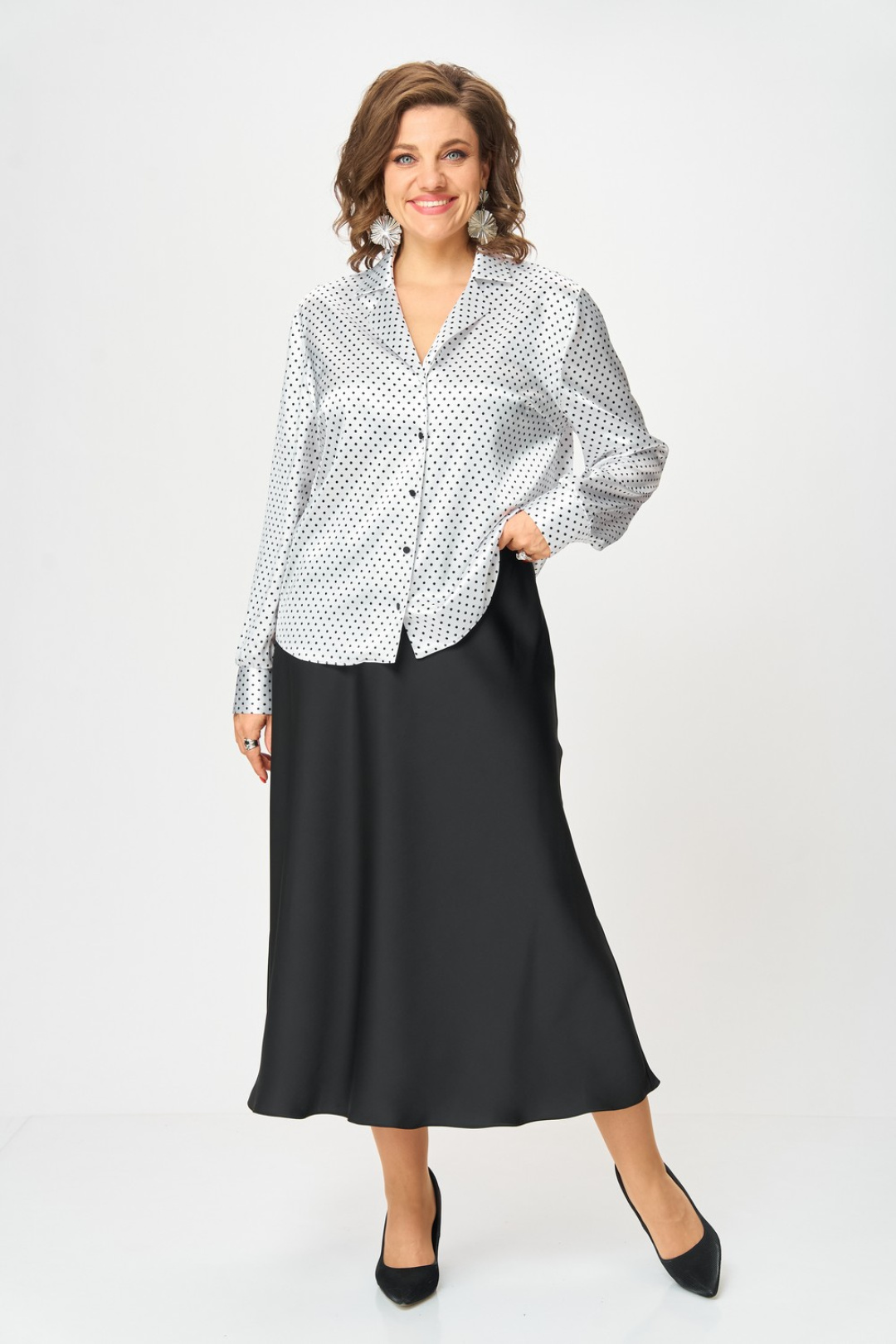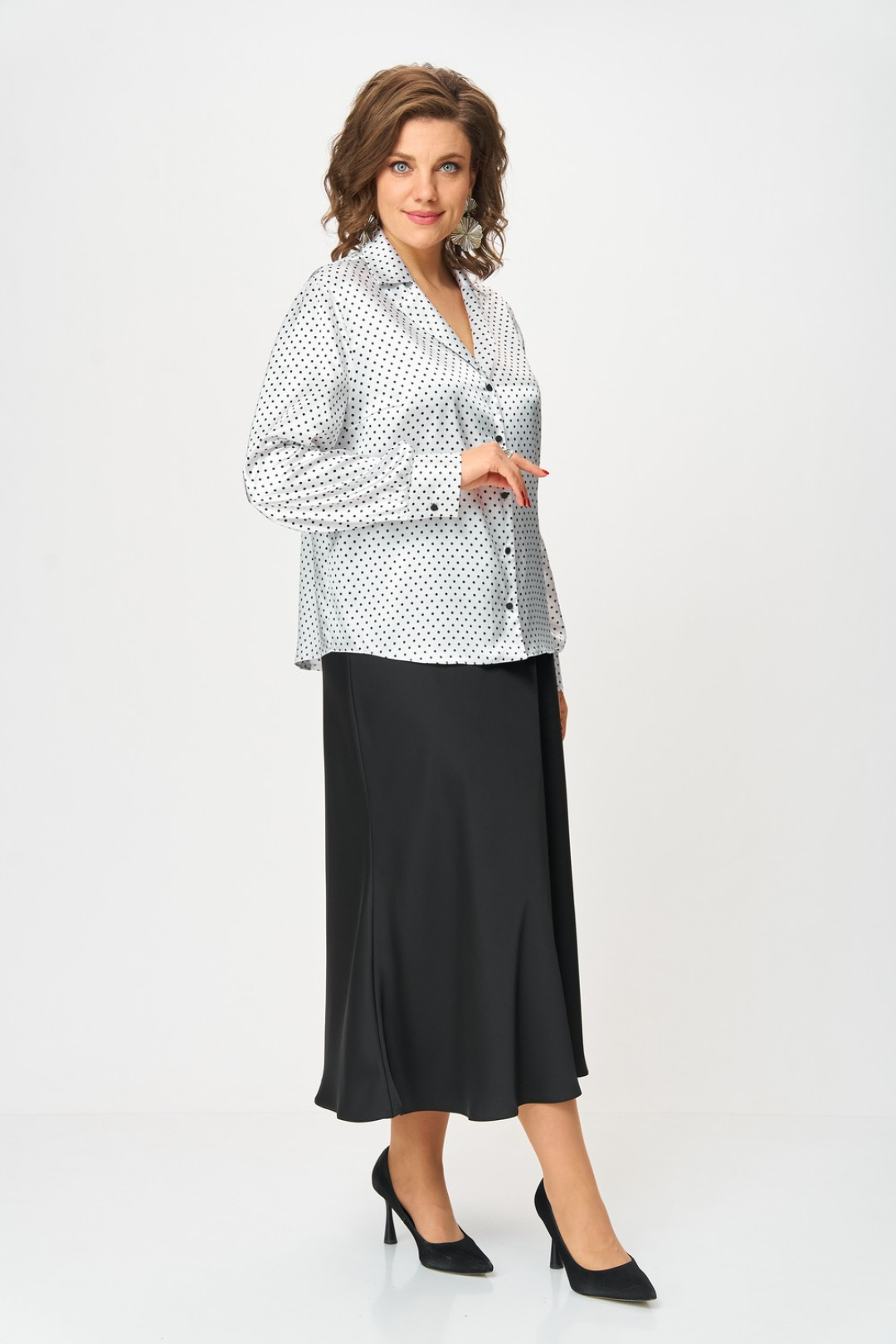 Блузка женская прямого силуэта с втачным рукавом. Линия плеча слегка спущена. Застежка центральная на петли и пуговицы. Воротник отложной с лацканами. По линии груди вытачки. Рукав длинный по низу со сборкой и притачной манжетой с застежкой петлю и пуговицу. Линия низа фигурная.