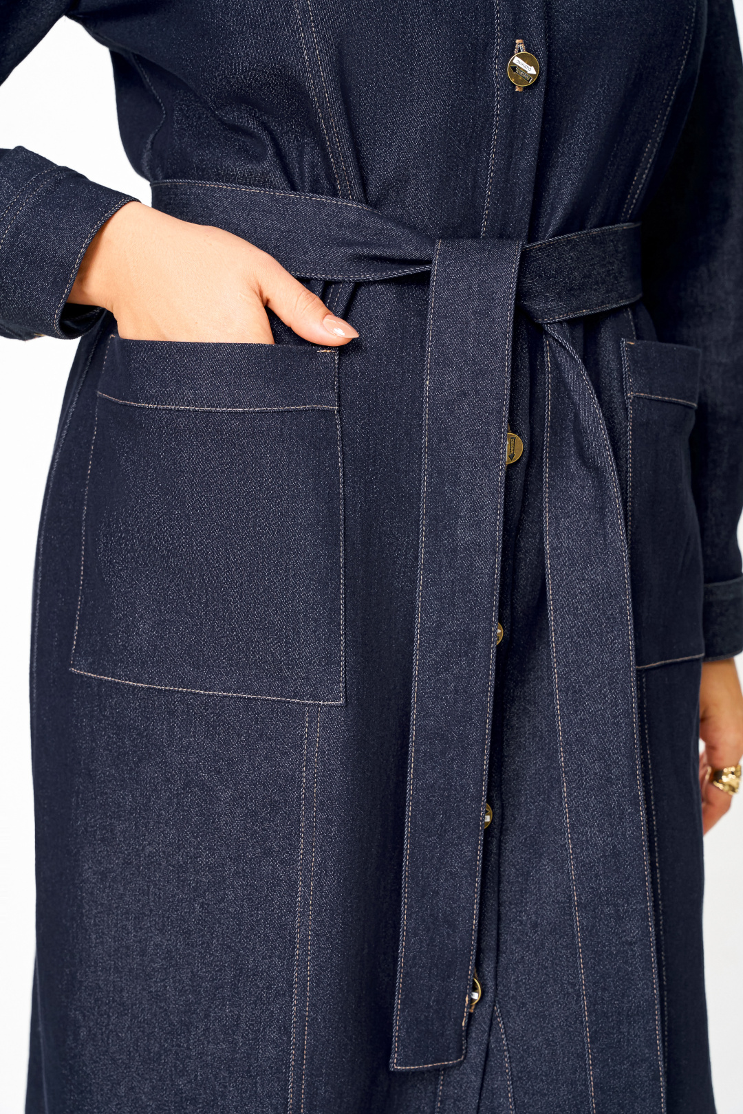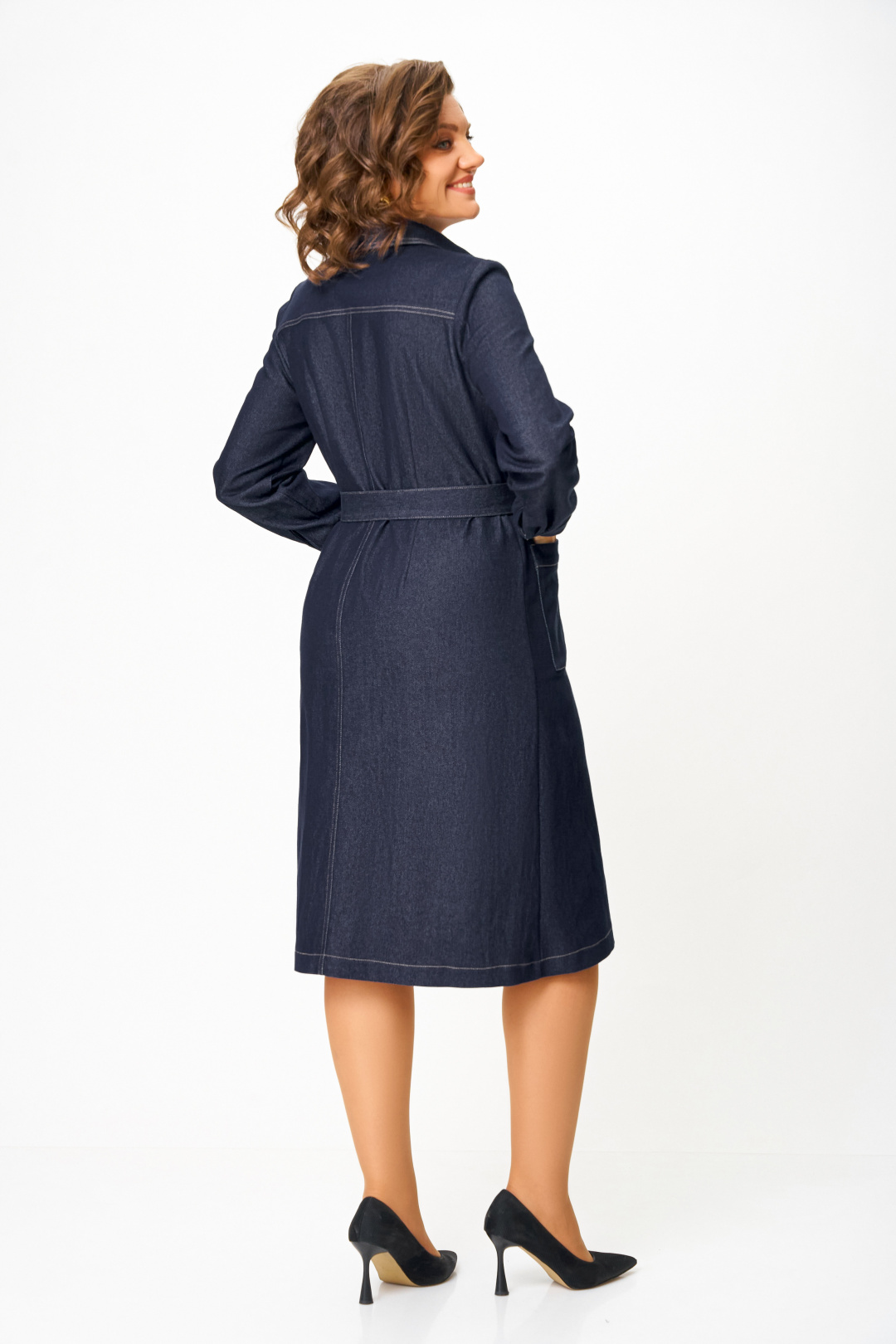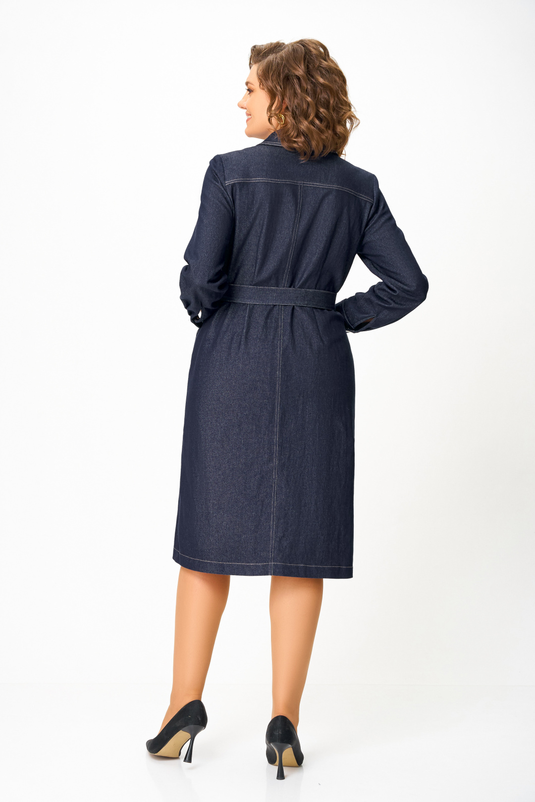 Платье из джинсовой ткани прямого силуэта с центральной застёжкой на петли и джинсовые пуговицы. Полочки с притачными фигурными планками, с рельефным швом и кокеткой, на уровне бёдер накладной карман с планкой и фирменной нашивкой «Swallow».
