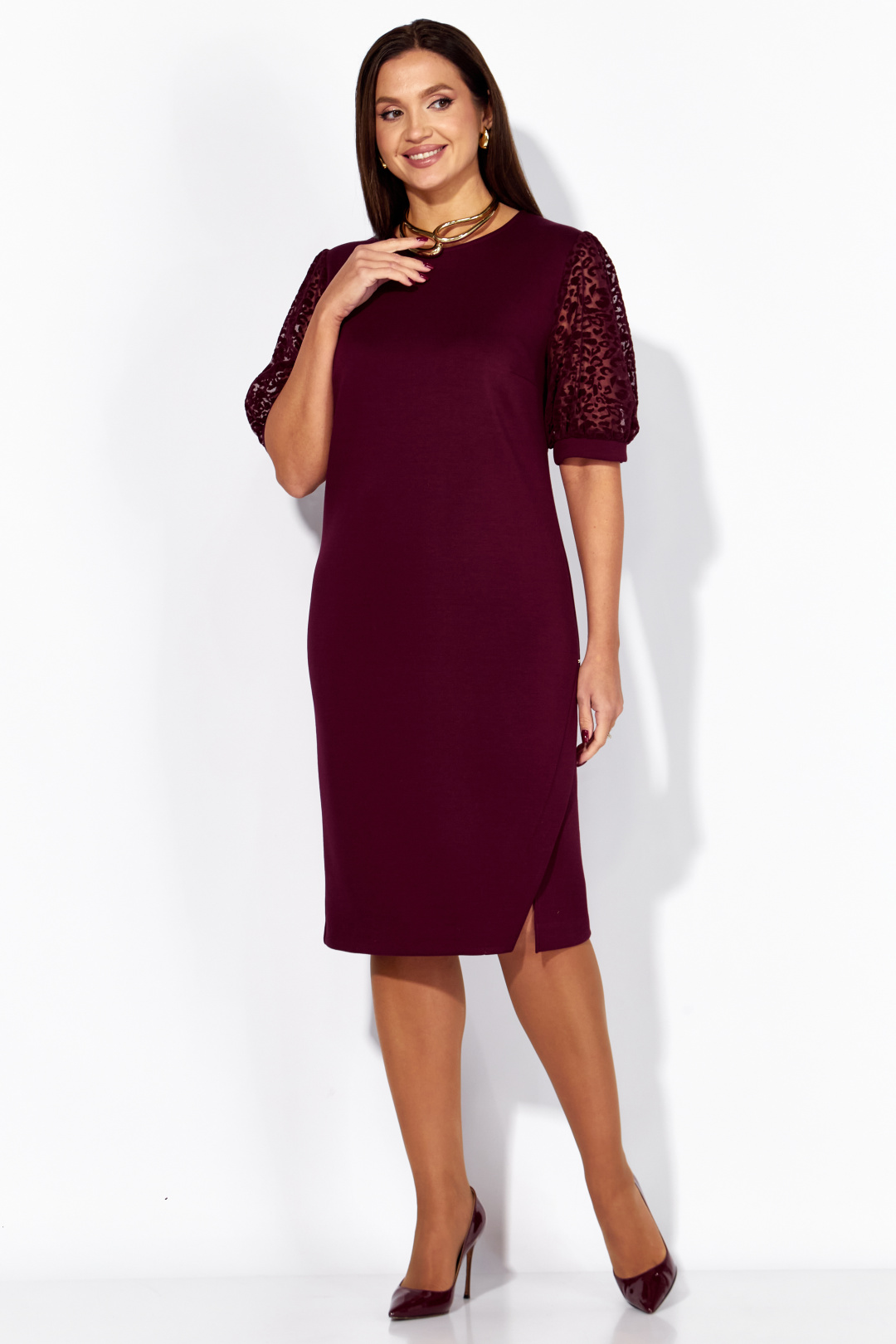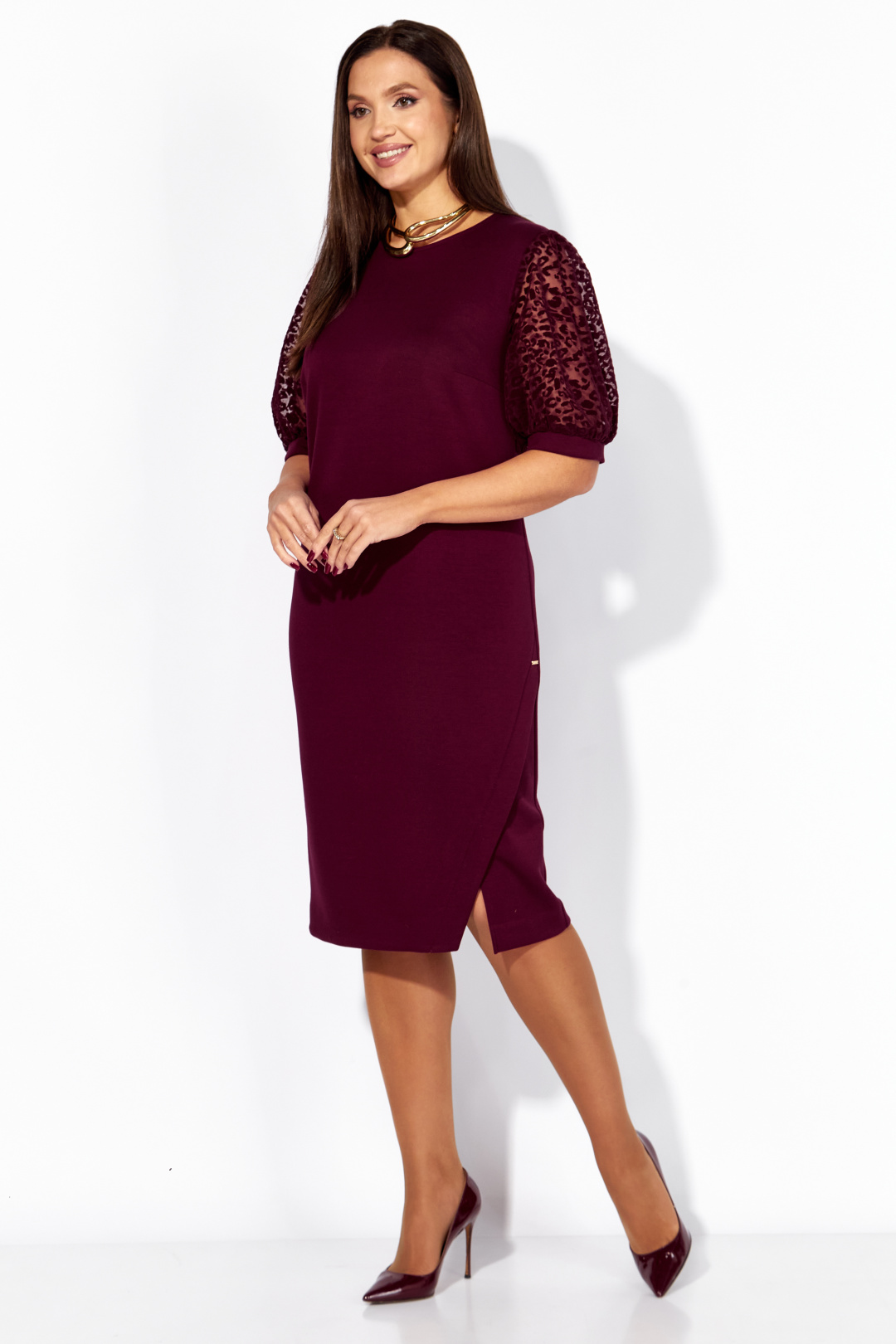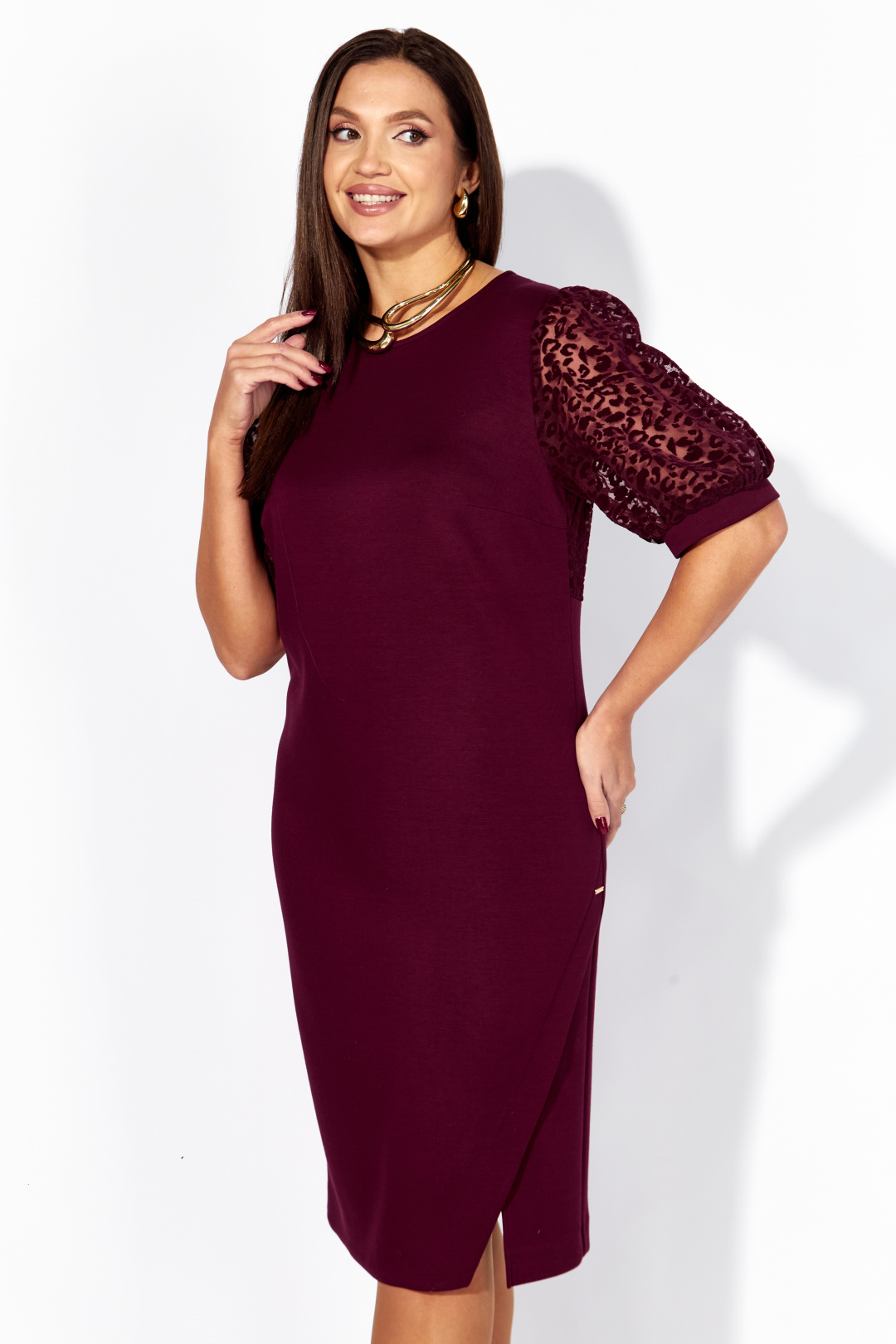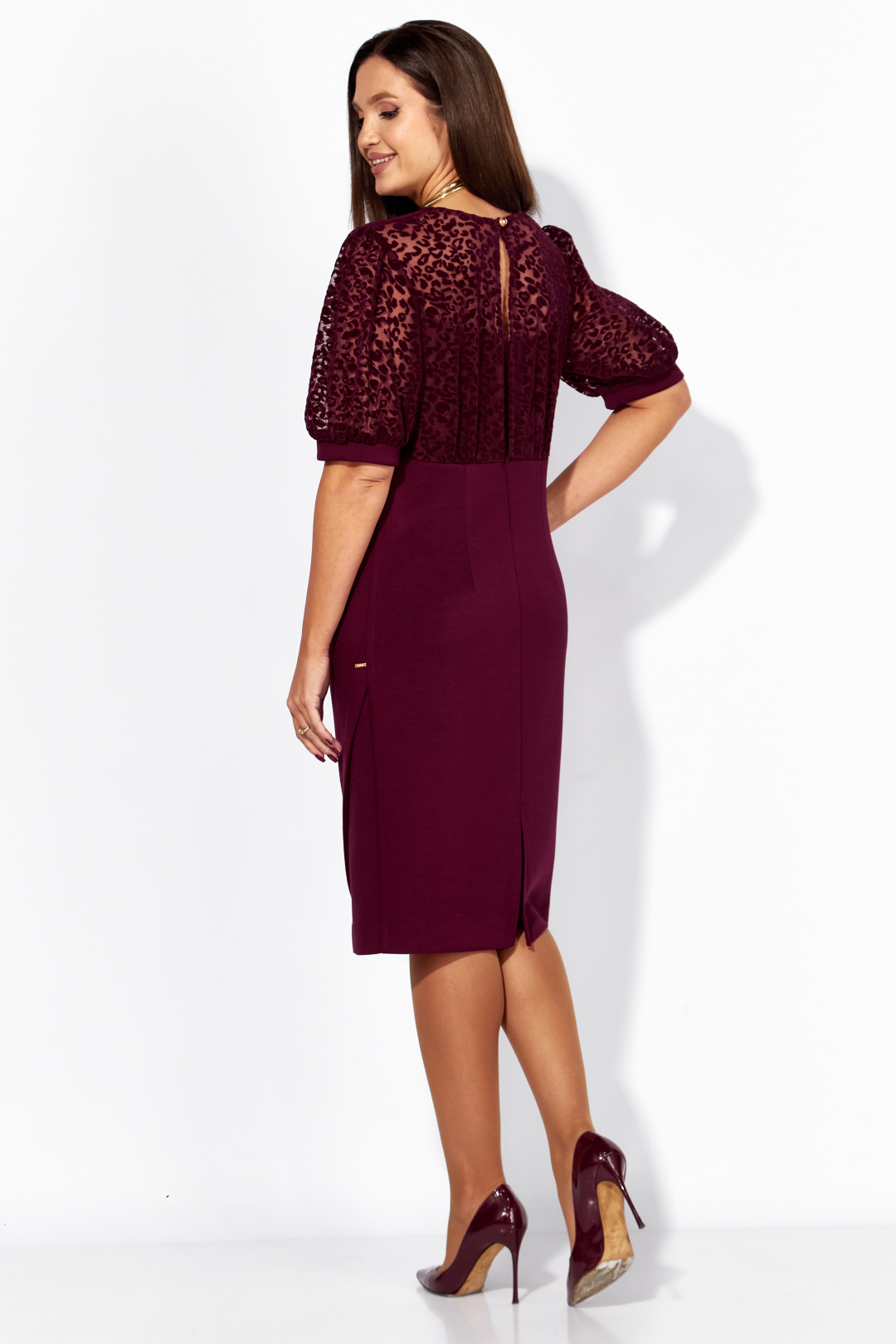 Платье женское, полуприлегающего силуэта с коротким рукавом. Рукав типа "фонарик" со сборкой сверху и снизу. По низу притачная манжета. По переду нагрудные вытачки. Горловина круглой формы. По низу асимметричная, отлетная планка с разрезом и декоративная нашивка. По спинке средний шов с разрезом снизу и талевые вытачки. Горизонтальный подрез выше линии талии. Верхняя часть спинки и рукав выполнены из ткани сетка с флоковым нанесением. Застежка на потайную "молнию"