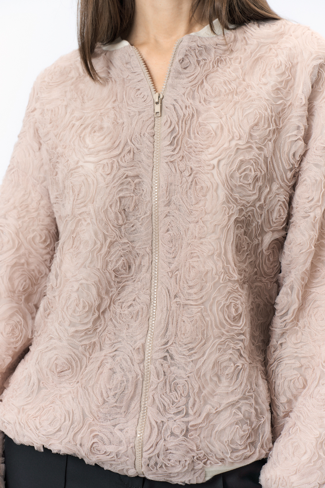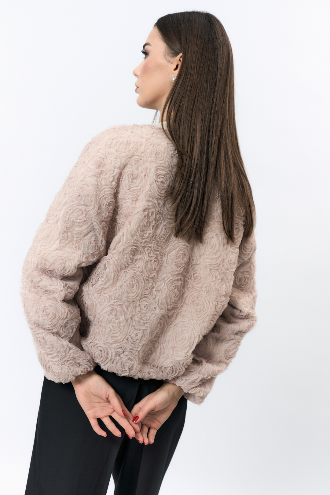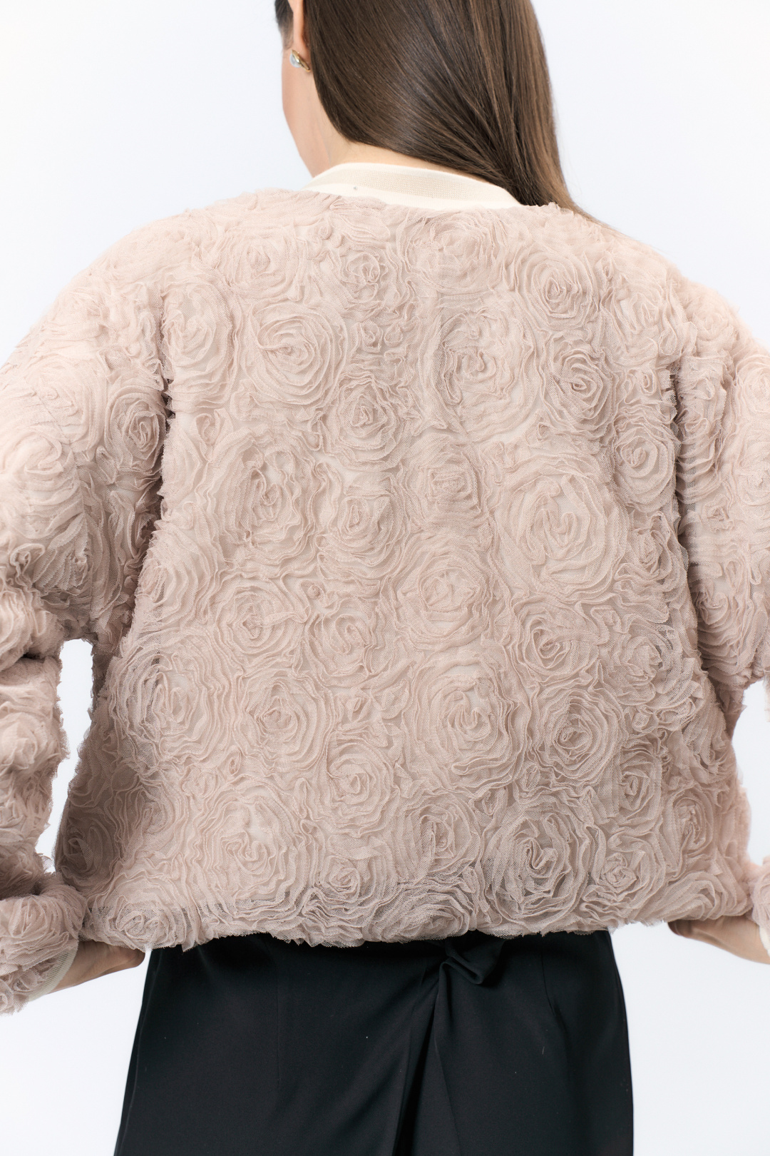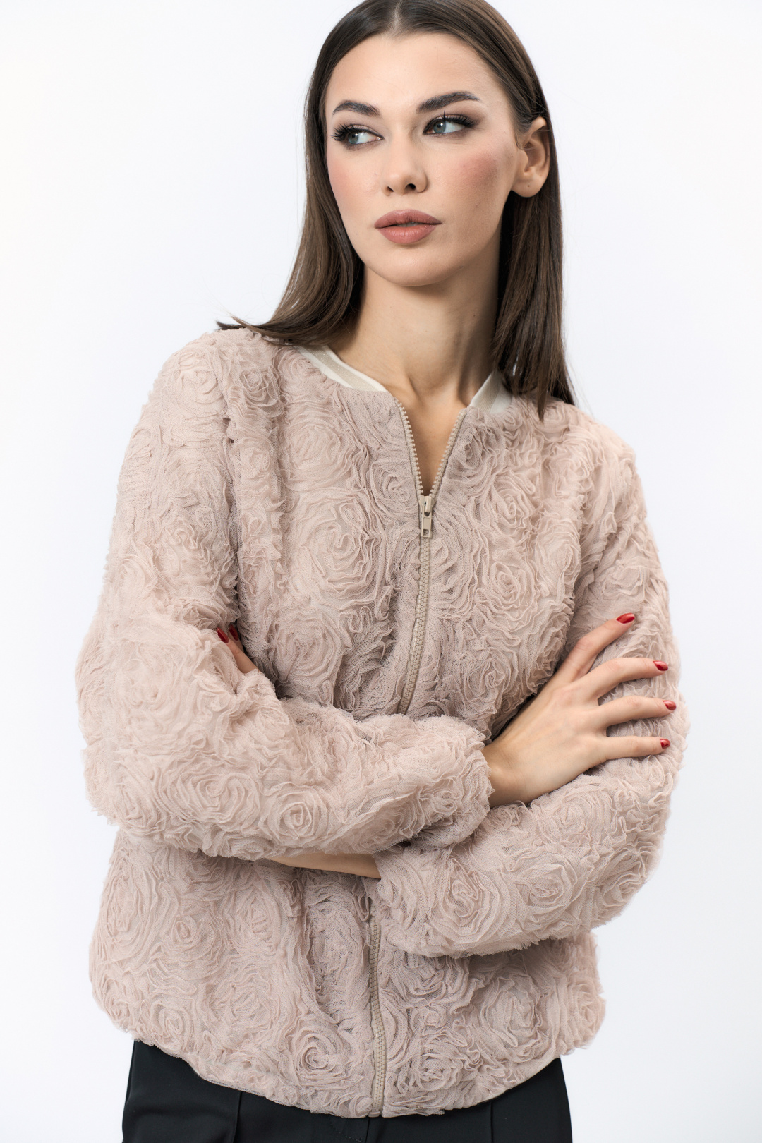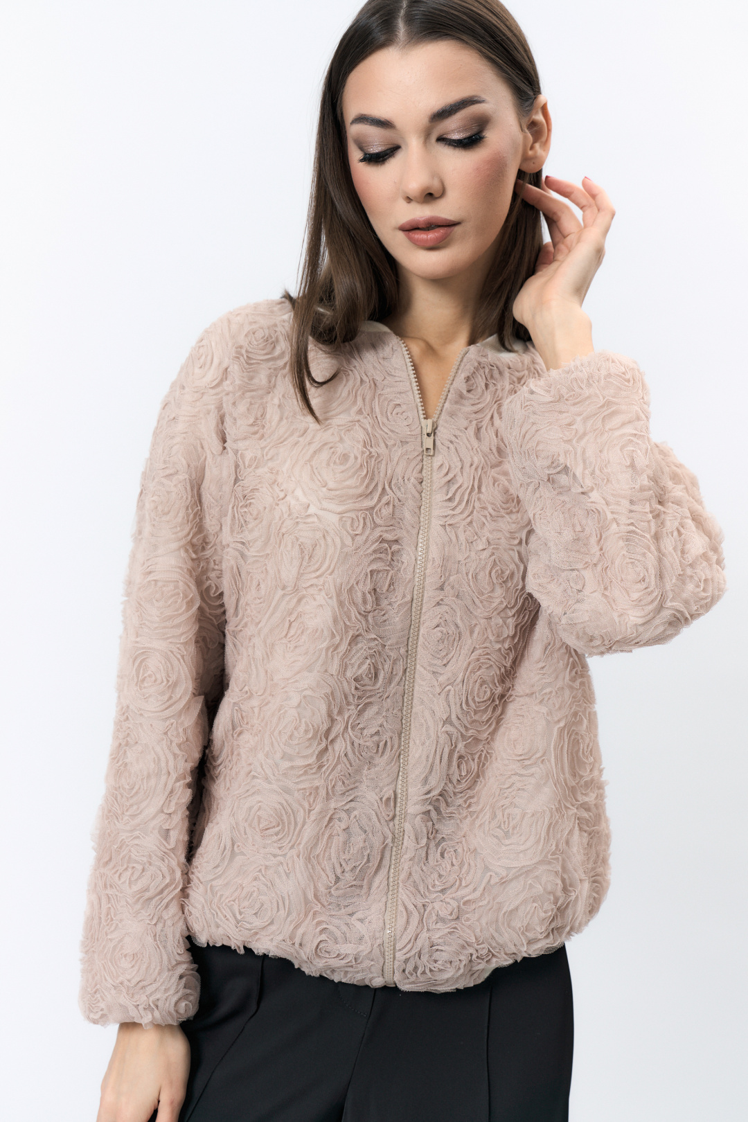 Стильный бомбер. Выполнен из текстильной ткани на подкладке. Изделие с центральной застежкой на металлическую молнию. Горловина со вставкой из отделочной ткани. Рукав спущенный. Низ рукава на резинке. По низу изделия сборка на резинку. Длина рукава 71 см, длина по спинке 60см