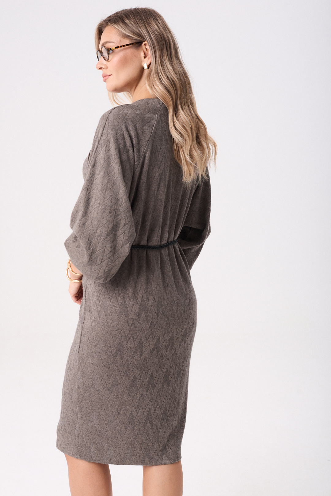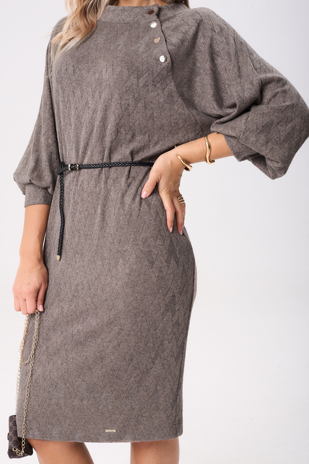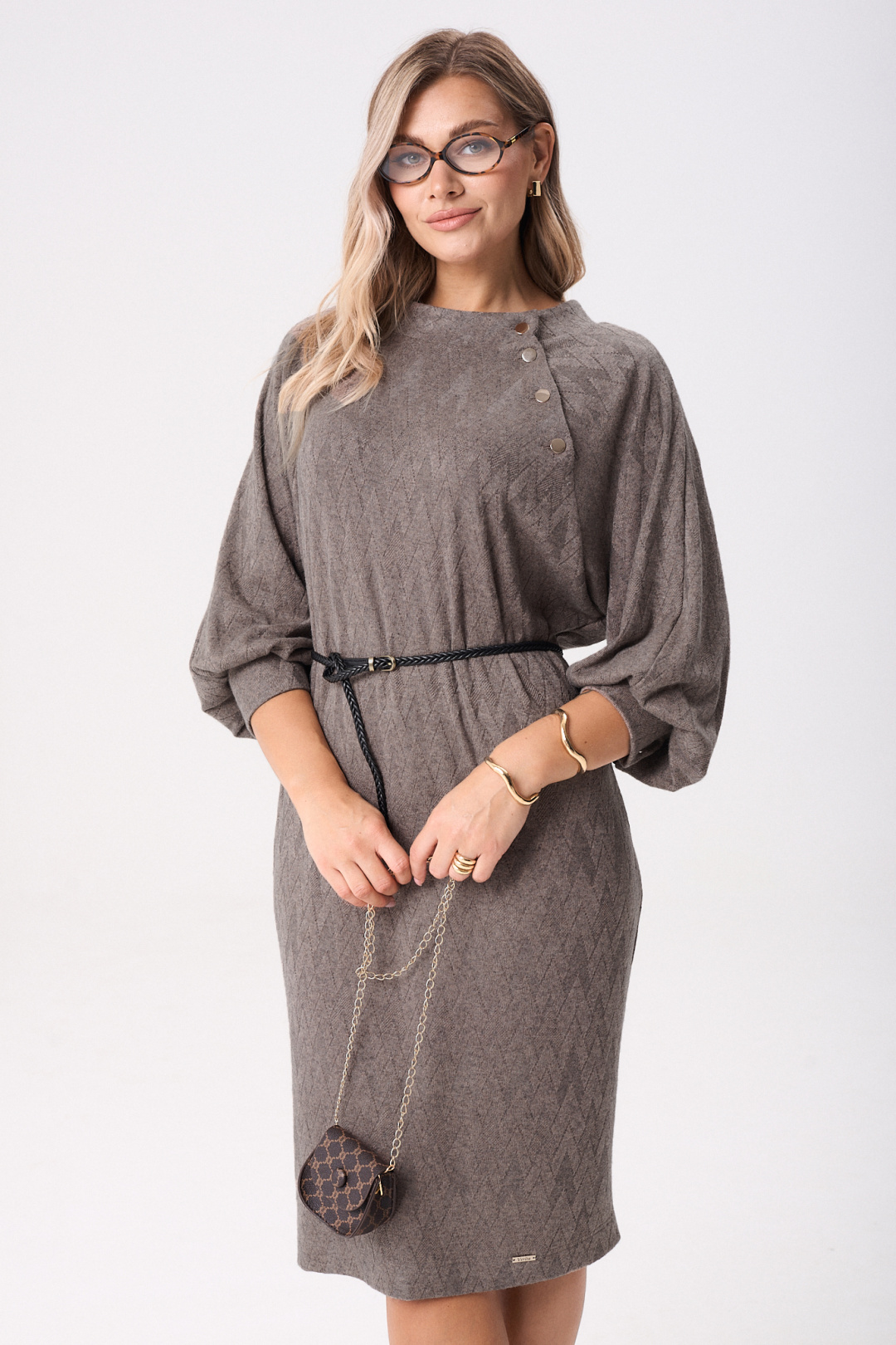 Элегантное трикотажное платье серого цвета с тонким геометрическим узором, создающим визуальный интерес. Модель с рукавом-регланом полной длины на манжете обеспечивает комфорт и свободу движений. Платье выполнено в свободном силуэте, слегка зауженом к низу, что добавляет изящества силуэтам. Горловина со стойкой и дизайнерская застежка на пуговицы подчёркивают утончённый стиль изделия. В комплект входит пояс, позволяющий подчеркнуть талию. Эта модель идеально подходит для создания стильных и комфортных образов для работы и повседневной носки.