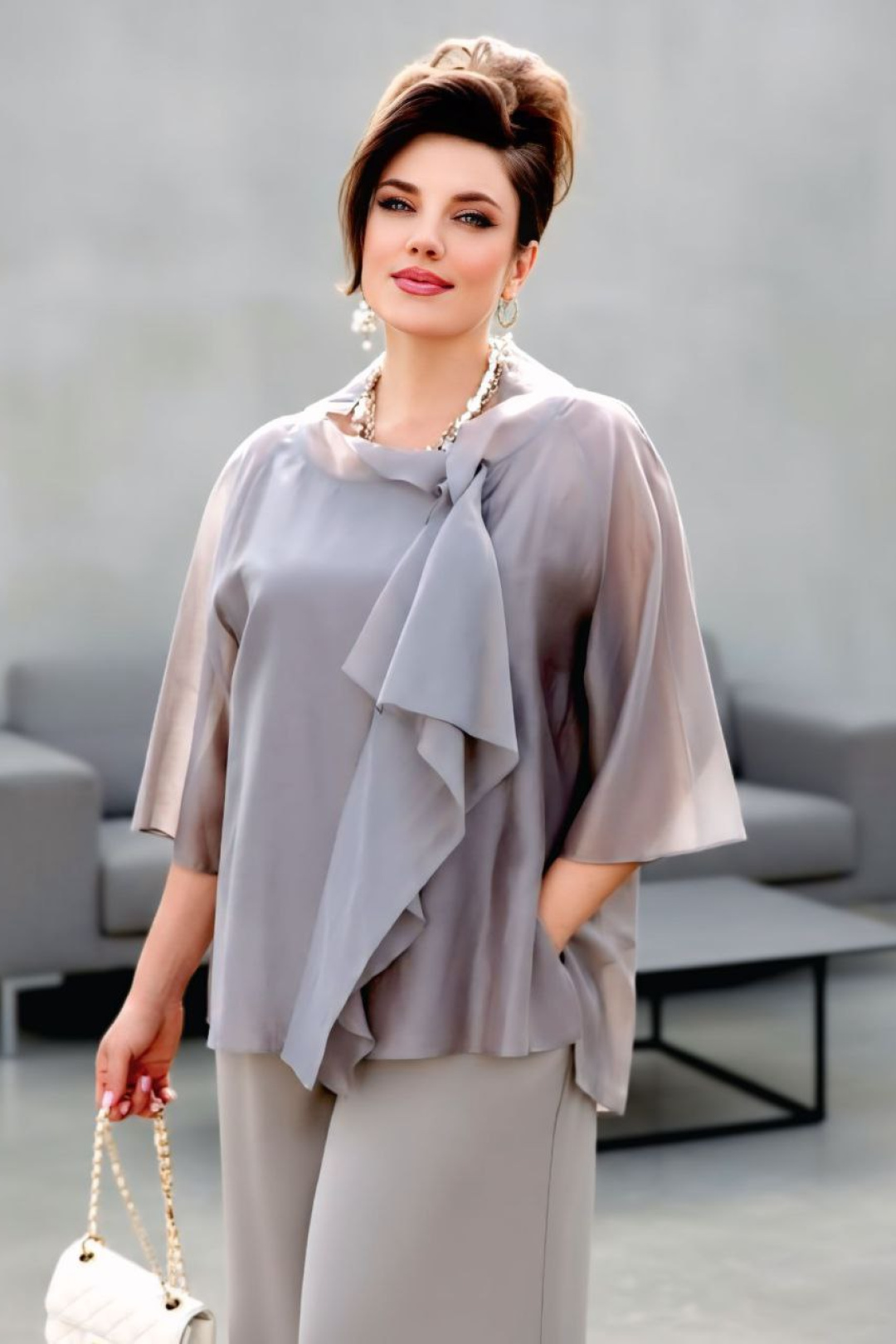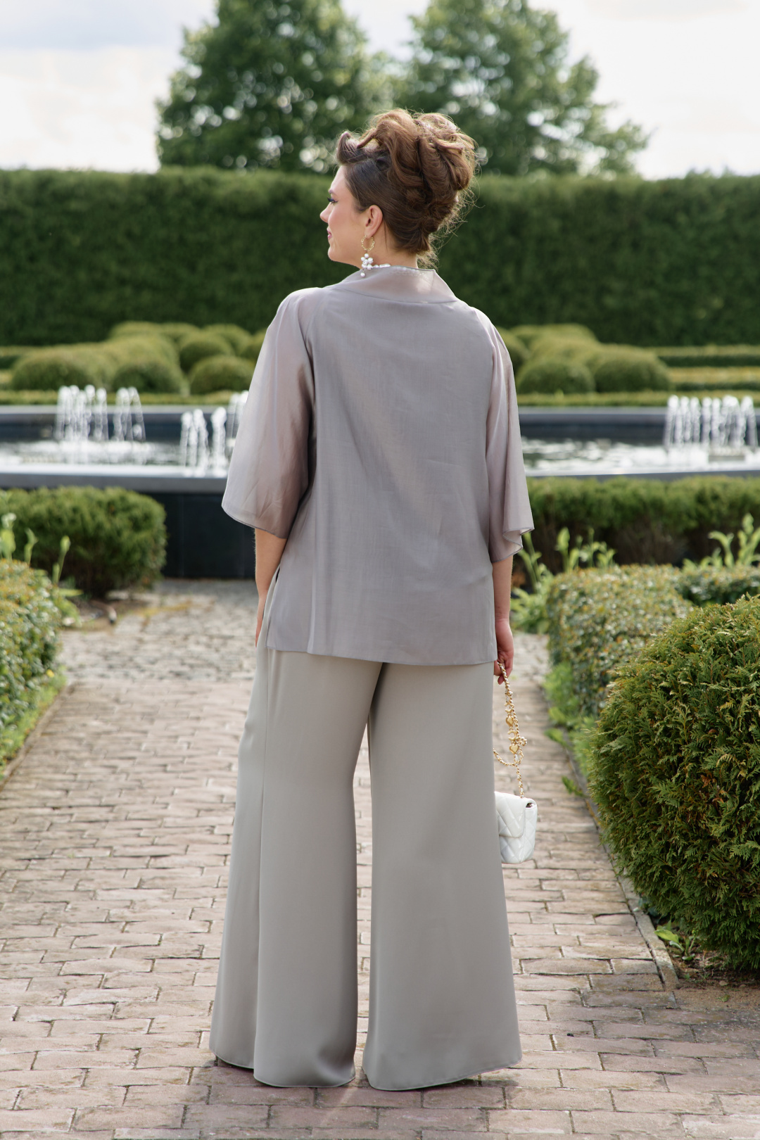 Элегантный брючный костюм, выполненный в мерцающем оттенке, который идеально подходит для создания утонченных образов. Комплект состоит из свободной блузы широких брюк палаццо, обеспечивая непревзойденный комфорт и легкость движений. Блуза привлекает внимание своим асимметричным дизайном с драпировками и широким, ниспадающим воротником, который придает образу динамичность и изысканность. Блуза свободного силуэта, с двойными деталями переда и спинки. Головина округлой формы. Рукав в блузе реглан, длиной ¾, что добавляет силуэту легкости и воздушности. В боковых швах блузы разрезы. Брюки с высокой посадкой и струящимся кроем визуально удлиняют ноги, создавая безупречный и гармоничный ансамбль. Этот костюм идеально подходит как для торжественных мероприятий, так и для деловых встреч, подчеркивая ваш безупречный вкус и чувство стиля. Длина блузы по спинке 68 см. Длина рукава блузы 48 см (р 50-54), 49 см (р 56-60). Длина брюк по боковому шву 108см (р 50-56), 108,5 см (р 58-60).