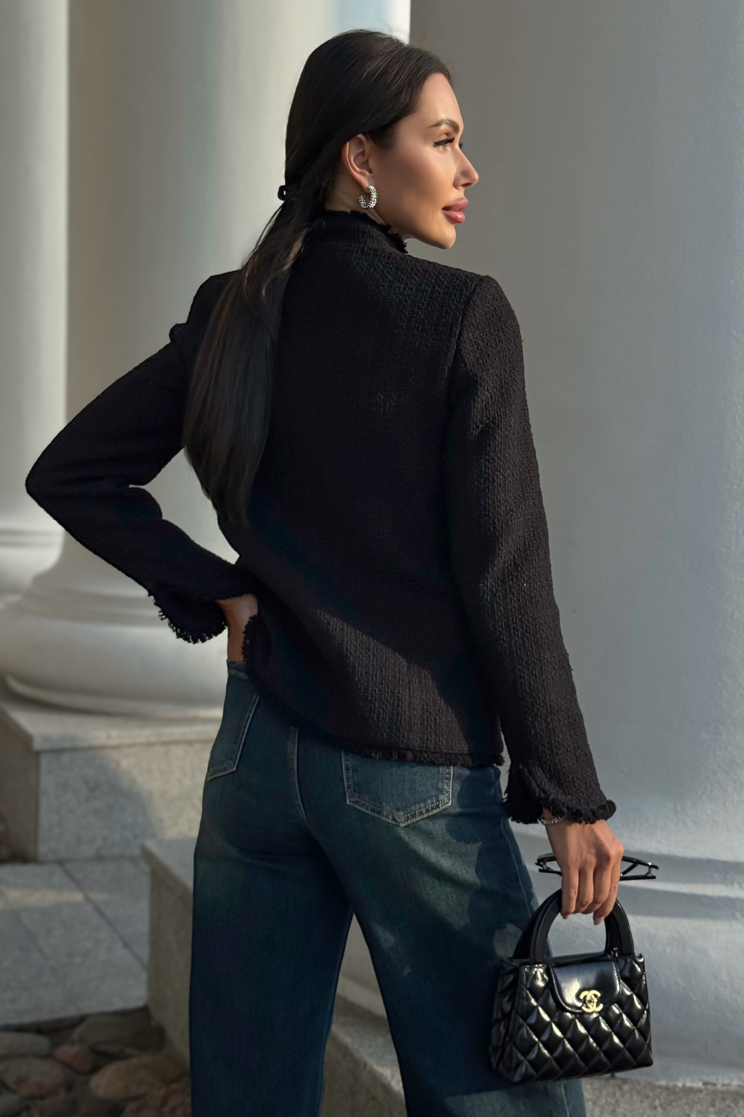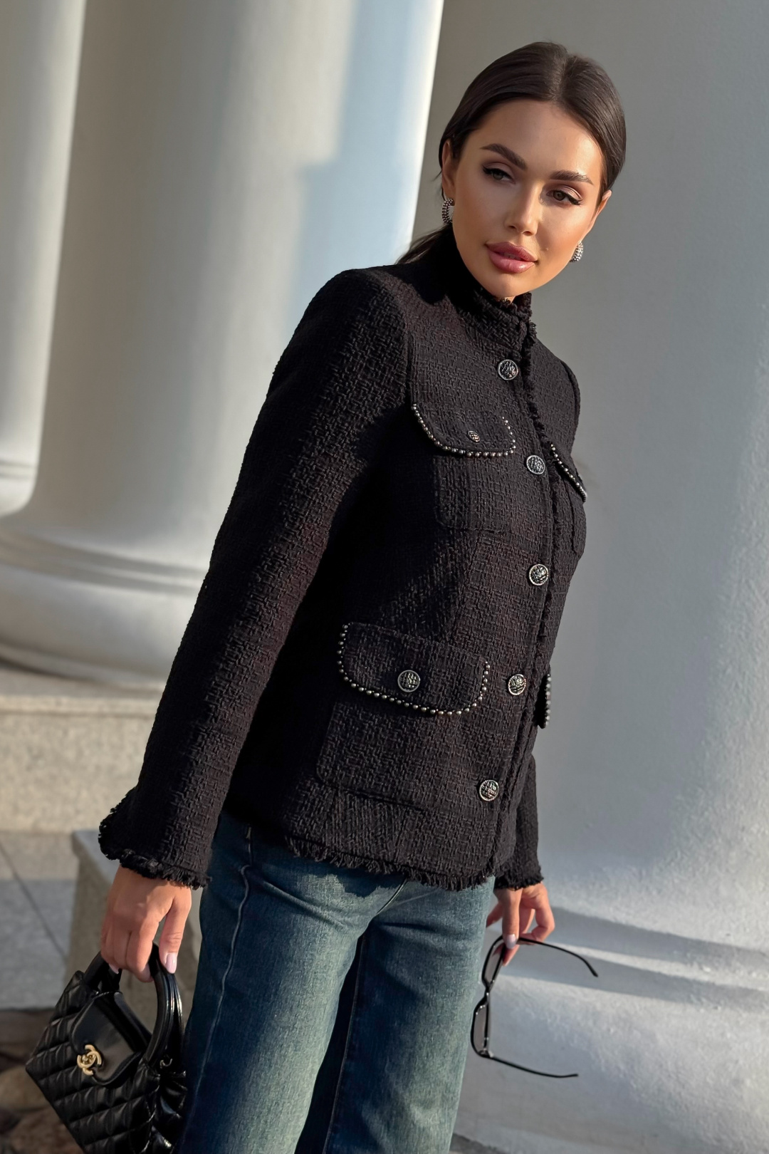 Этот жакет в стиле Шанель выполнен из черного твида, что придает ему особый шарм и элегантность. Красивая отделка и фурнитура дополняют образ, делая его еще более изысканным. Жакет идеально подойдет для создания строгого, но в то же время женственного образа. Он прекрасно сочетается с платьями и юбками, а также с джинсами и брюками. Благодаря качественным материалам и мастерству исполнения, жакет сохранит свою форму и внешний вид на долгое время. В этом жакете вы будете выглядеть стильно и уверенно в любой ситуации.