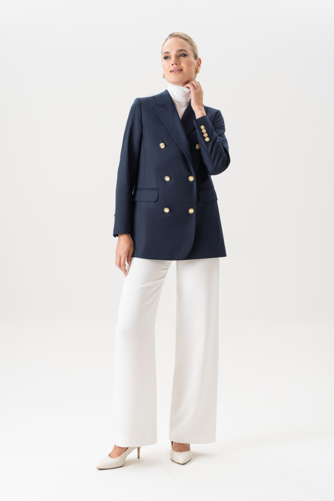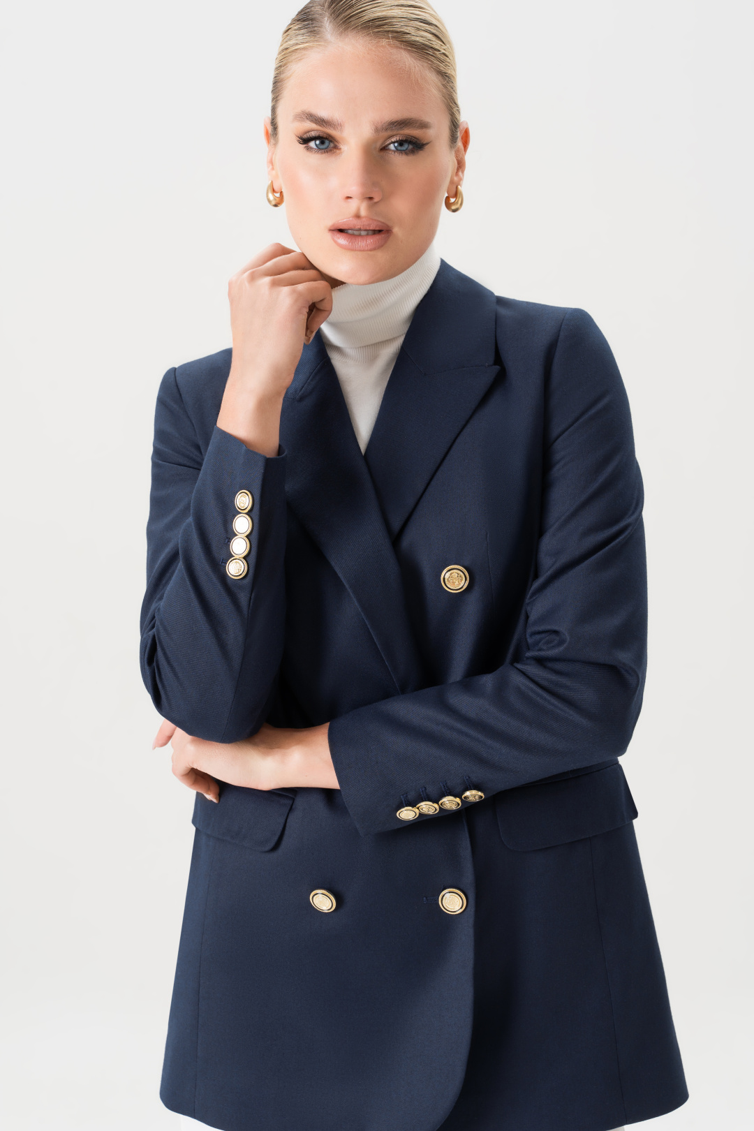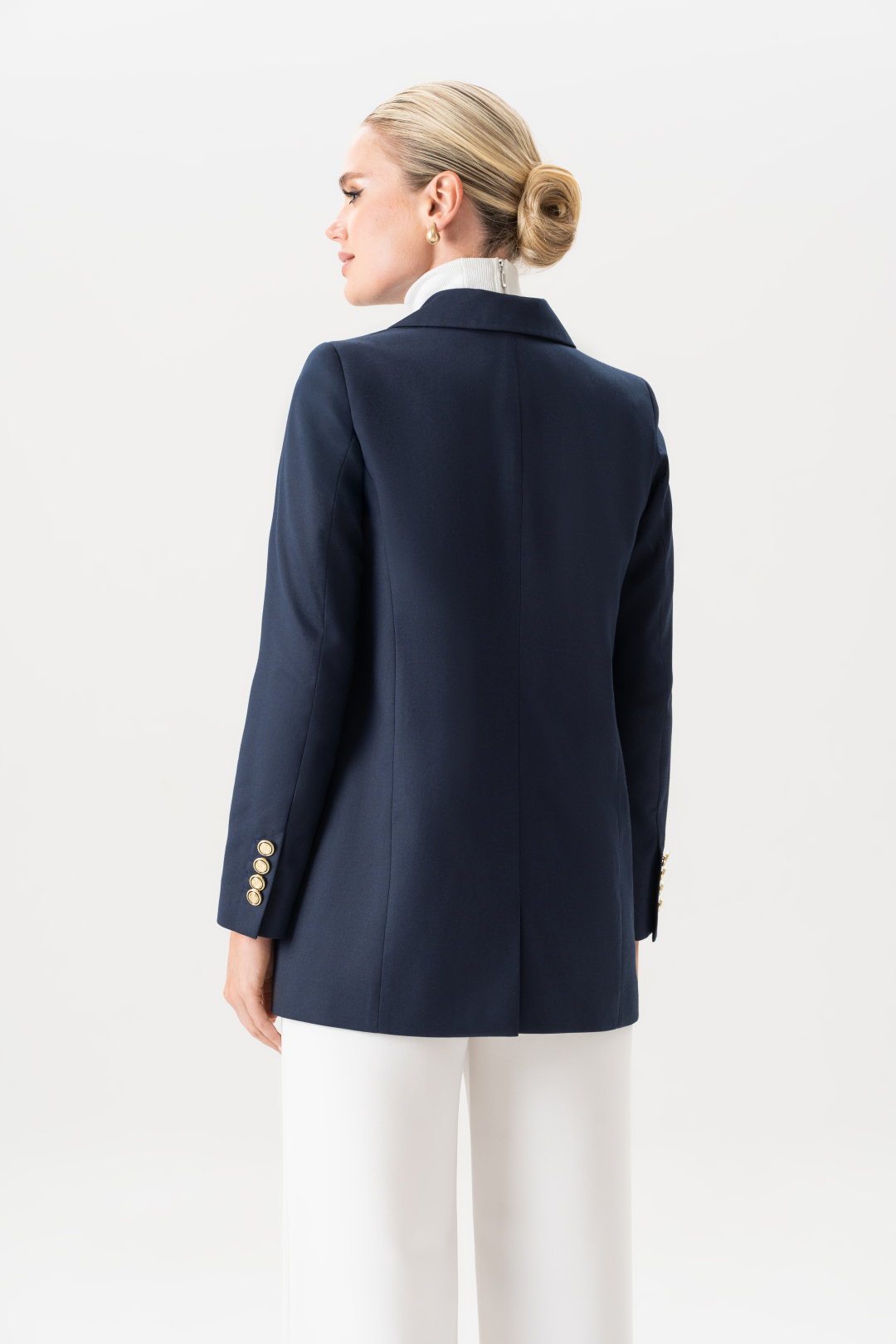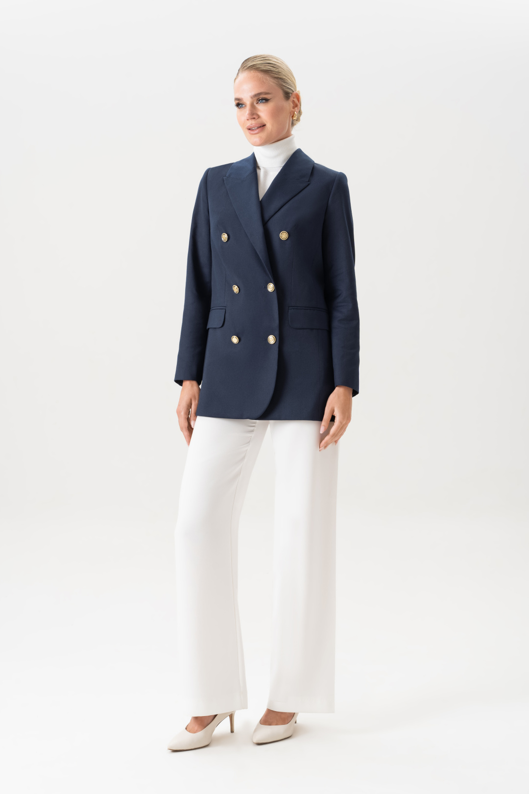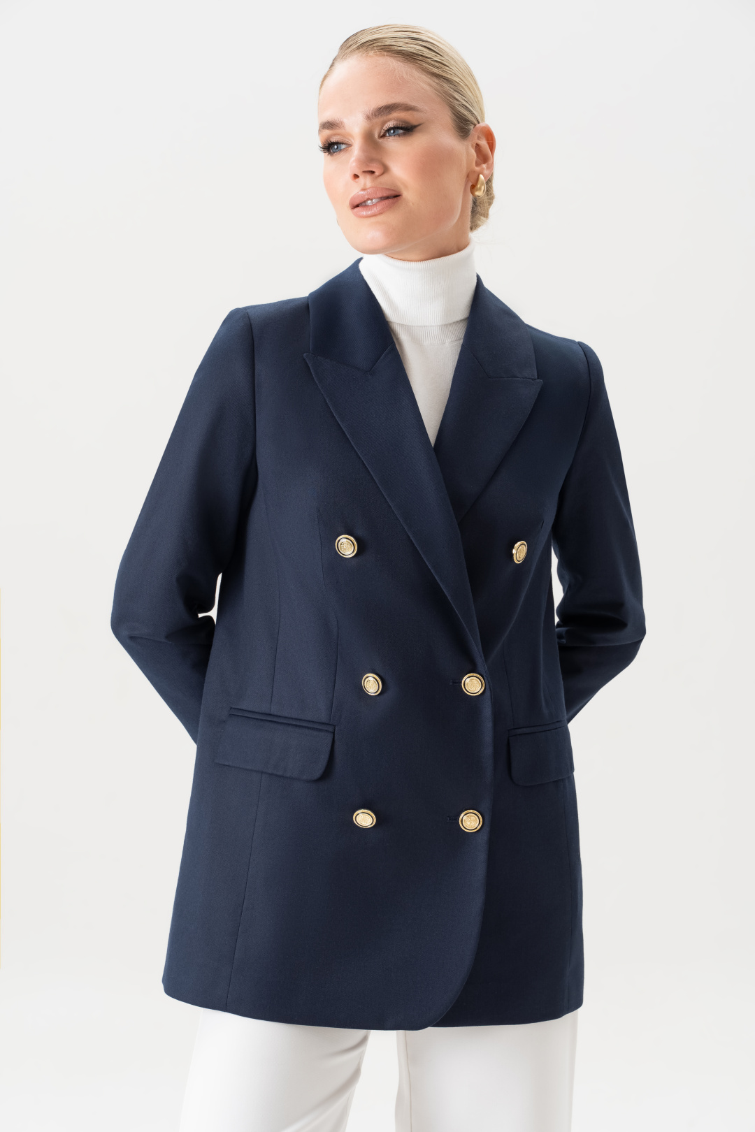 Пиджак женский удлиненный приталенный синий URS – это воплощение элегантности, стиля и практичности в одном изделии. Современные модные тенденции снова обращаются к классике, и именно поэтому женский жакет, особенно удлинённого кроя, стал настоящим must-have в гардеробе каждой женщины. Модель подчеркивает фигуру, выглядит дорого и изысканно, подходит для разных случаев – от деловых встреч до вечерних выходов. Жакет женский, свободного полуприлегающего силуэта, выполнен из костюмной ткани, на притачной подкладке, с двубортной застежкой на 2 петли и 6 декоративных пуговиц (размер и цвет фурнитуры может незначительно отличаться от фото), для повседневной носки.