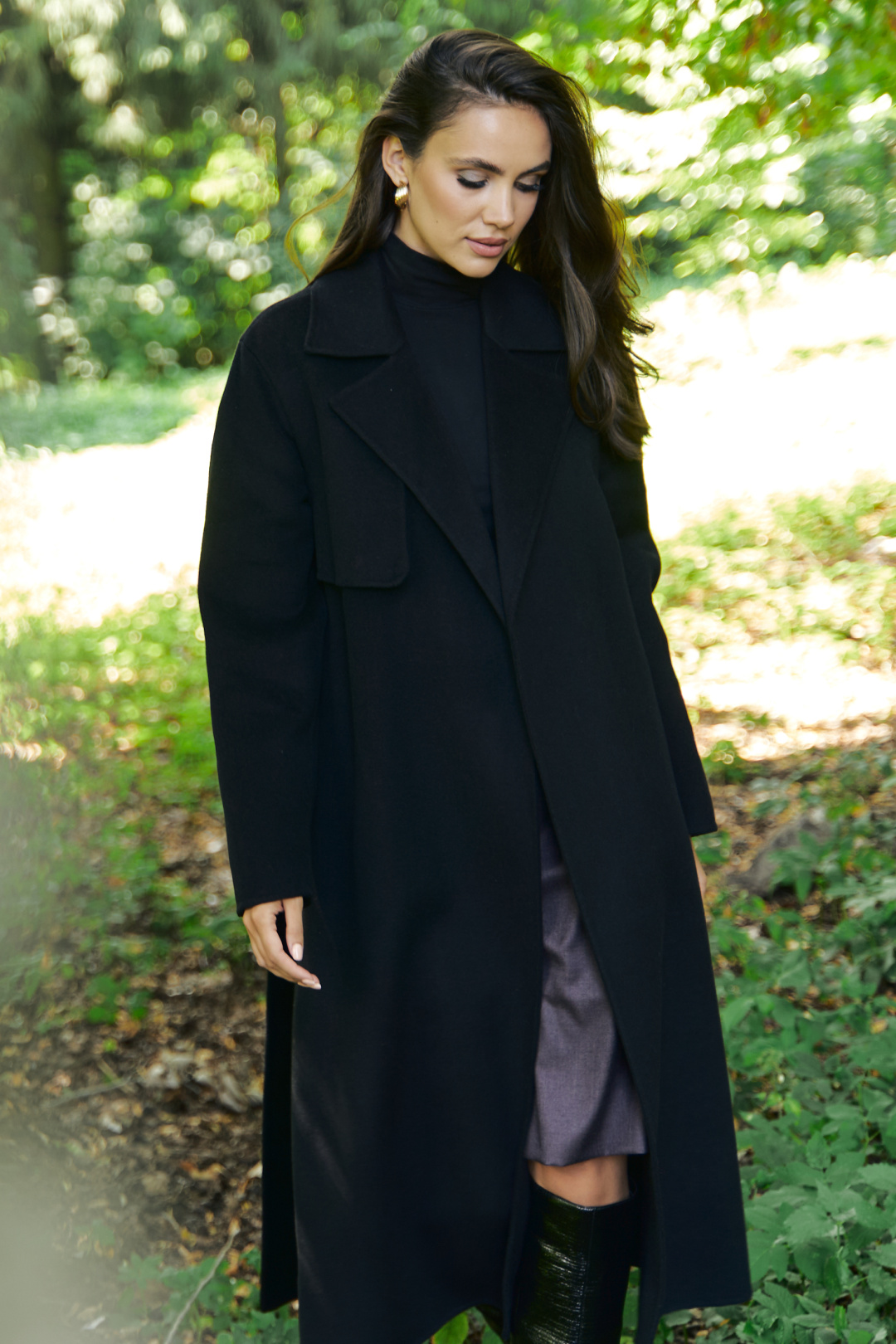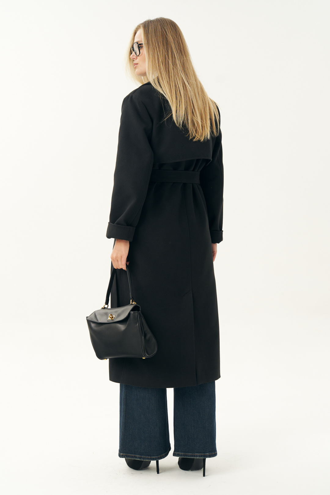 Правая часть переда с отлетной кокеткой. Спинка со средним швом, шлицей и с отлетной кокеткой. Боковые швы с карманами и с настрочными шлевками по линии талии. Горловина оформлена широким воротником пиджачного типа. Правый борт переда с потайной суппатной застежкой на 3 петли. Рукава втачные, двухшовные, с широким припуском подгиба низа, позволяющим завернуть низ рукава наверх как отложную манжету. Средняя длина пальто по среднему шву спинки - 124,0 см (±2,0 см);