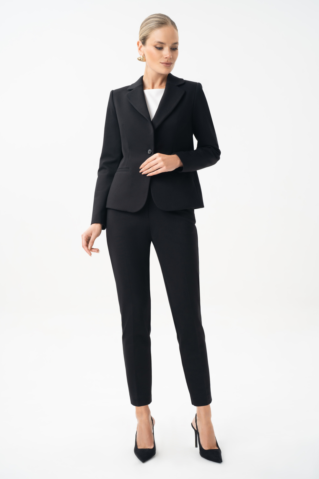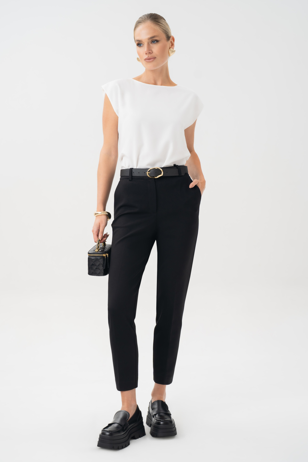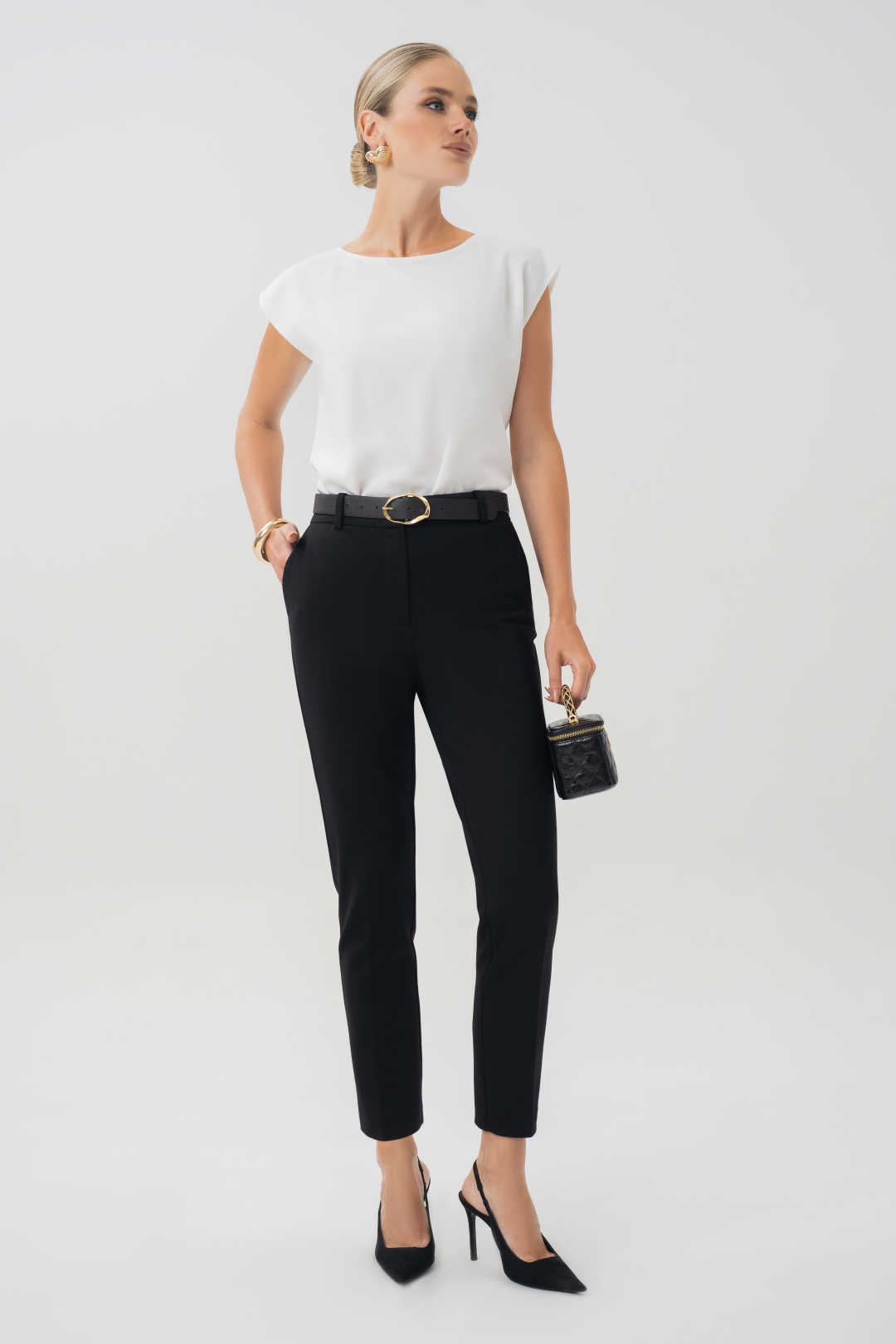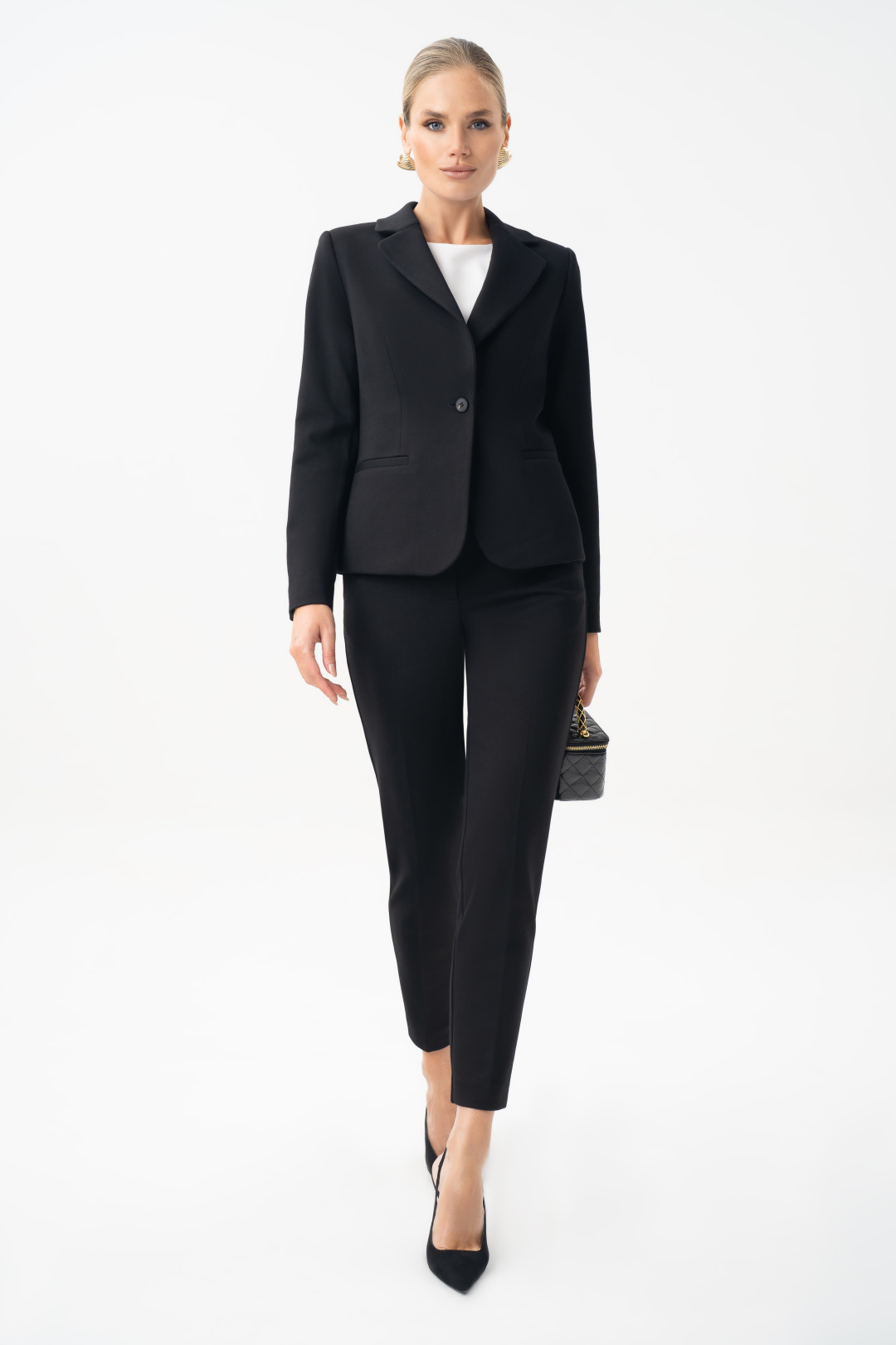 Брюки женские классические всегда остаются актуальными вне зависимости от модных тенденций. Брюки прекрасно комбинируется с блузой 24-425-1 и являются комплектом к жакету 25-641-1. Брюки женские, выполнены из трикотажного полотна, зауженные к низу, на обтачном поясе, с 5-ю шлевками, с застежкой на тесьму - «молнию», расположенную в среднем шве передних половинок. Пояс застегивается спереди на пришивной крючок, 1 петлю и потайную пуговицу. Передние половинки брюк с боковыми наклонными карманами, с заутюженными стрелками. Задние половинки с вытачками, с заутюженными стрелками. Левая задняя половинка с функциональным прорезным карманом с листочкой.