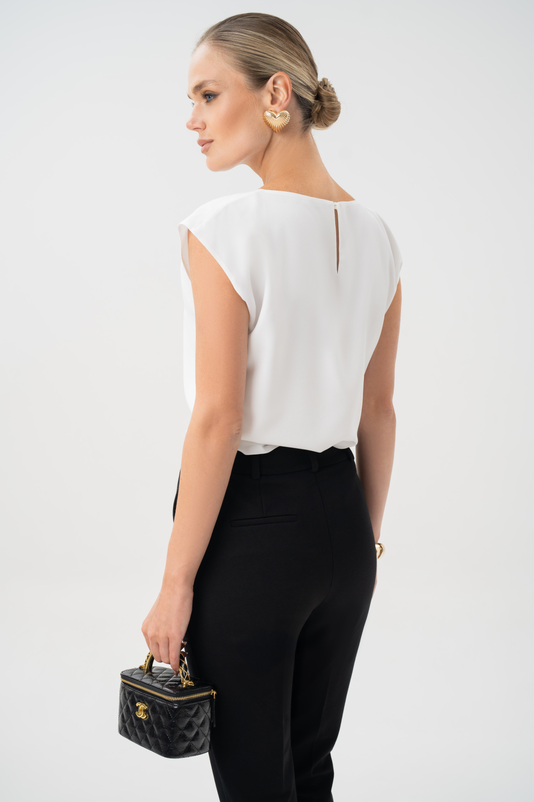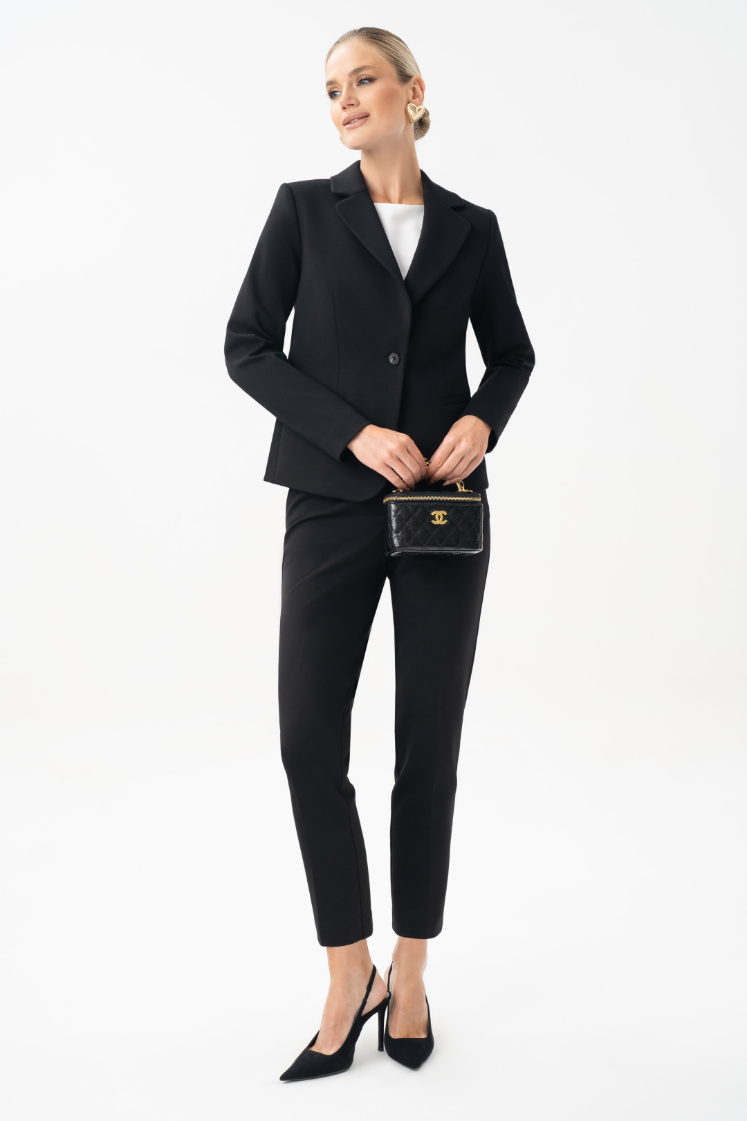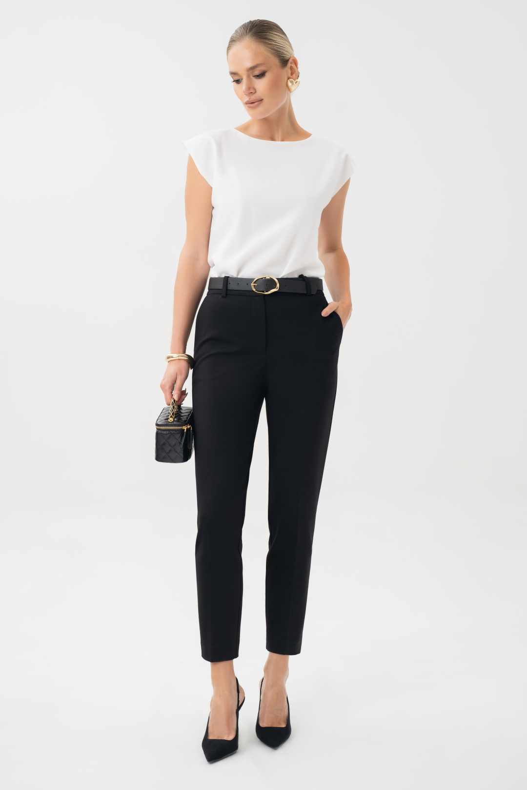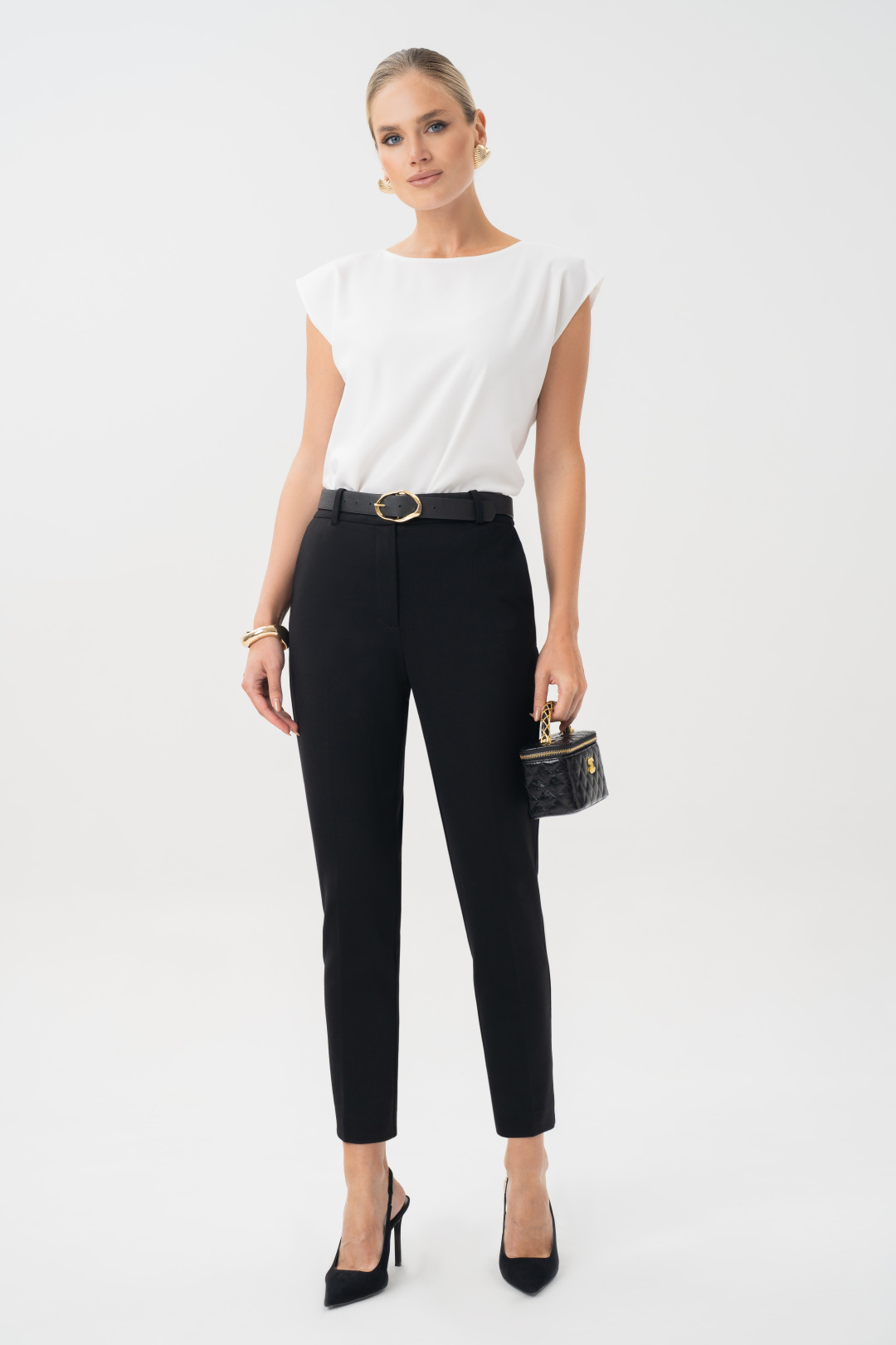 Брюки женские классические всегда остаются актуальными вне зависимости от модных тенденций. Брюки прекрасно комбинируется с блузой 24-425-1 и являются комплектом к жакету 25-641-1. Брюки женские, выполнены из трикотажного полотна, зауженные к низу, на обтачном поясе, с 5-ю шлевками, с застежкой на тесьму - «молнию», расположенную в среднем шве передних половинок. Пояс застегивается спереди на пришивной крючок, 1 петлю и потайную пуговицу. Передние половинки брюк с боковыми наклонными карманами, с заутюженными стрелками. Задние половинки с вытачками, с заутюженными стрелками. Левая задняя половинка с функциональным прорезным карманом с листочкой.