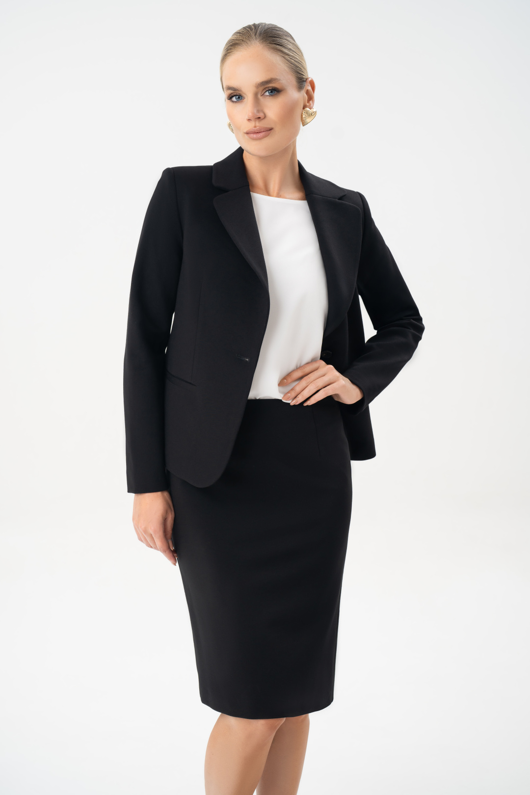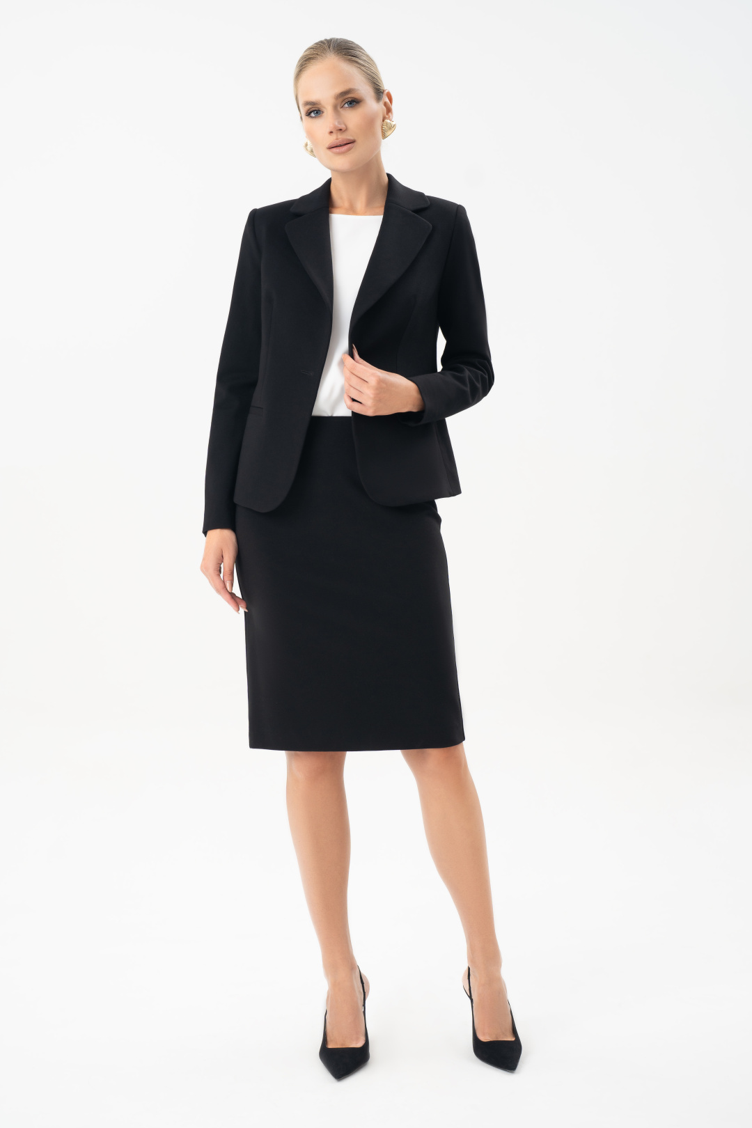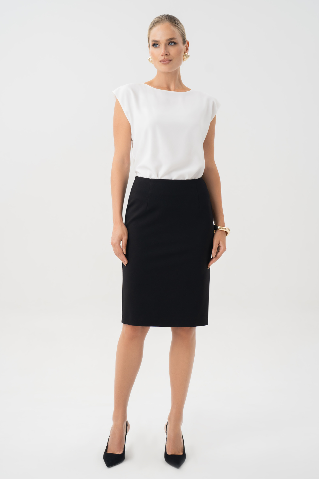 Юбка женская черная URS – это классический элемент базового гардероба, который остается актуальным в любое время года. Юбка прекрасно комбинируется с блузой 24-425-1 и является комплектом к жакету 25-641-1. Юбка женская, зауженная к низу, с посадкой на талии, выполнена из трикотажного полотна, на отлетной по низу подкладке. Юбка предназначена для повседневной носки.