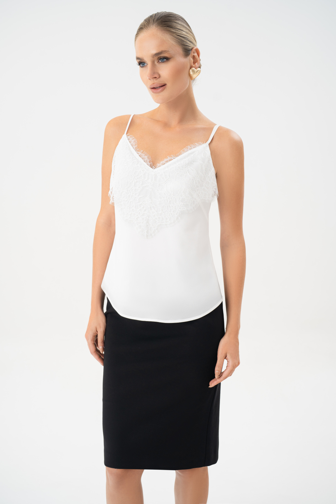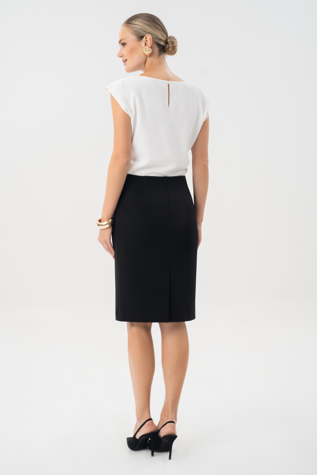 Переднее полотнище с талиевыми вытачками. Заднее полотнище с талиевыми витачками и средним швом, в верхней части с застежкой на потайную тесьму-молнию, в нижней – со шлицей. Средняя длина юбки по боковому шву заднего полотнища 63,0см (±3,0 см). Тип ткани: трикотажное полотно.