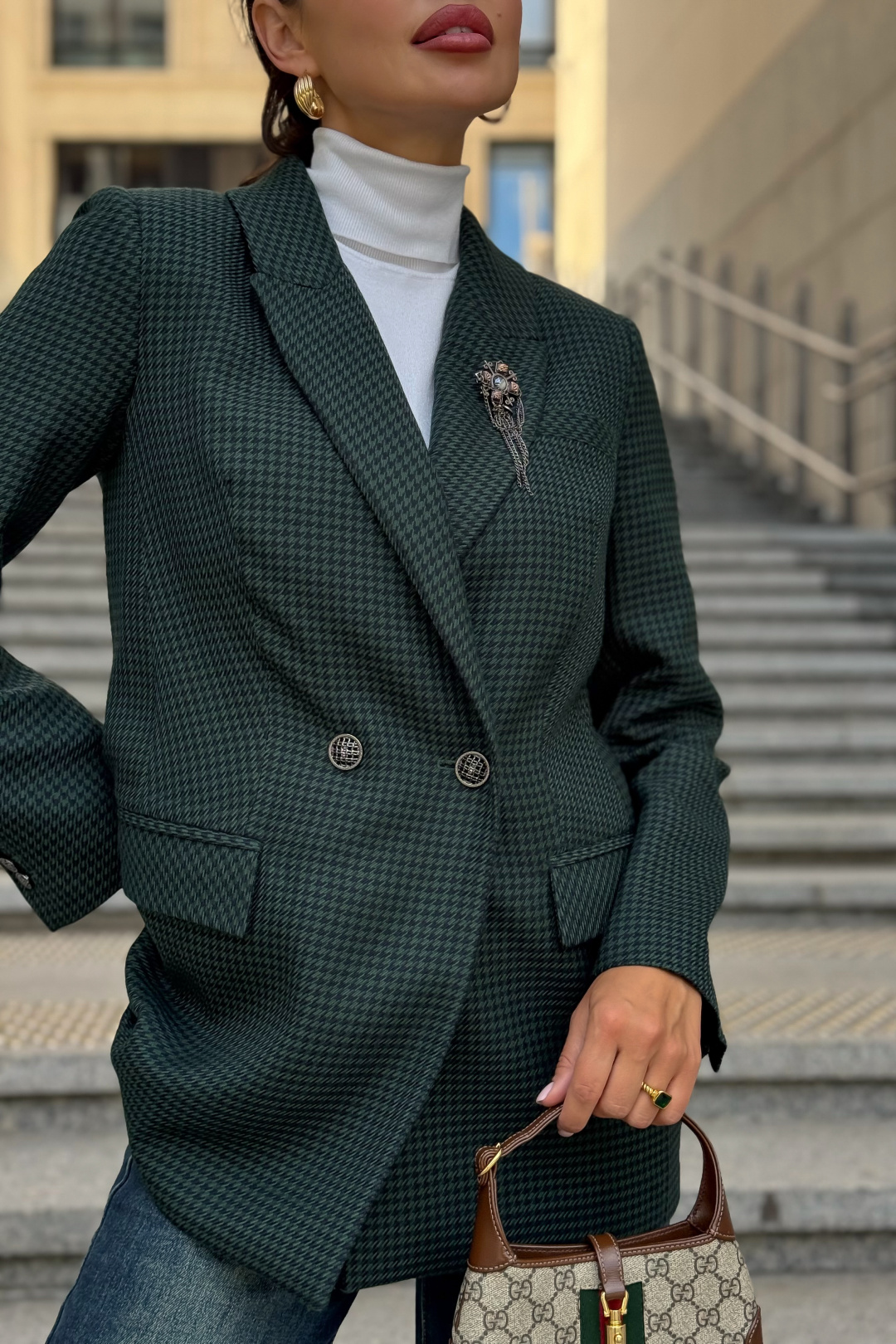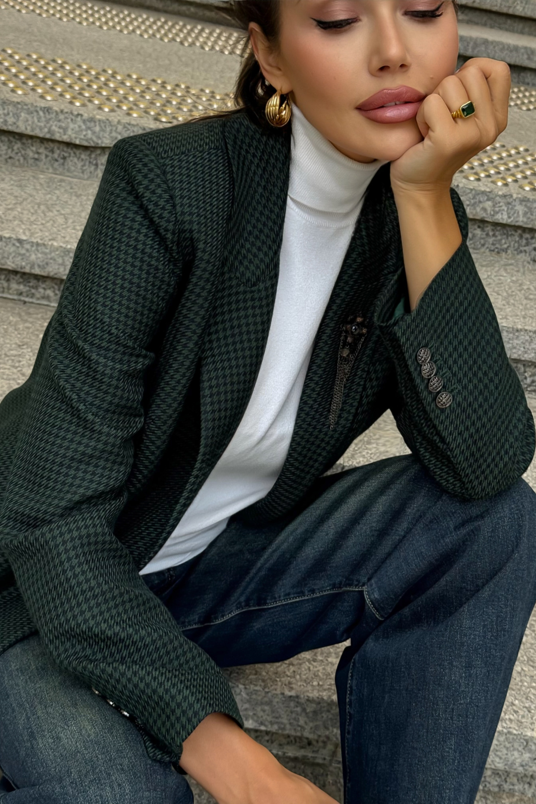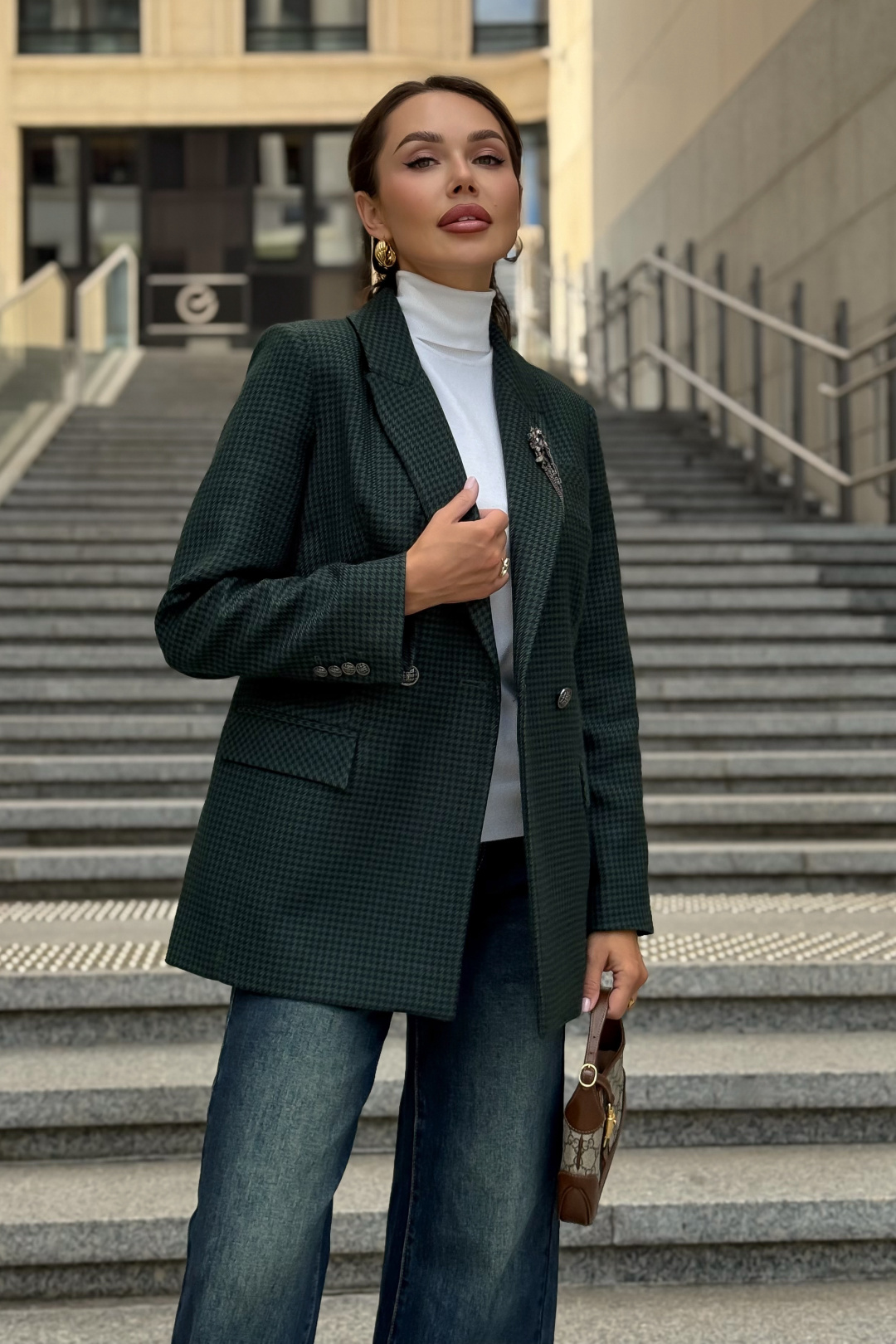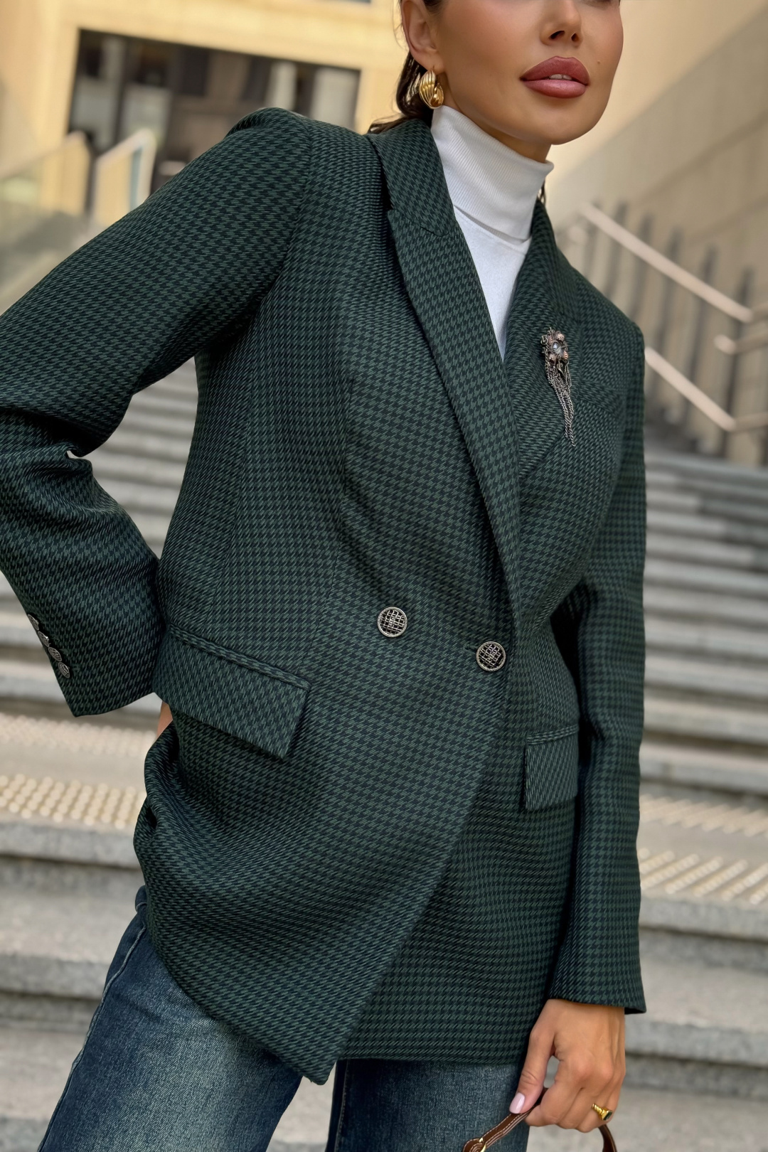 Жакет URS в принт «гусиная лапка» — это элегантный выбор для женщин, которые ценят классику и современный стиль. Легендарный узор в сочетании с тёмно-зелёным оттенком делает модель универсальной: она идеально подходит как для офиса, так и для повседневных образов. Жакет женский, полуприлегающего силуэта, выполнен из костюмной ткани, на подкладке, с двубортной застежкой на 2 петли и пуговицы (размер и цвет фурнитуры может незначительно отличаться от фото), для повседневной носки.Перед и спинка с отрезным бочком. Перед в нижних частях с прорезными карманами с клапаном и обтачками, с талиевыми вытачками, идущими от карманов вверх. Верхняя левая часть переда с функциональным карманом с листочкой.