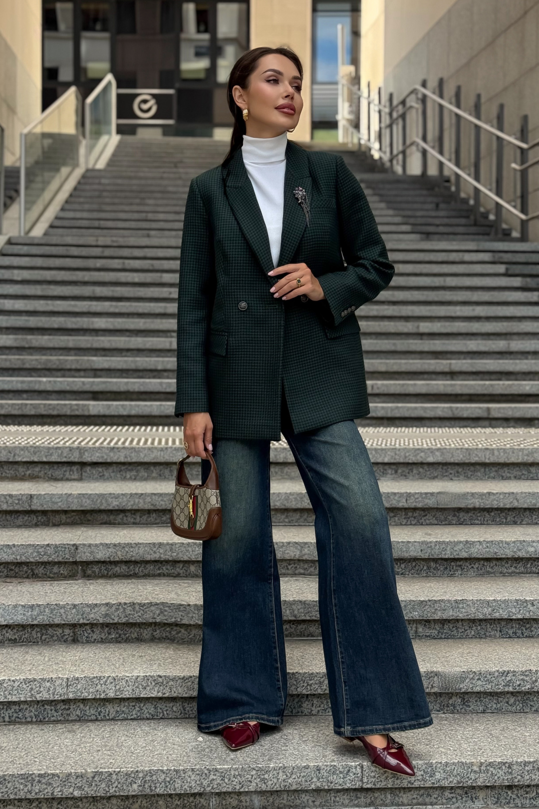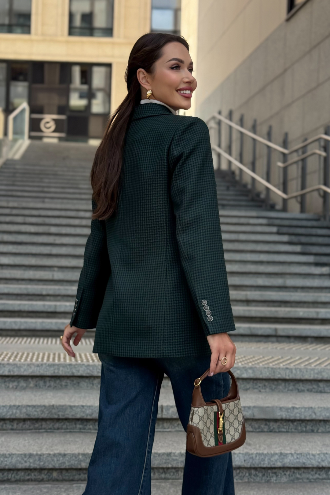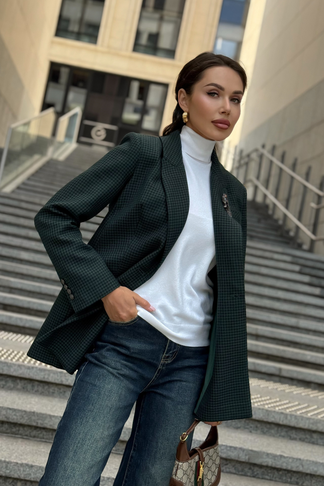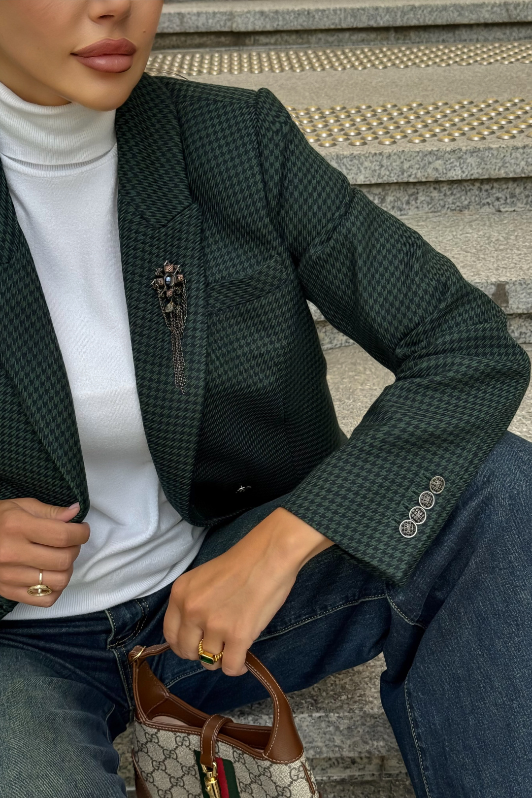Жакет URS в принт «гусиная лапка» — это элегантный выбор для женщин, которые ценят классику и современный стиль. Легендарный узор в сочетании с тёмно-зелёным оттенком делает модель универсальной: она идеально подходит как для офиса, так и для повседневных образов. Жакет женский, полуприлегающего силуэта, выполнен из костюмной ткани, на подкладке, с двубортной застежкой на 2 петли и пуговицы (размер и цвет фурнитуры может незначительно отличаться от фото), для повседневной носки.Перед и спинка с отрезным бочком. Перед в нижних частях с прорезными карманами с клапаном и обтачками, с талиевыми вытачками, идущими от карманов вверх. Верхняя левая часть переда с функциональным карманом с листочкой.