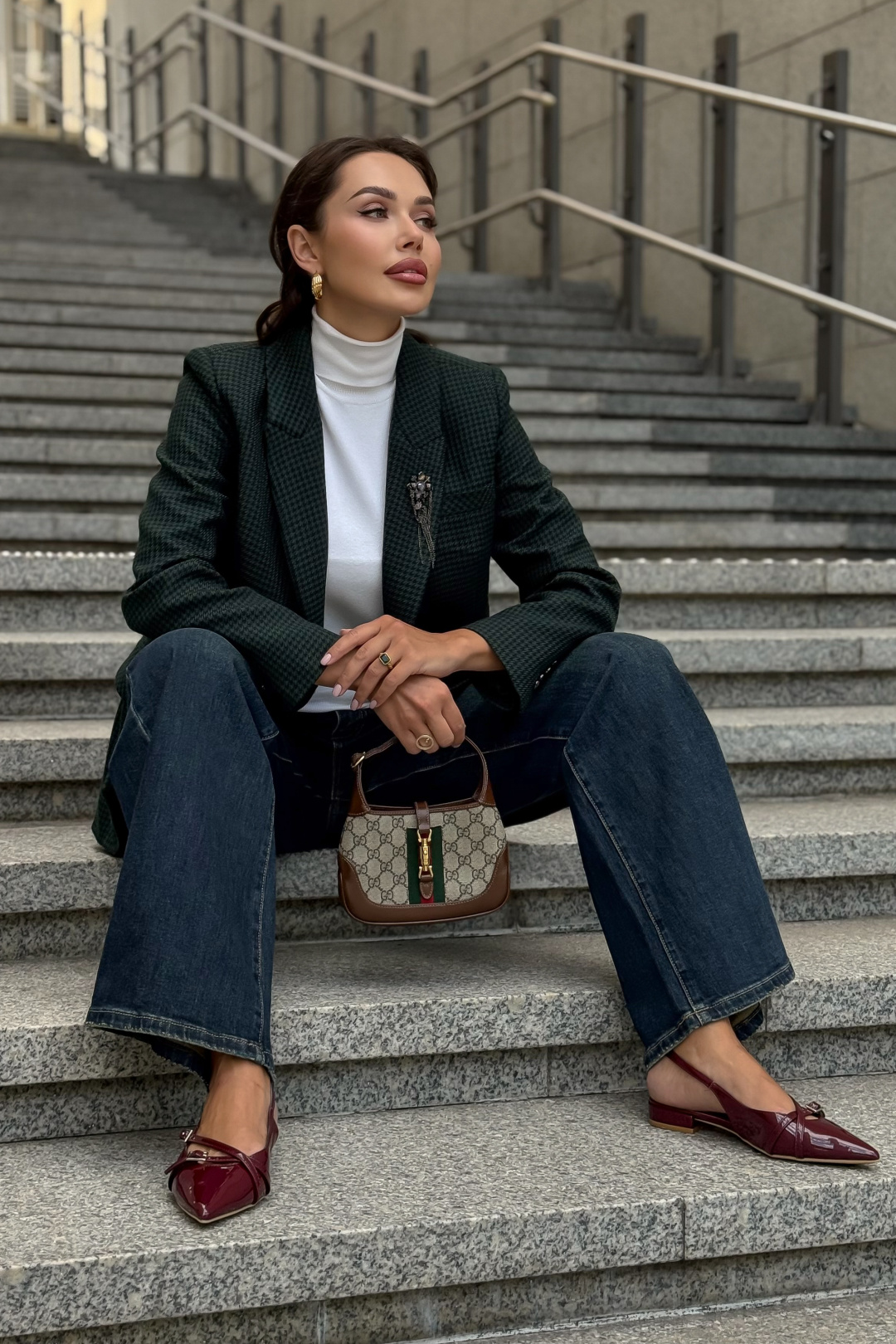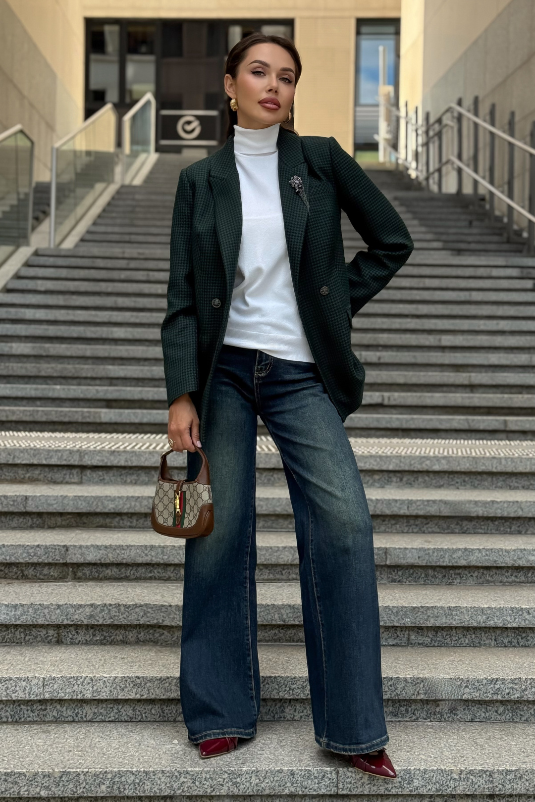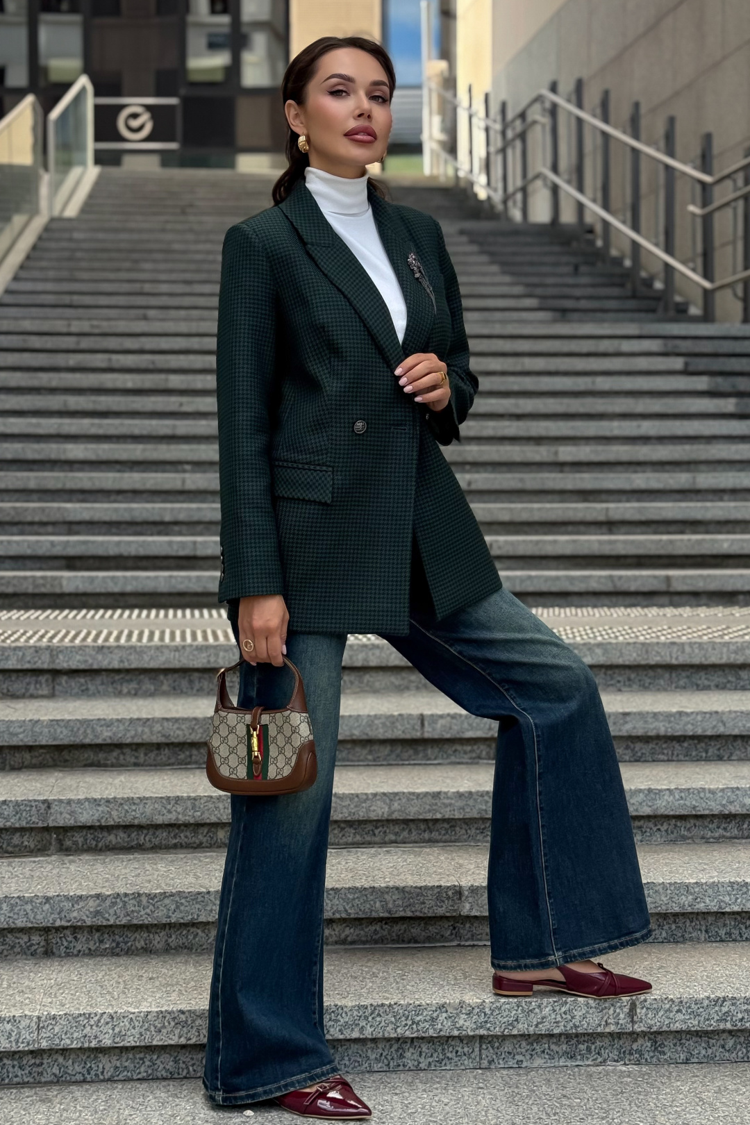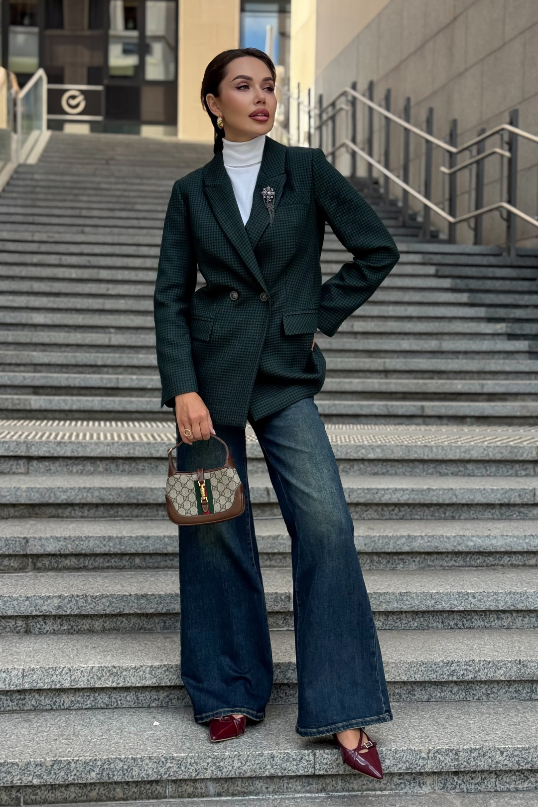 Жакет URS в принт «гусиная лапка» — это элегантный выбор для женщин, которые ценят классику и современный стиль. Легендарный узор в сочетании с тёмно-зелёным оттенком делает модель универсальной: она идеально подходит как для офиса, так и для повседневных образов. Жакет женский, полуприлегающего силуэта, выполнен из костюмной ткани, на подкладке, с двубортной застежкой на 2 петли и пуговицы (размер и цвет фурнитуры может незначительно отличаться от фото), для повседневной носки.Перед и спинка с отрезным бочком. Перед в нижних частях с прорезными карманами с клапаном и обтачками, с талиевыми вытачками, идущими от карманов вверх. Верхняя левая часть переда с функциональным карманом с листочкой.